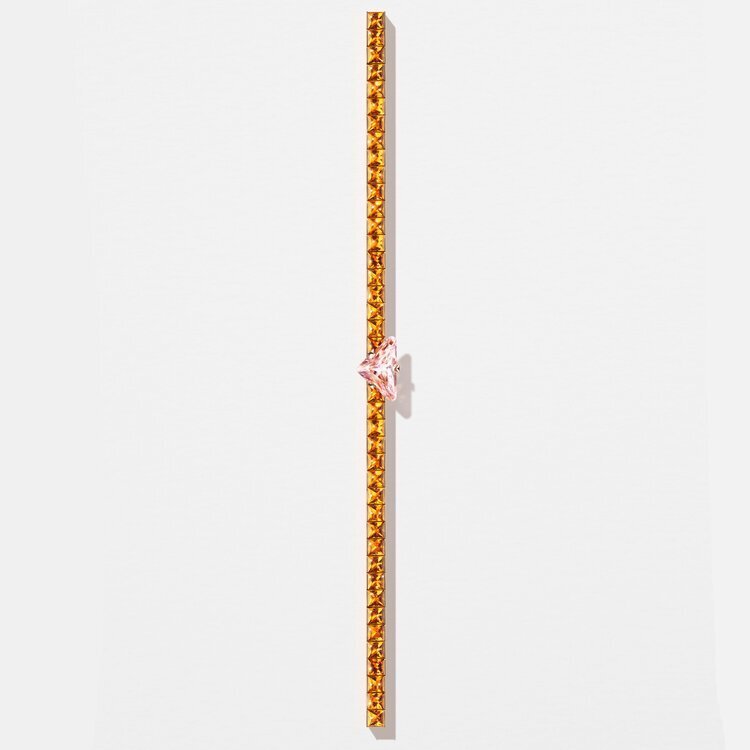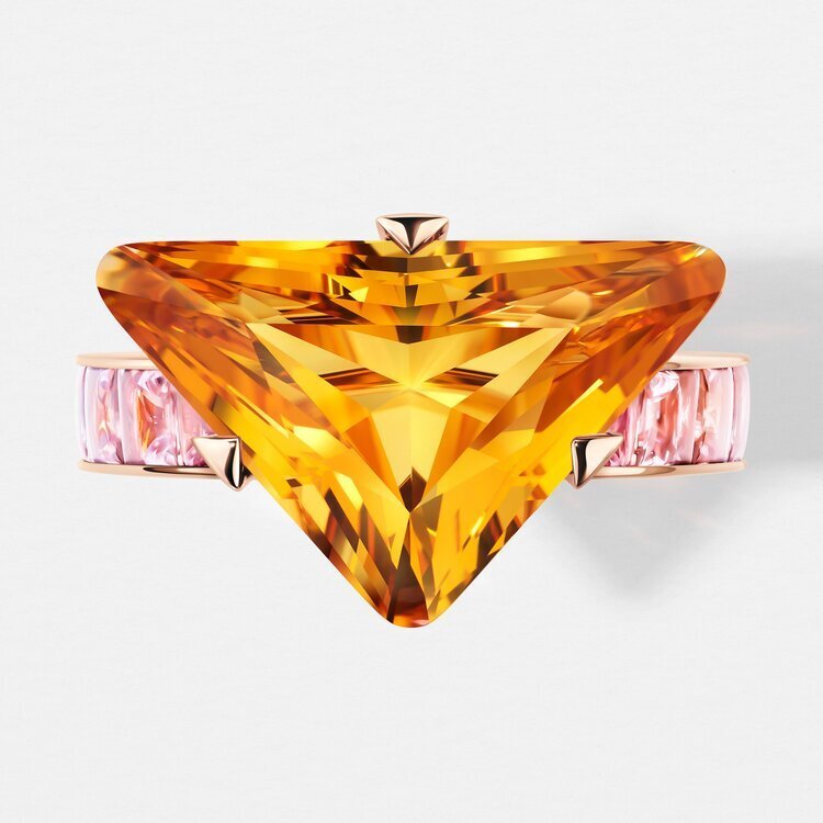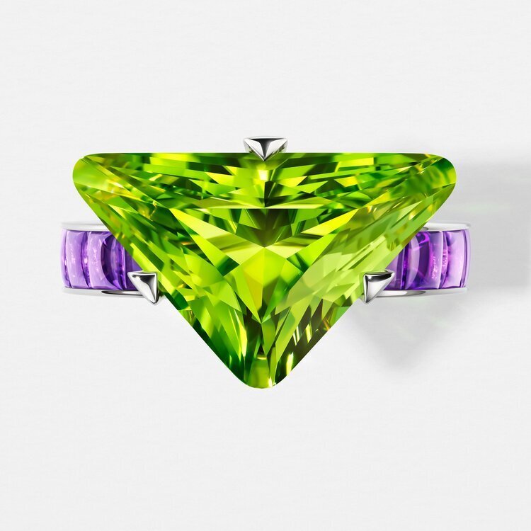 Jointly designed by Miuccia Prada and Raf Simons, co-creative directors of the brand, the “Couleur Vivante” collection centers on triangular-cut colored gemstones—a tribute to the iconic triangular logo first conceived by Mario Prada in 1913. The gemstones include amethyst, aquamarine, Madeira citrine, pink morganite, and golden-green peridot, forming a vivid and uplifting color palette.