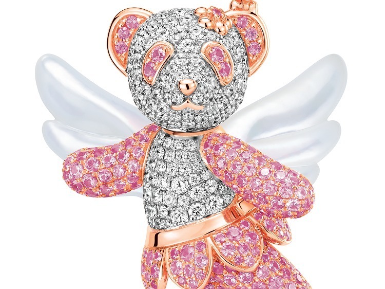 The new Fairy Bo Bo pendant is crafted in polished rose gold and white gold, replacing the panda’s natural black-and-white markings with round brilliant-cut diamonds and pink sapphires that shimmer with soft, romantic hues. Adorned with a floral headpiece and a petal-shaped tutu skirt, the design captures a delightful, feminine spirit.