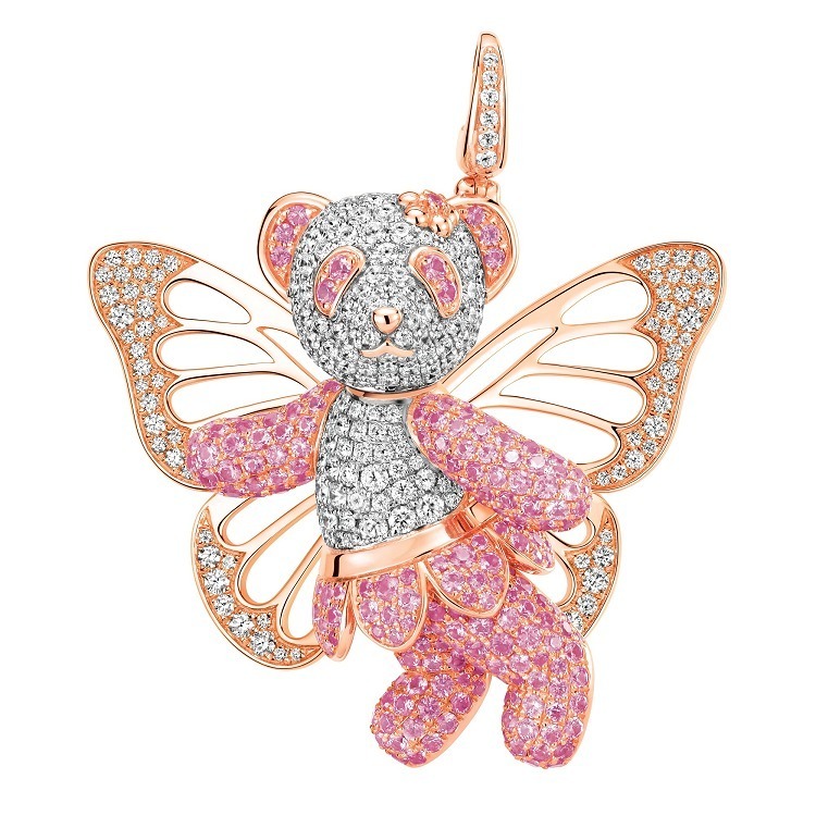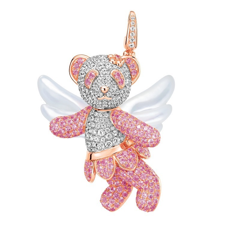 This Fairy Bo Bo pendant comes from the “Bo Bo” collection by high jewelry brand Qeelin. Creative Director Dennis Chan playfully combines two enchanting themes — the panda and the fairy — to create a whimsical, winged pink panda rendered in pink sapphires, radiating a sweet and dreamlike charm.