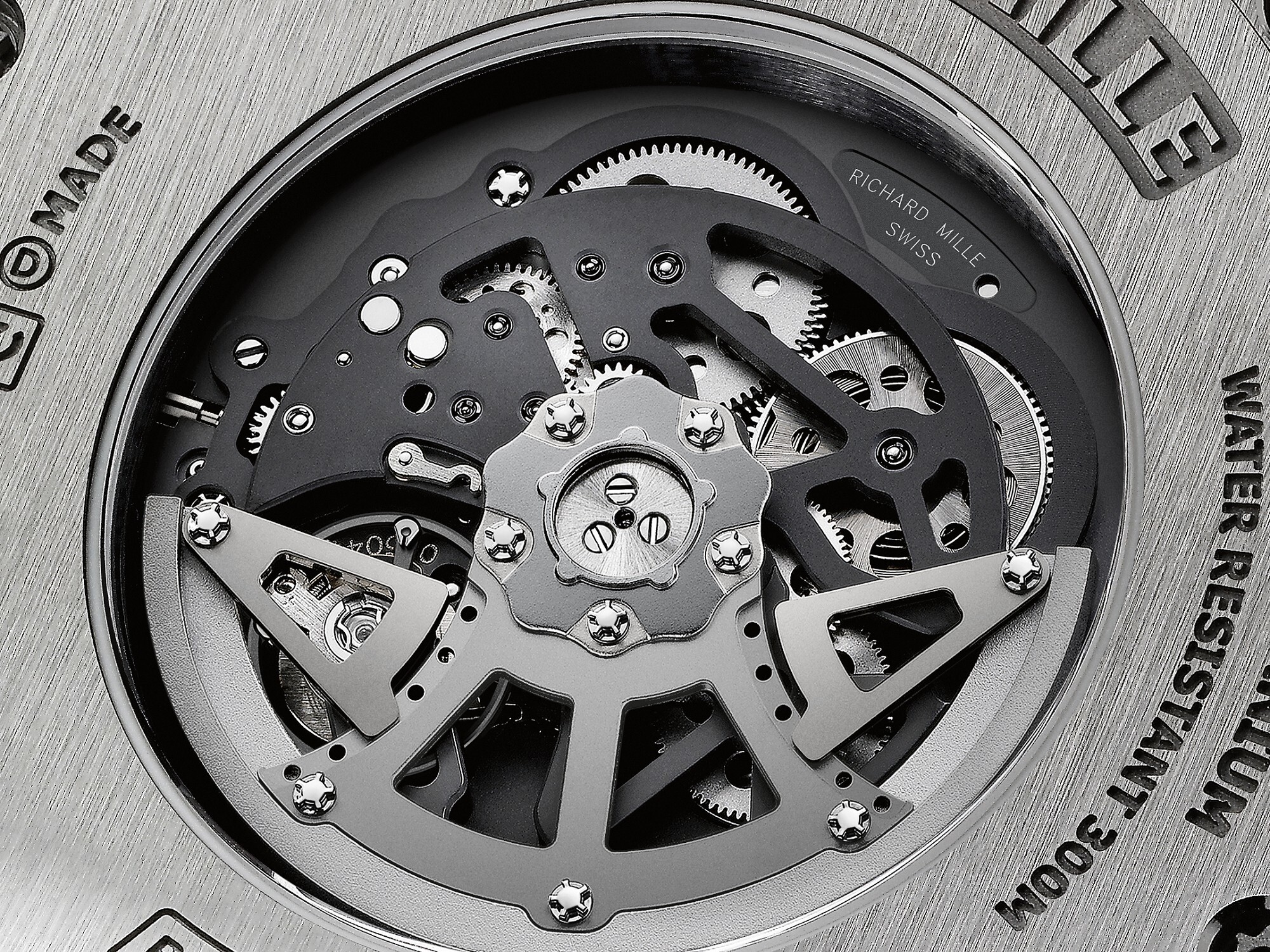 Inside beats the RMAC2 automatic winding movement, oscillating at 28,800 vph with a 50-hour power reserve. The movement is crafted from titanium, treated with black PVD coating, and features a variable-inertia balance wheel and a variable-geometry rotor, optimizing winding efficiency according to the wearer’s activity level.