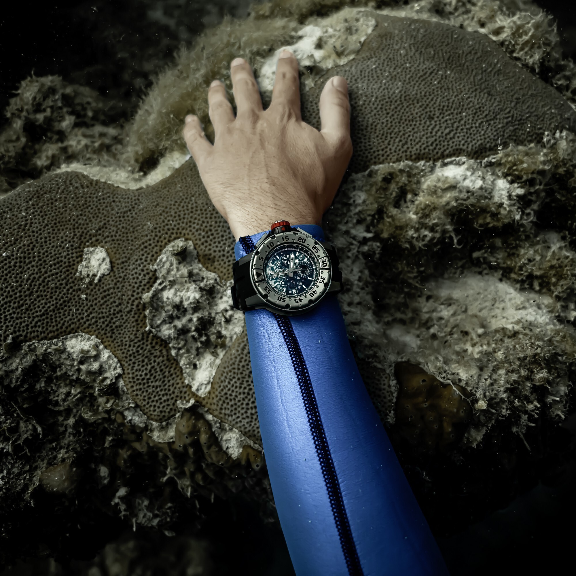 The case measures 50 mm in diameter and 17.8 mm thick, giving it a commanding wrist presence that suits underwater conditions where visibility and operability are essential. Thanks to the use of Grade 5 titanium, the watch remains lightweight and comfortable despite its size. The three-part bezel is secured with 22 screws, and rotation requires simultaneously pressing the buttons at 12 and 6 o’clock, a safety feature that prevents accidental adjustment underwater.