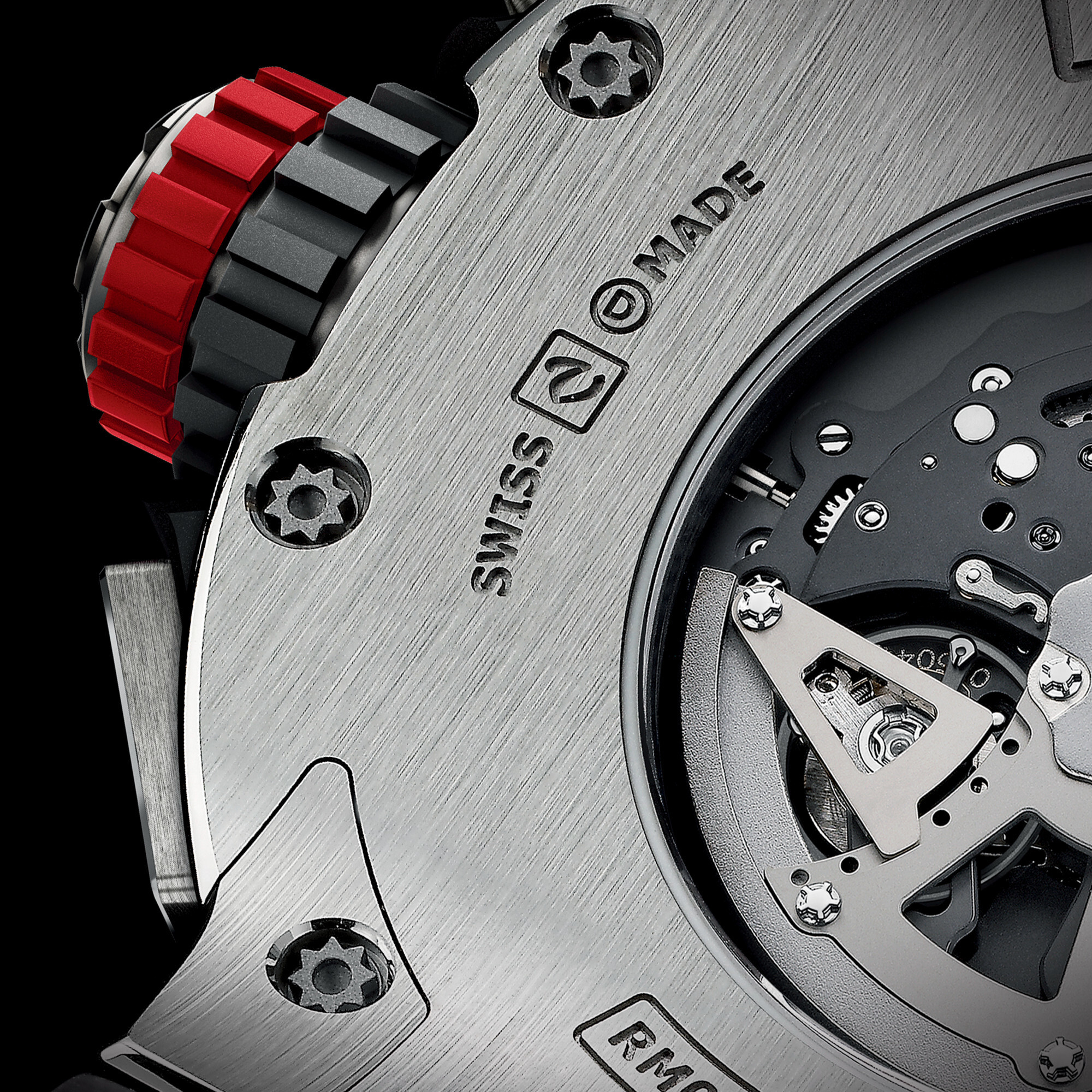 Inside beats the RMAC2 automatic winding movement, oscillating at 28,800 vph with a 50-hour power reserve. The movement is crafted from titanium, treated with black PVD coating, and features a variable-inertia balance wheel and a variable-geometry rotor, optimizing winding efficiency according to the wearer’s activity level.