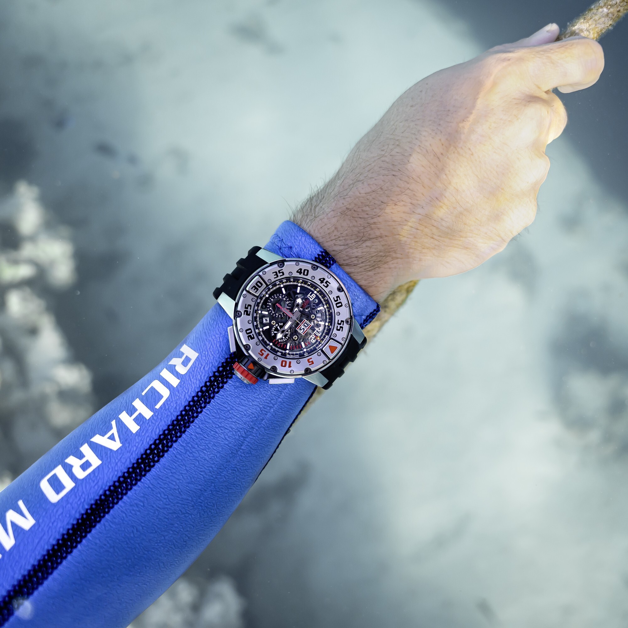 The RM 032 worn by Arnaud Jerald is one of the most complex diver’s watches ever created by RICHARD MILLE, featuring an annual calendar, chronograph, and flyback function. It represents a perfect blend of design, comfort, efficiency, performance, and safety, ensuring reliable operation even at depths of 300 meters.