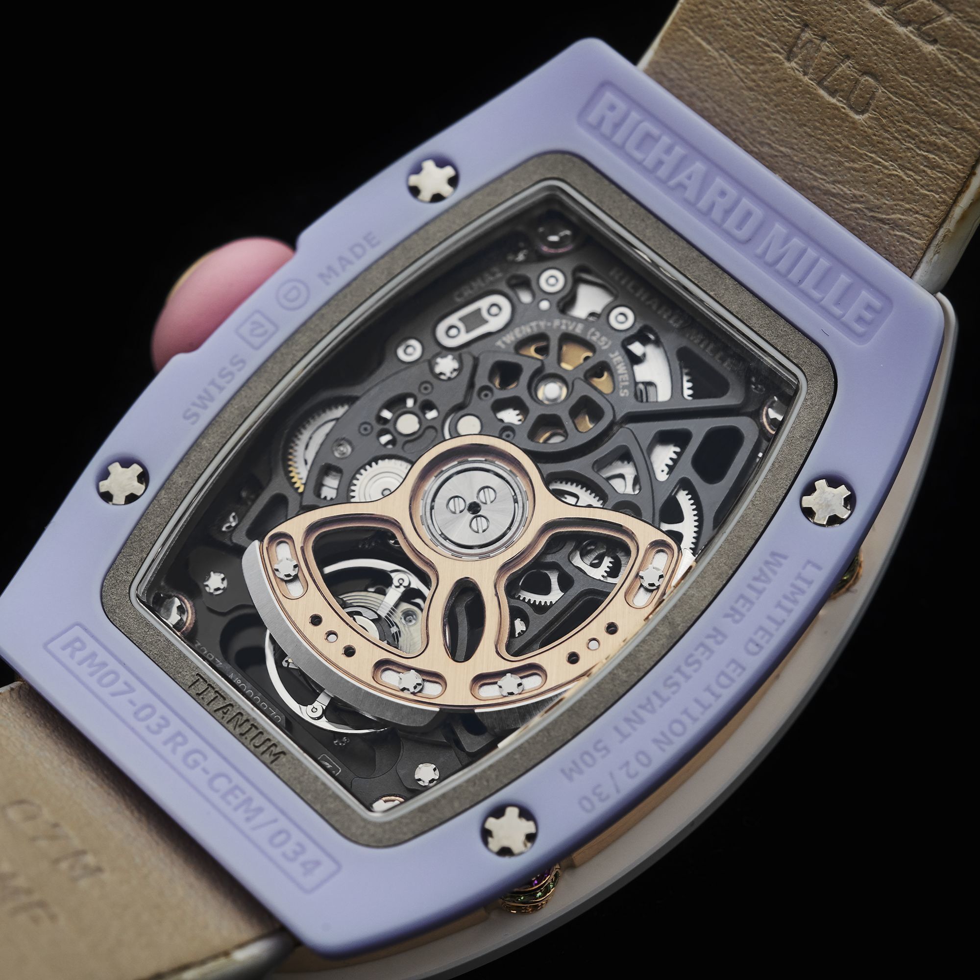 Case: White and lavender ceramic with 18K rose gold mid-cas, Dimensions: 45.32 x 32.30 x 11.93 mm, Crystal: Sapphire front and back,Dial: Hand-enameled titanium dial, Movement: RICHARD MILLE Caliber CRMA2, automatic winding,Jewels: 25, Frequency: 28,800 vibrations/hour, Power Reserve: 50 hours, Strap: Rubber,Water Resistance: 50 meters,Limited Edition: 30 pieces.