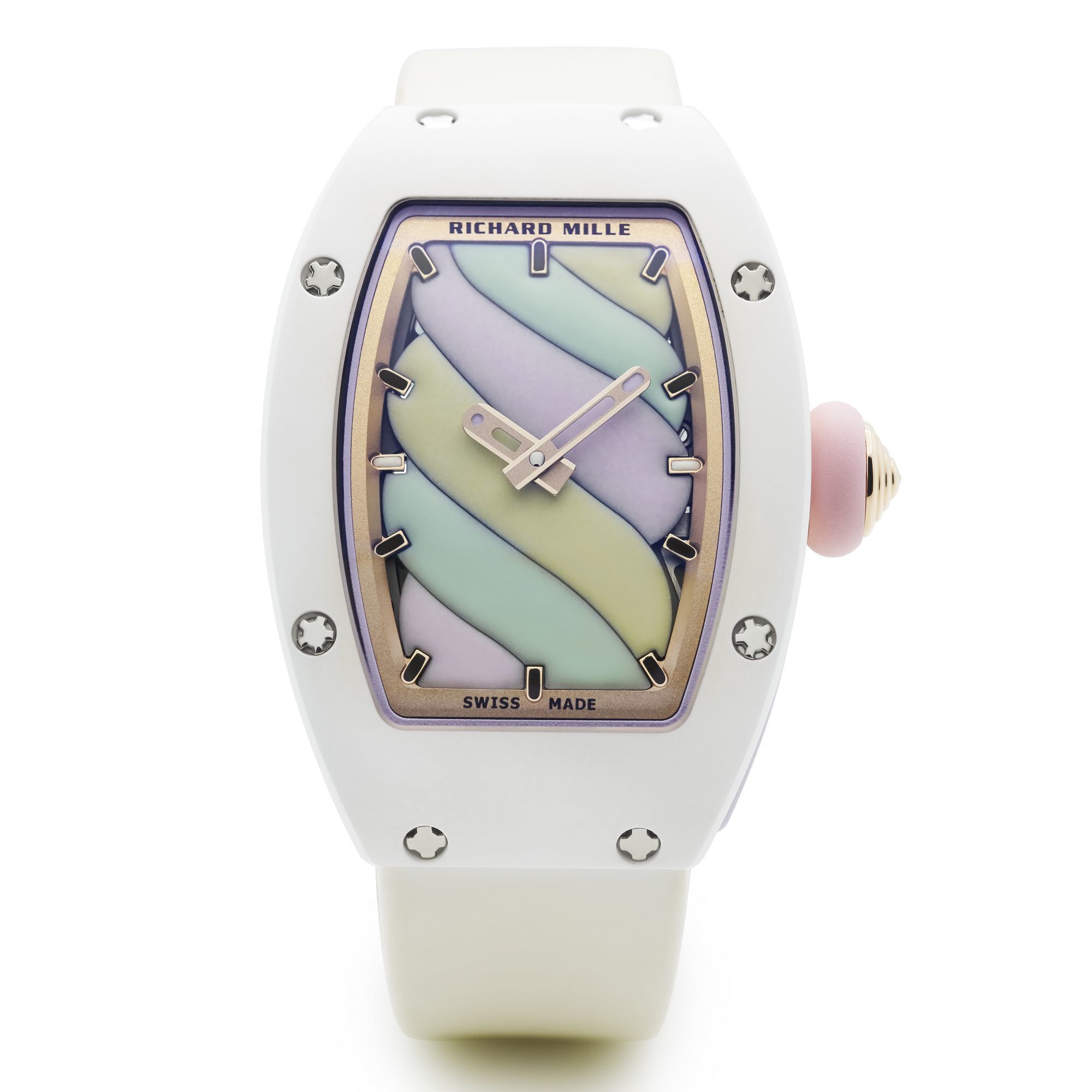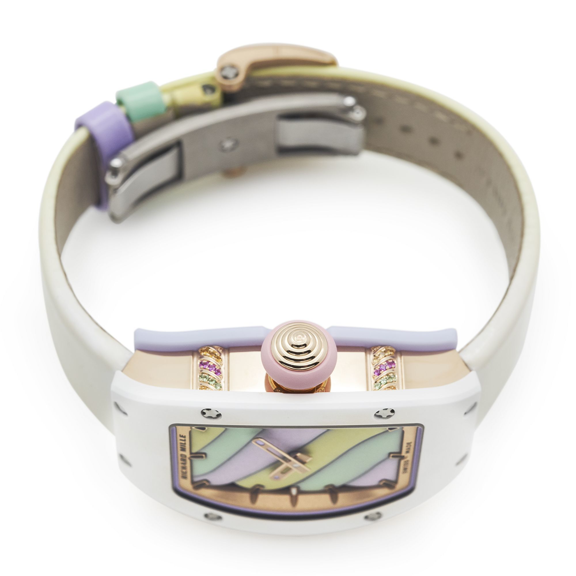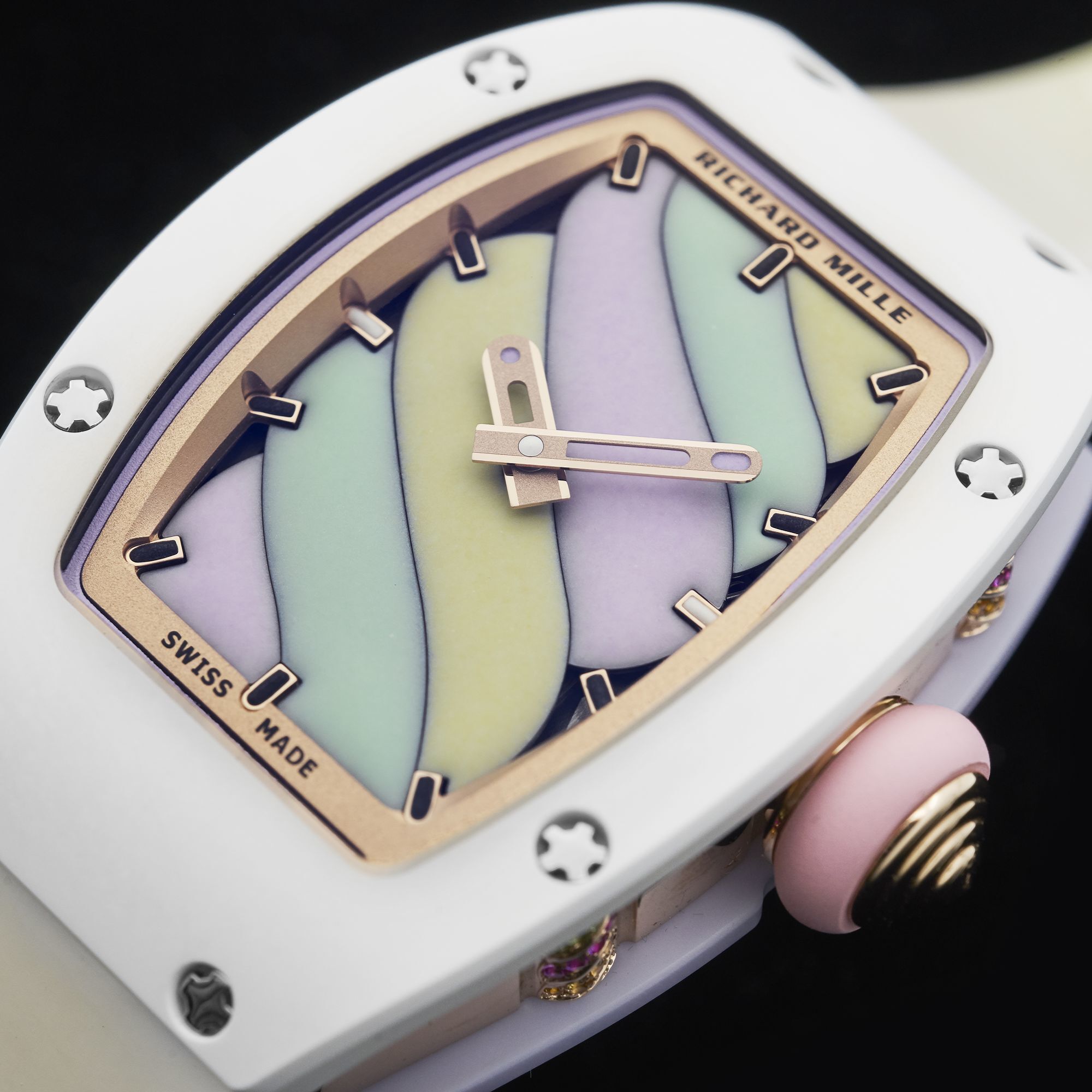 The dial is crafted from six miniature enamel plaques, each representing a swirl of pastel-colored candy in light yellow, mint green, and lavender, symbolizing three different “flavors.” Every plaque is hand-painted by RICHARD MILLE’s artisans with a specially formulated enamel, then fired at 800°C to create a soft, velvety texture that makes the hard enamel appear almost pliant. The rounded tips of the central hands further echo the watch’s gentle, playful design language.