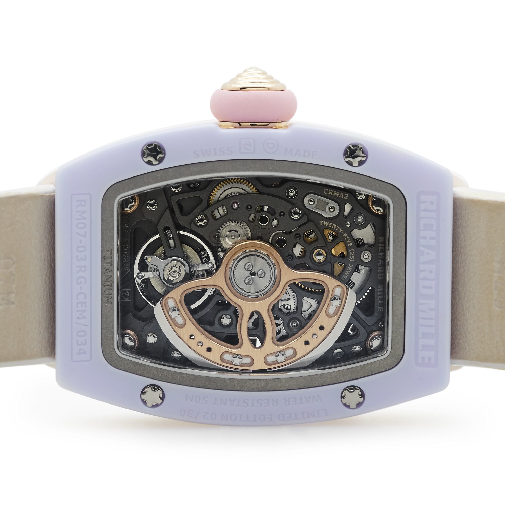 Case: White and lavender ceramic with 18K rose gold mid-cas, Dimensions: 45.32 x 32.30 x 11.93 mm, Crystal: Sapphire front and back,Dial: Hand-enameled titanium dial, Movement: RICHARD MILLE Caliber CRMA2, automatic winding,Jewels: 25, Frequency: 28,800 vibrations/hour, Power Reserve: 50 hours, Strap: Rubber,Water Resistance: 50 meters,Limited Edition: 30 pieces.