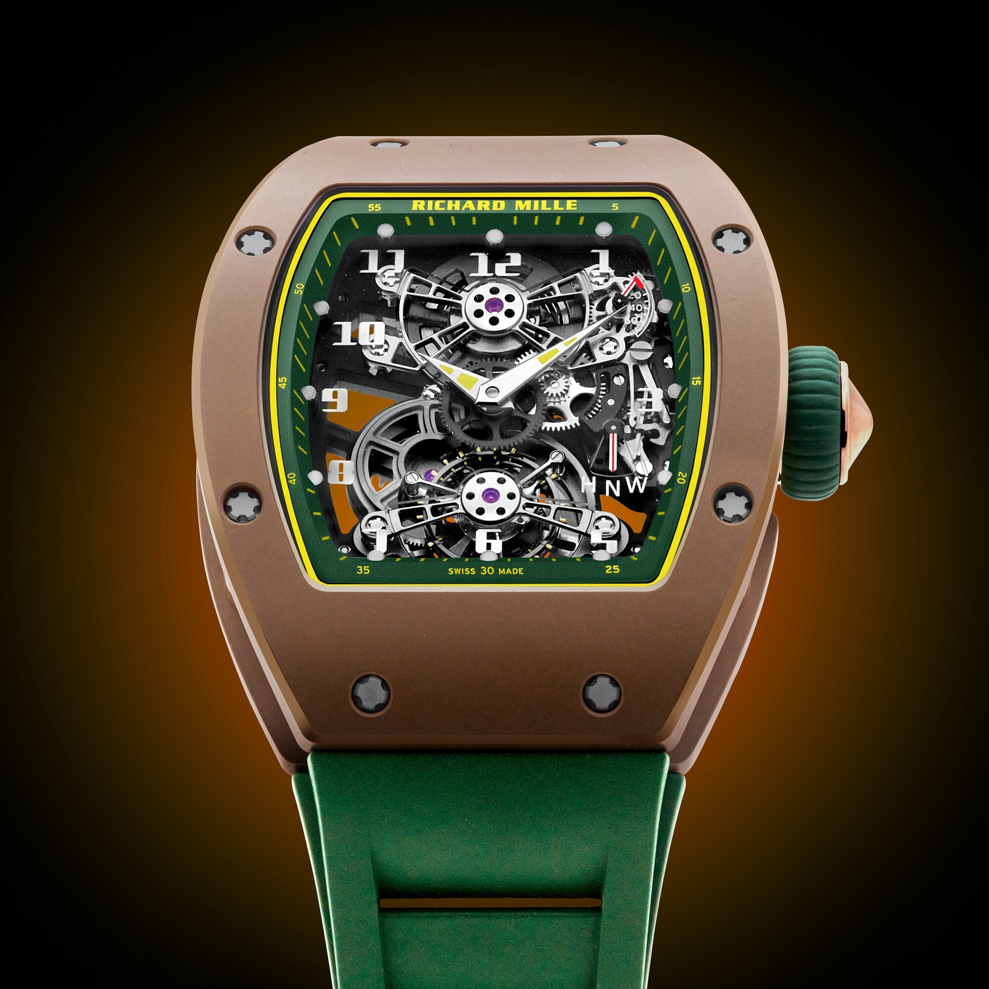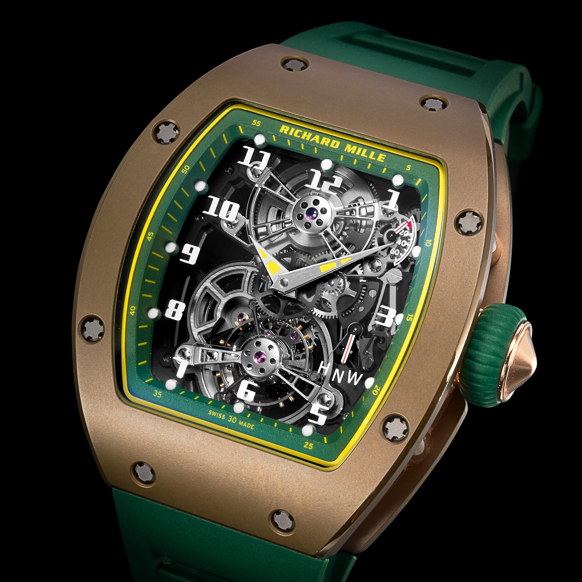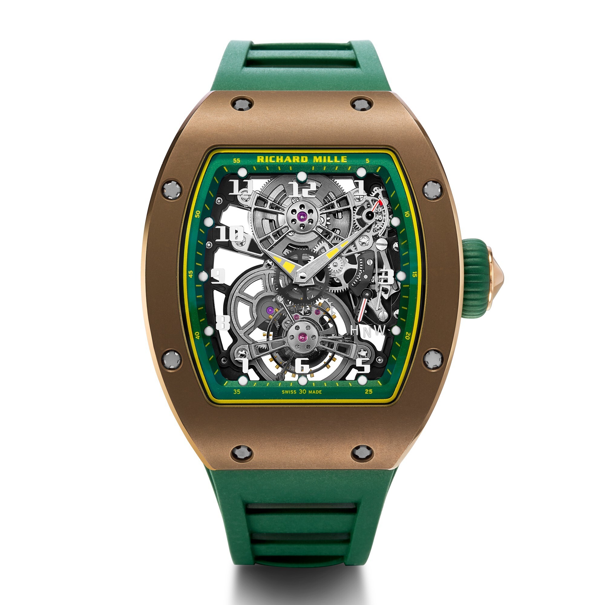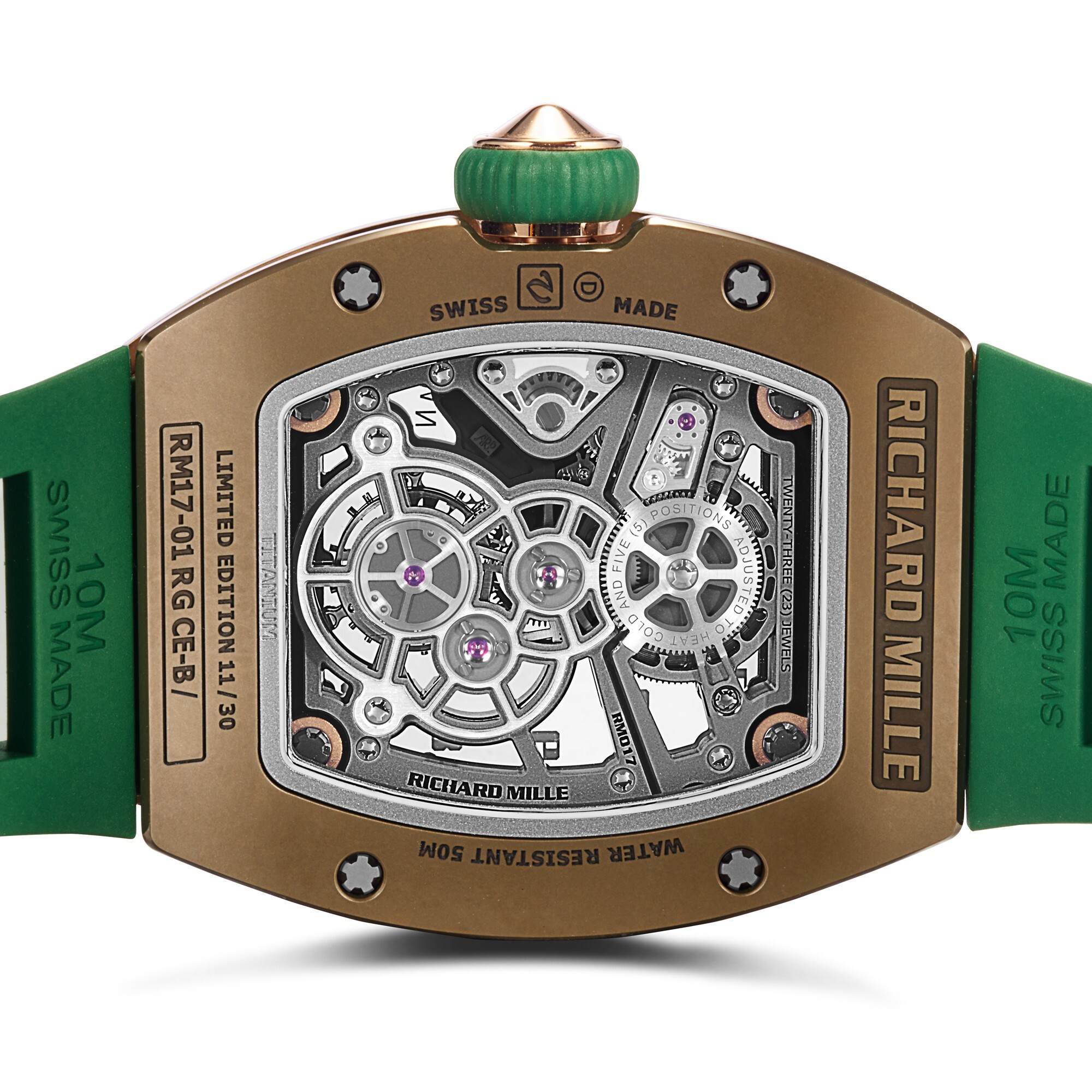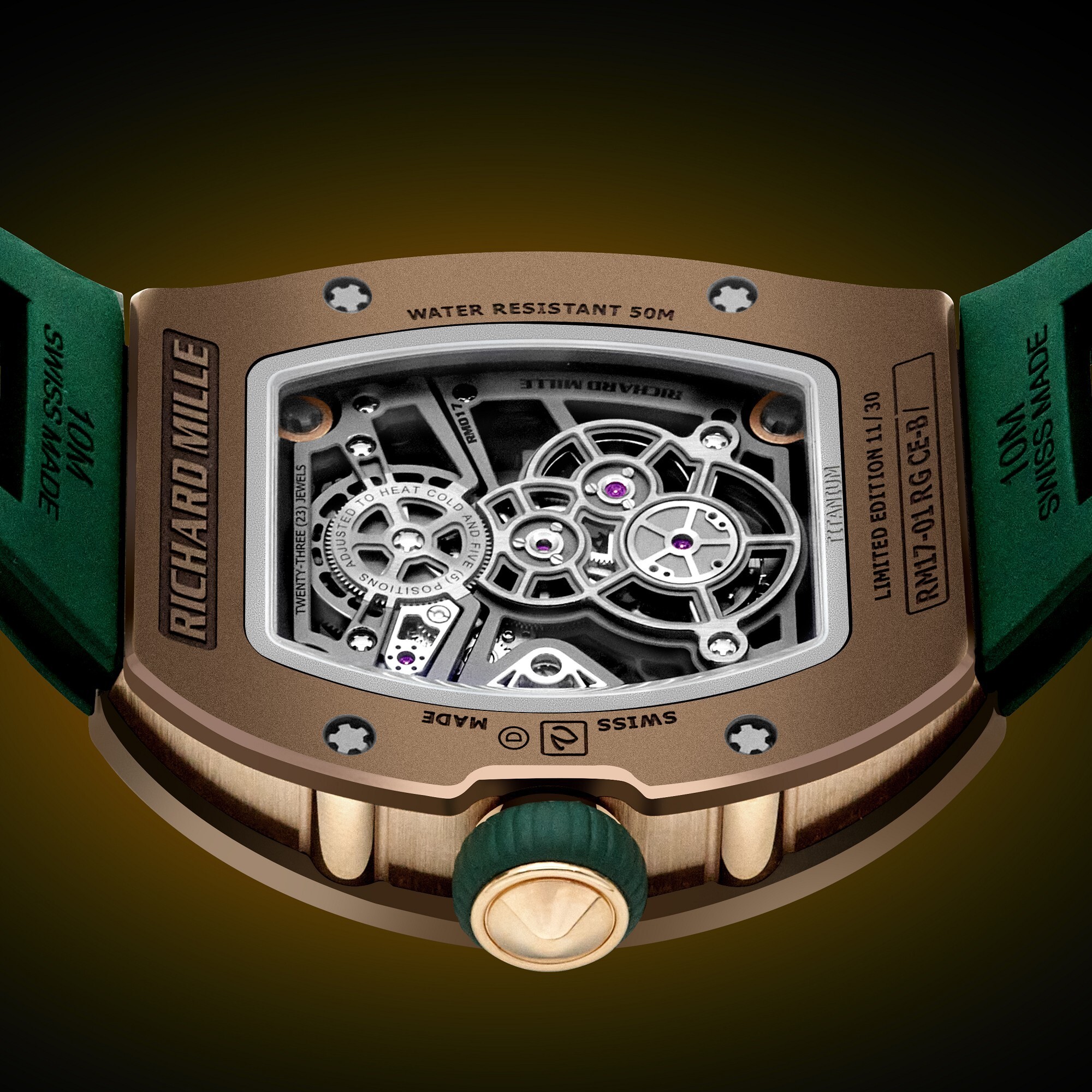 Powered by the RM 17-01 manual-winding tourbillon movement, beating at 21,600 vibrations per hour and offering a 70-hour power reserve. The skeletonized baseplate and bridges are made from grade 5 titanium. The free-sprung balance wheel offers enhanced shock resistance, and the crown features a torque-limiting safety system to prevent damage to the stem or mainspring from overwinding.