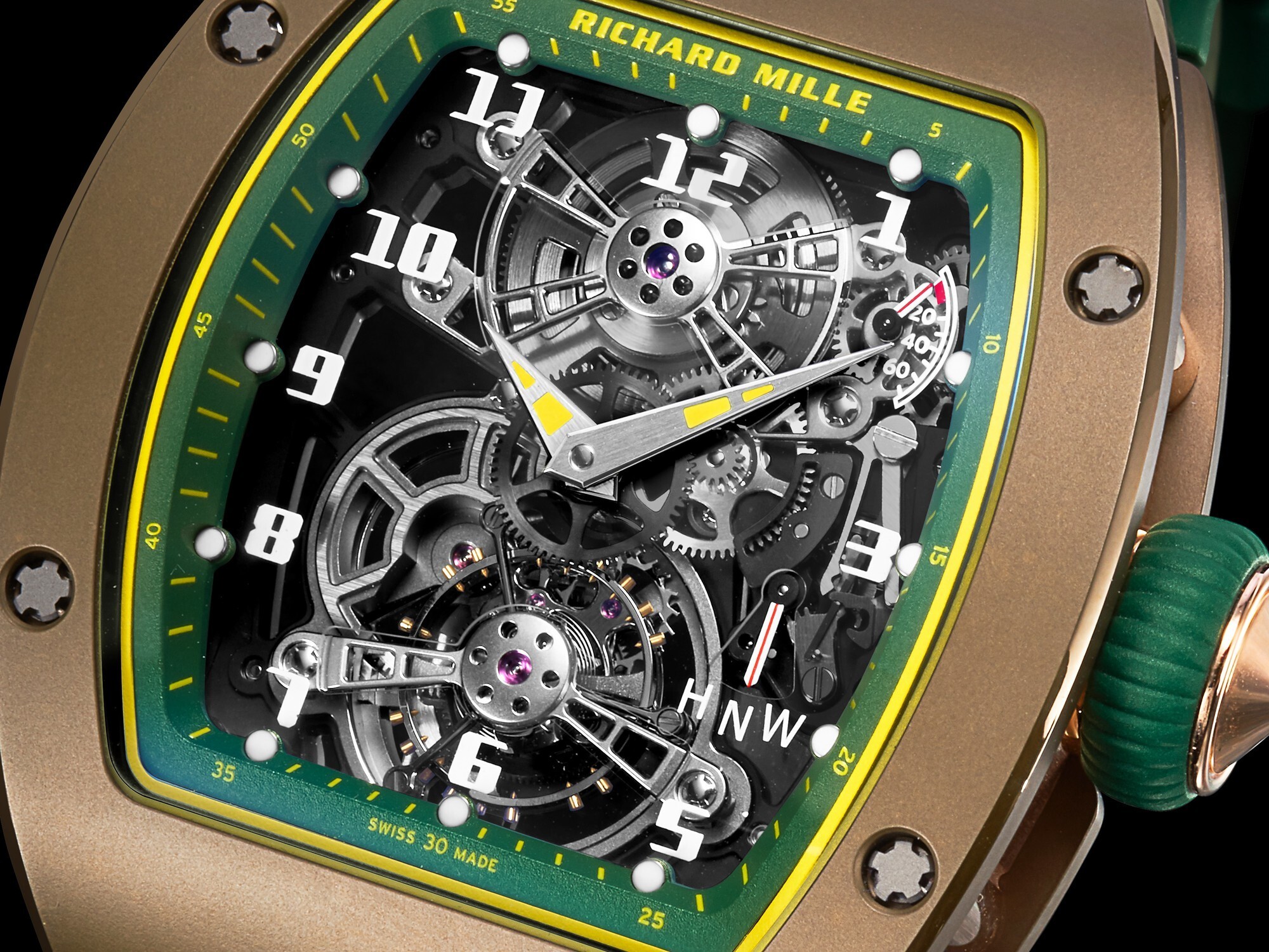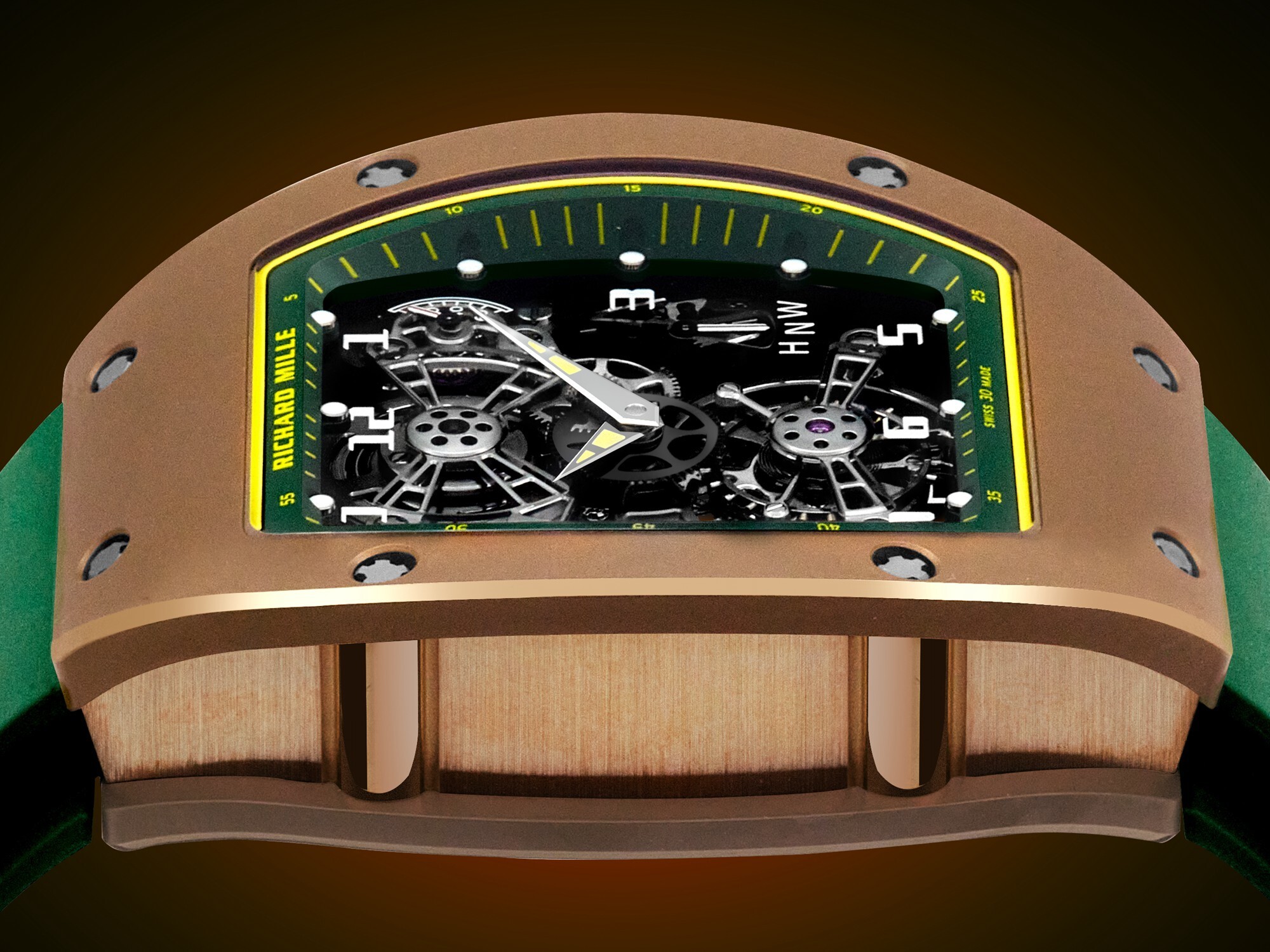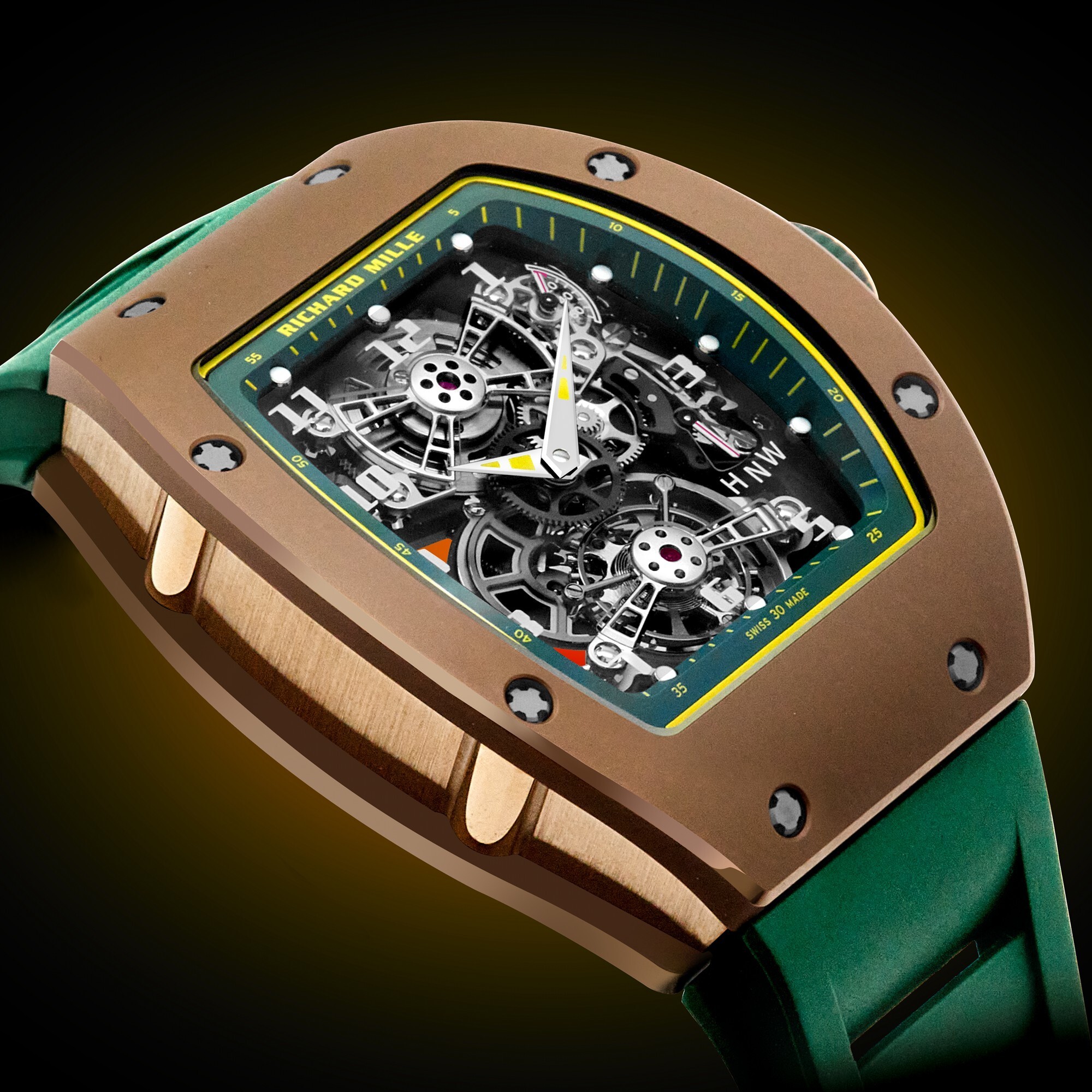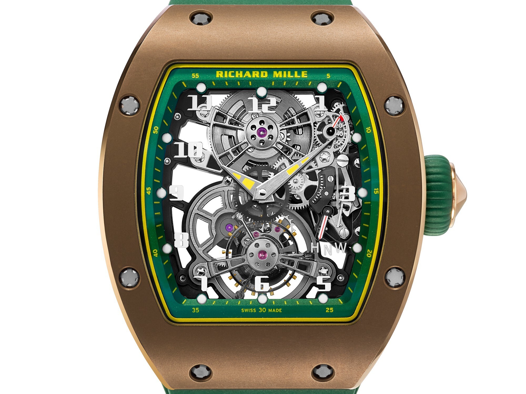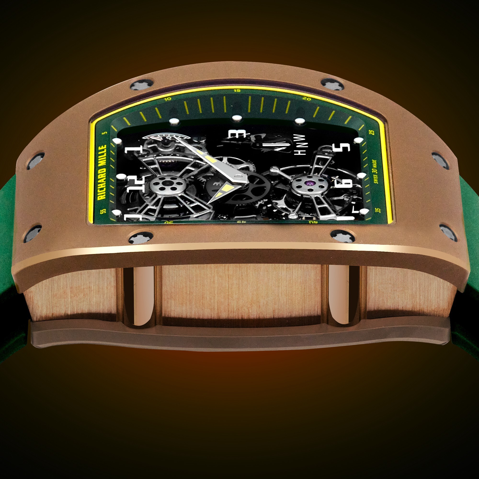 Powered by the RM 17-01 manual-winding tourbillon movement, beating at 21,600 vibrations per hour and offering a 70-hour power reserve. The skeletonized baseplate and bridges are made from grade 5 titanium. The free-sprung balance wheel offers enhanced shock resistance, and the crown features a torque-limiting safety system to prevent damage to the stem or mainspring from overwinding.