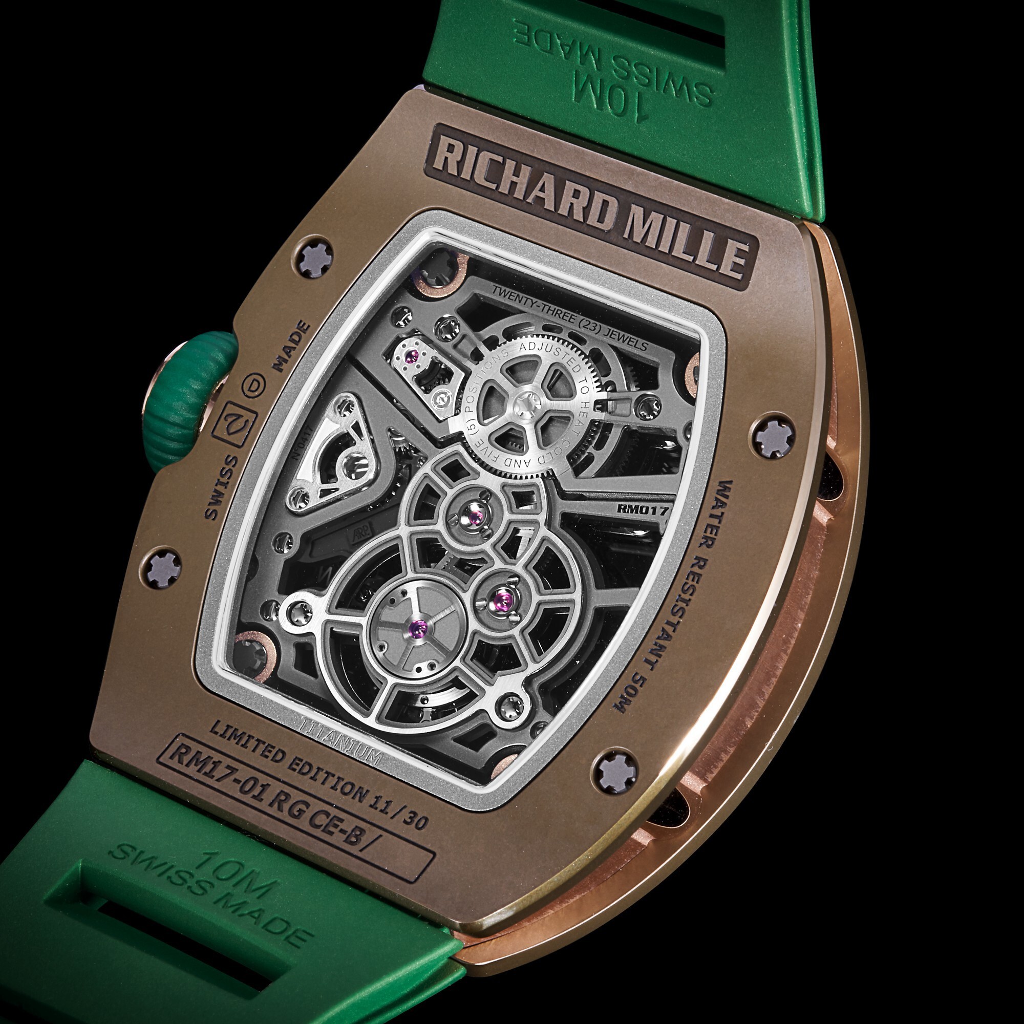Cermet case, dimensions 48.15 x 40.10 x 13.08 mm. Sapphire crystal. Skeleton dial. RM 17-01 manual-winding movement, 23 jewels, 21,600 vph, 70-hour power reserve. Rubber strap. Water-resistant to 50 meters.