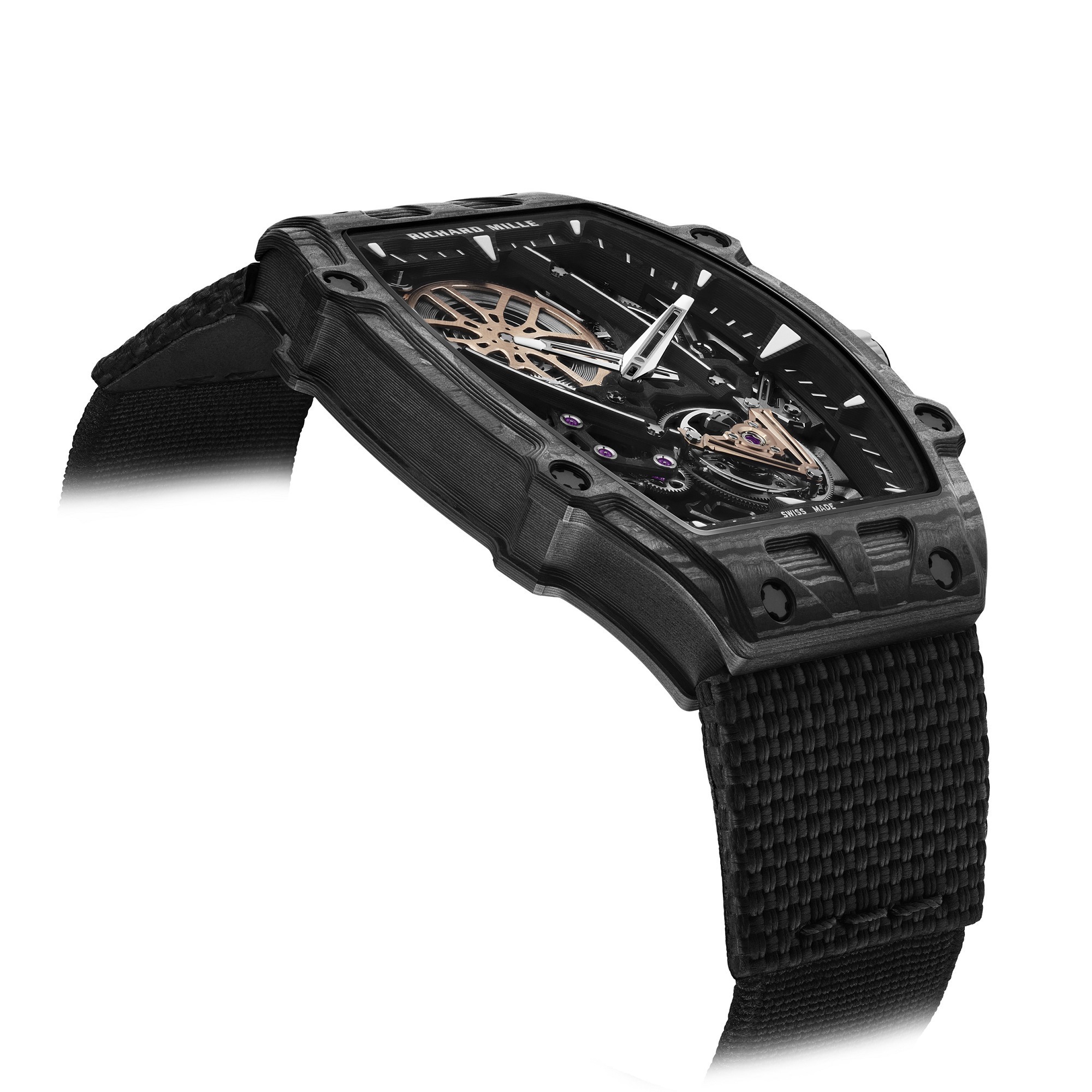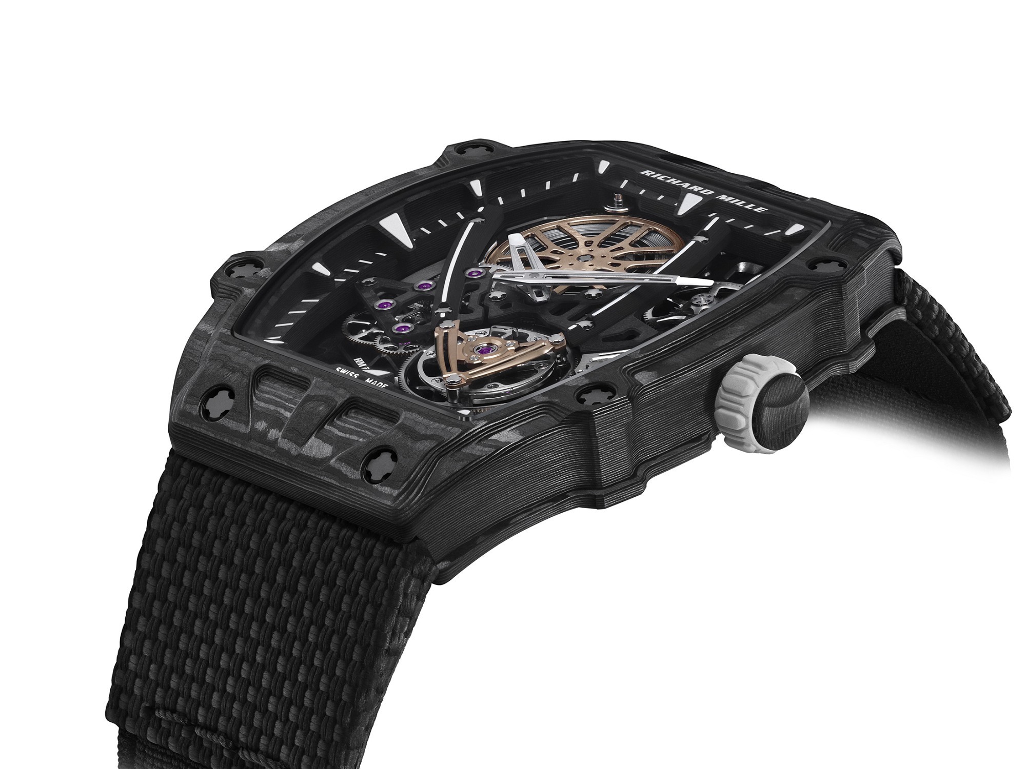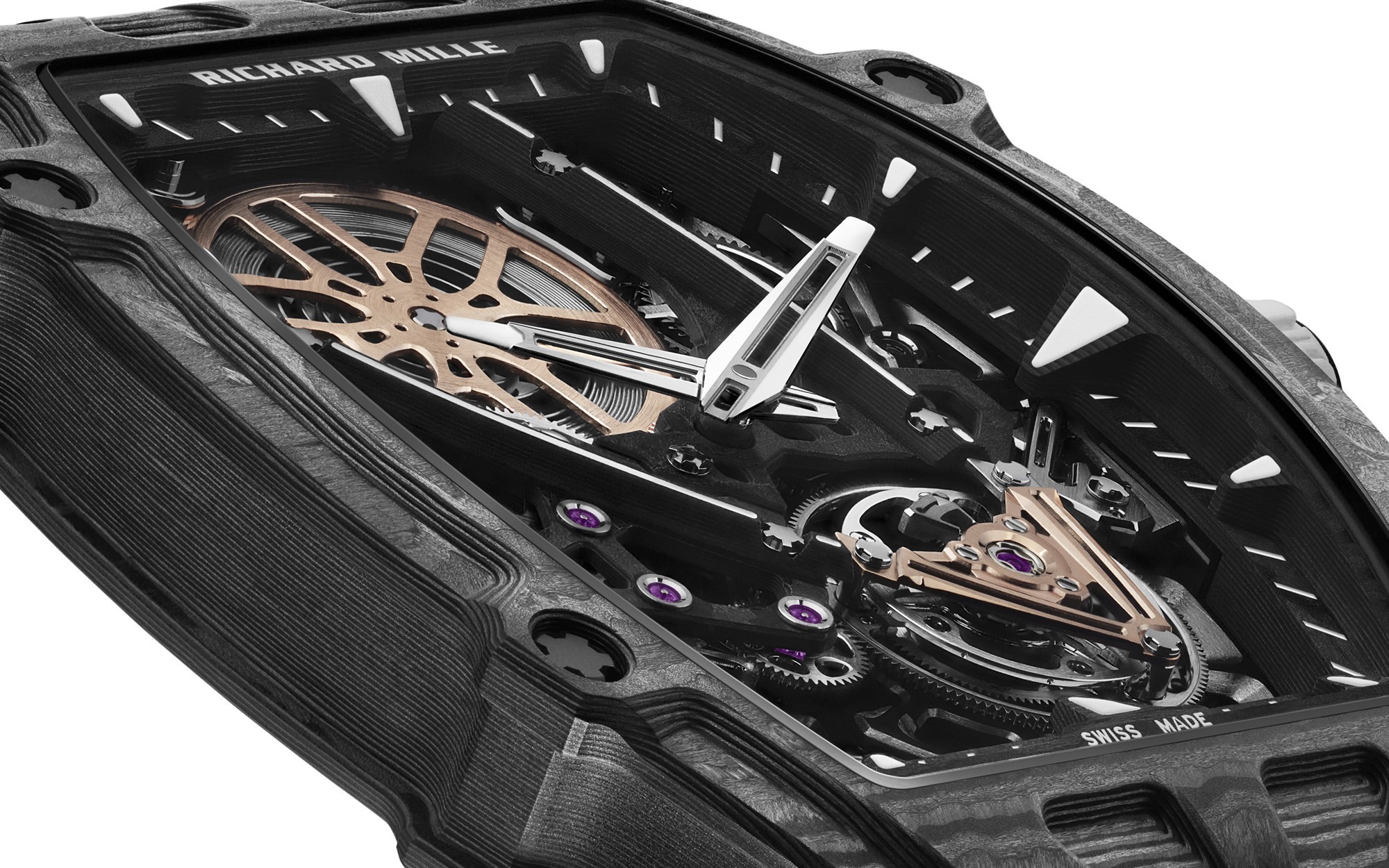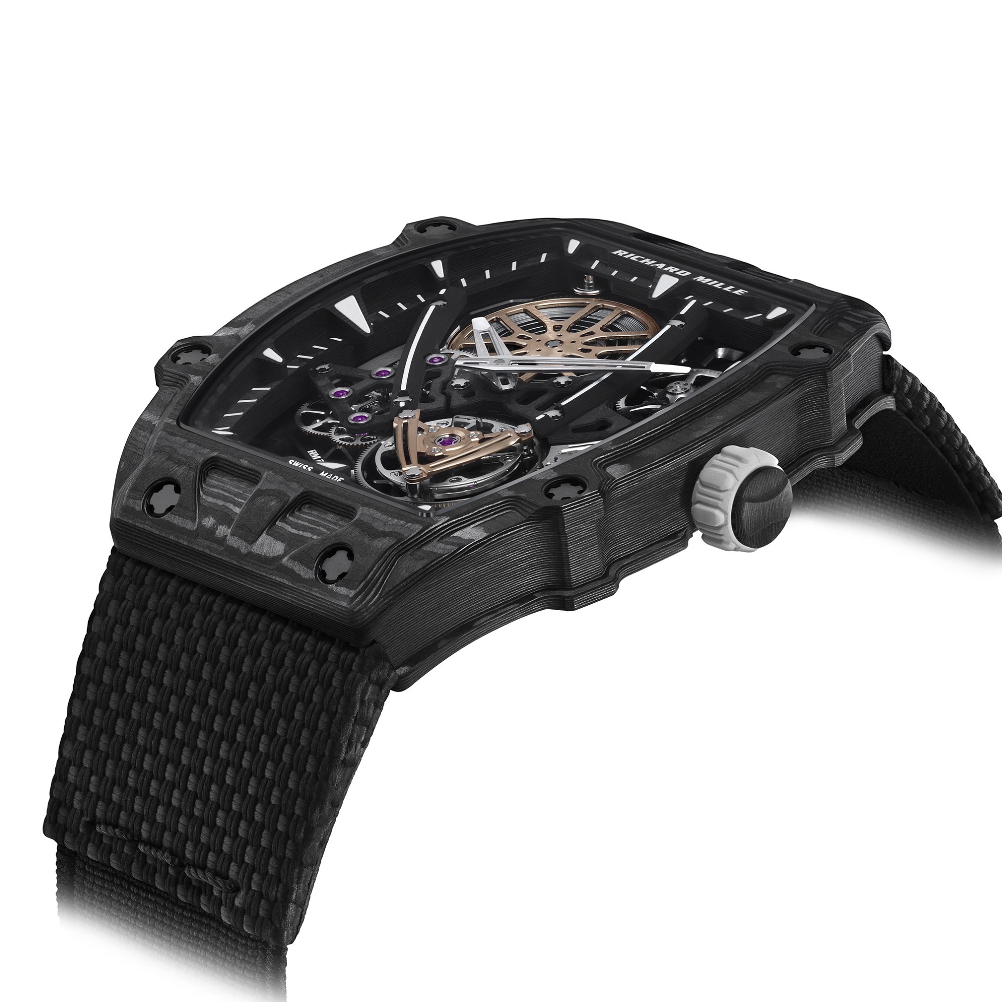 The case of this RM 27-05 is merely 7.2mm thick and is crafted from a new carbon composite material – “Carbon TPT® B.4” – which took five years to develop. This high-tech material is 4% denser than standard Carbon TPT®, offers a 15% increase in fiber stiffness, and a 30% improvement in resin strength. Its structure is optimized for anisotropy, achieving incredible toughness while remaining lightweight, providing the strongest impact resistance in the series to date.