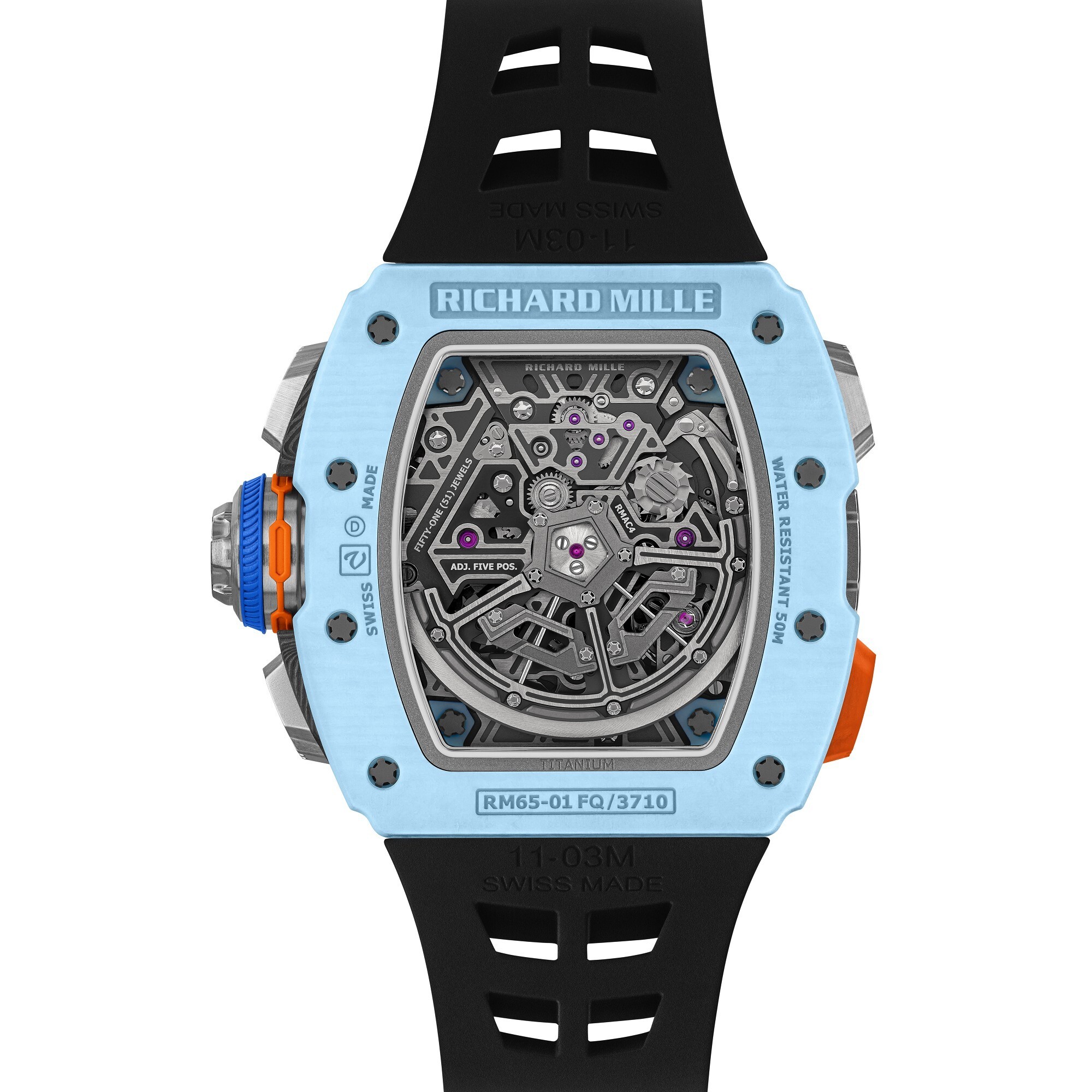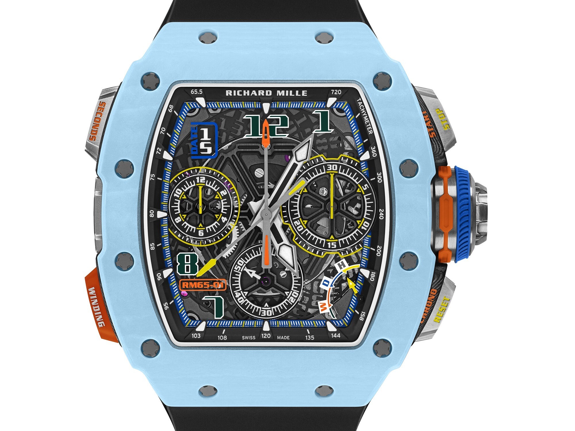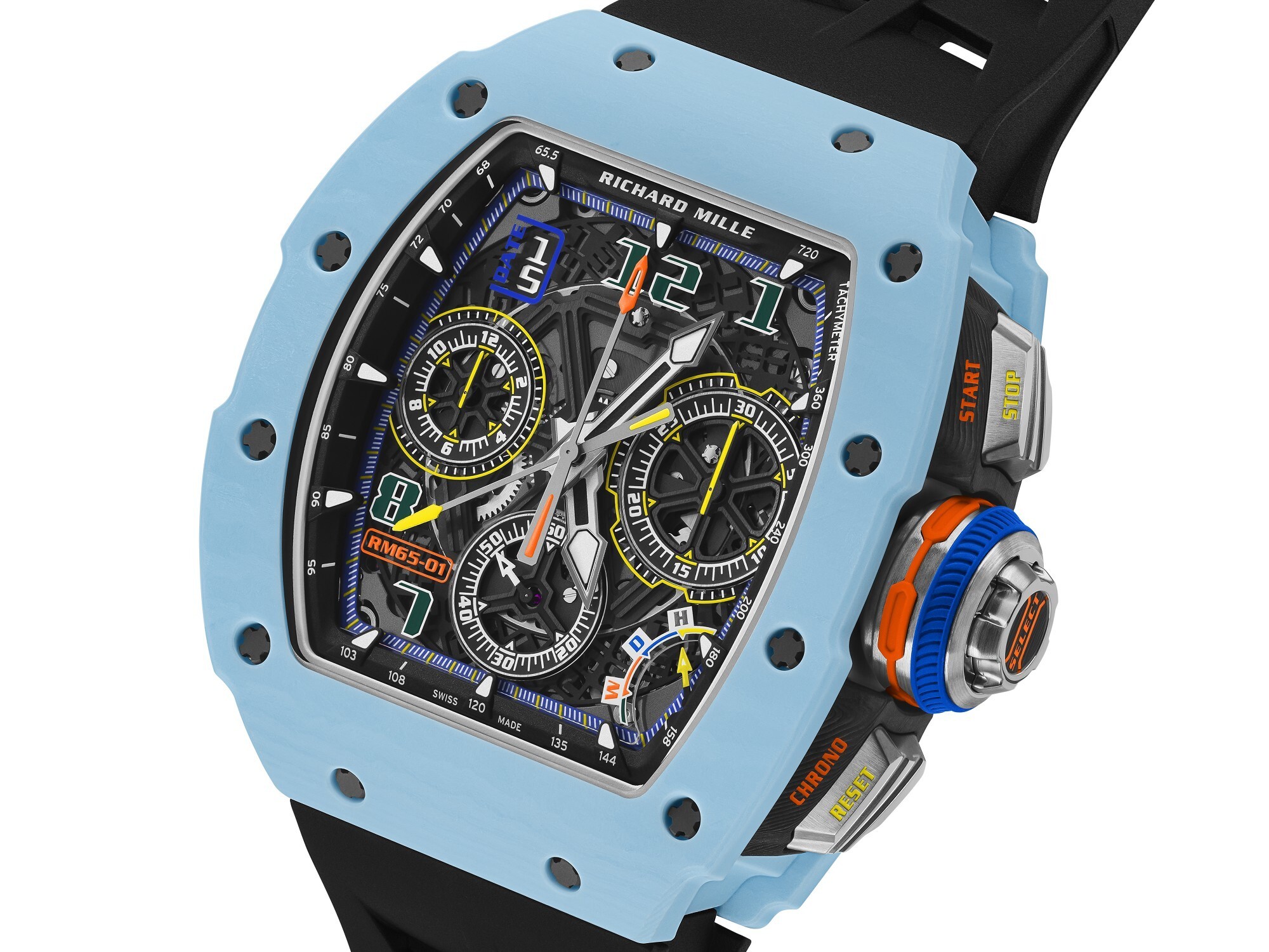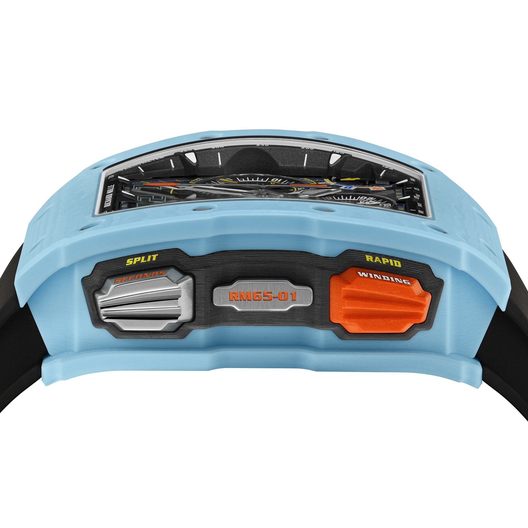 This RICHARD MILLE RM 65-01 Split Seconds Chronograph marks the first time a case is crafted from a new light blue Quartz TPT® composite, presenting a refreshing color scheme perfect for summer wear.