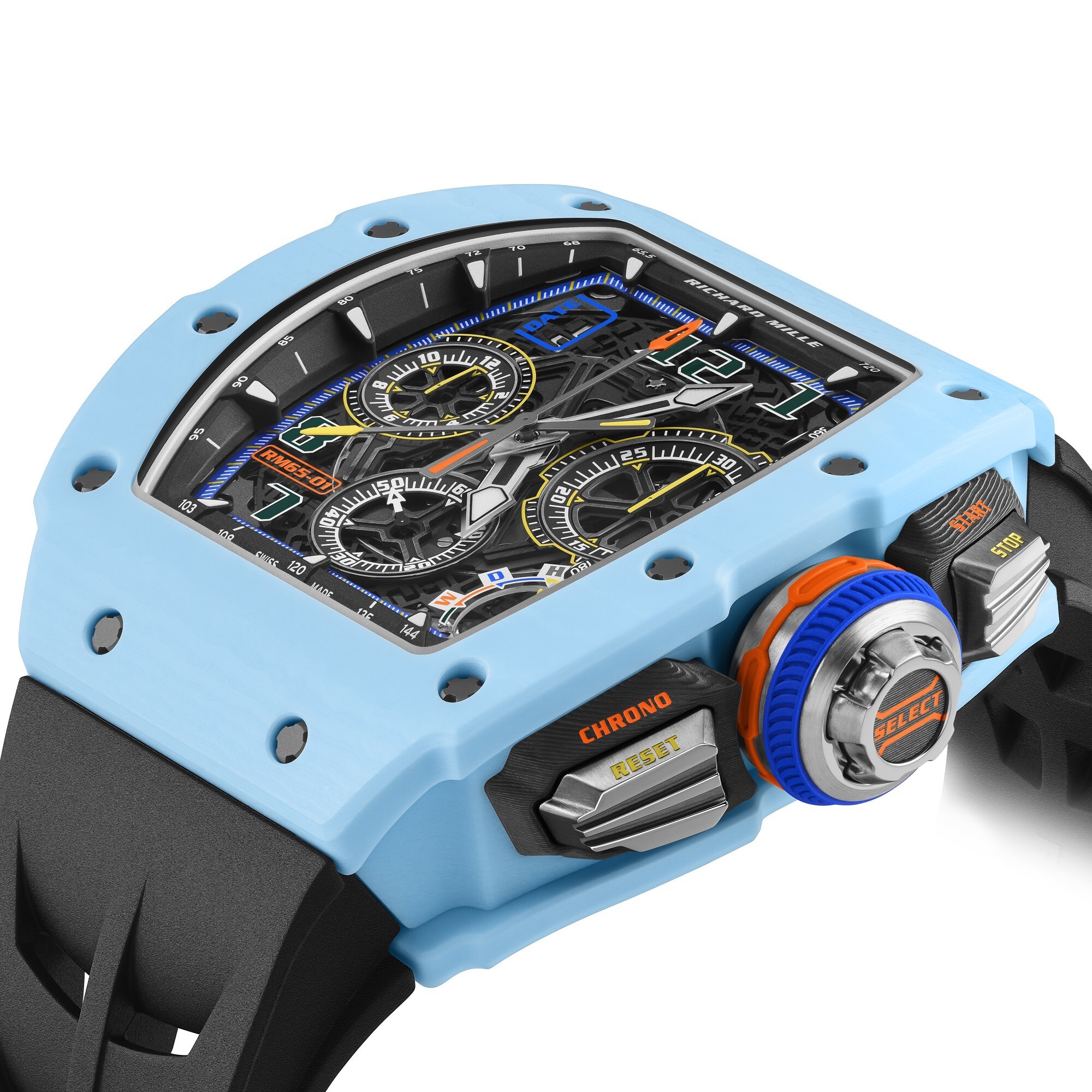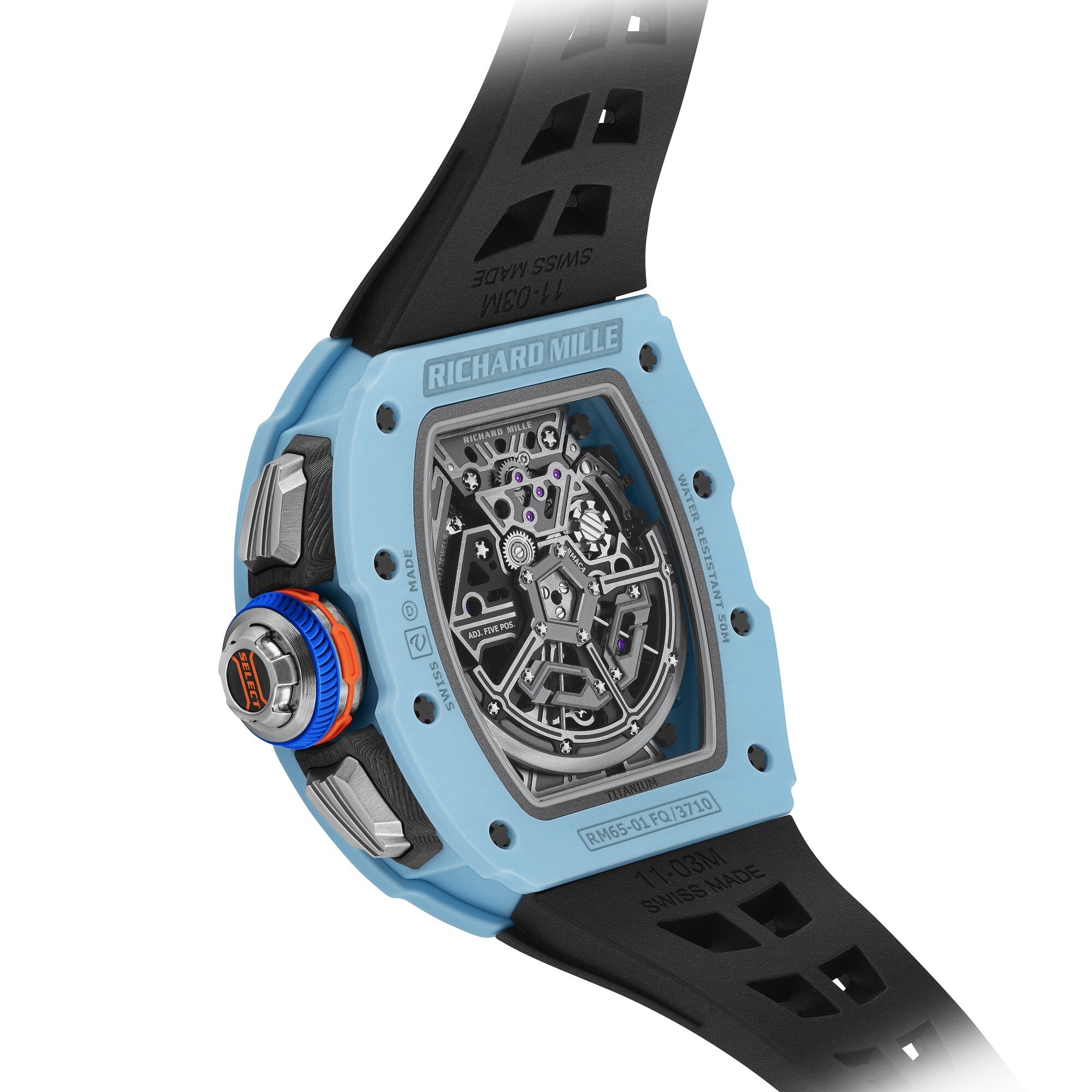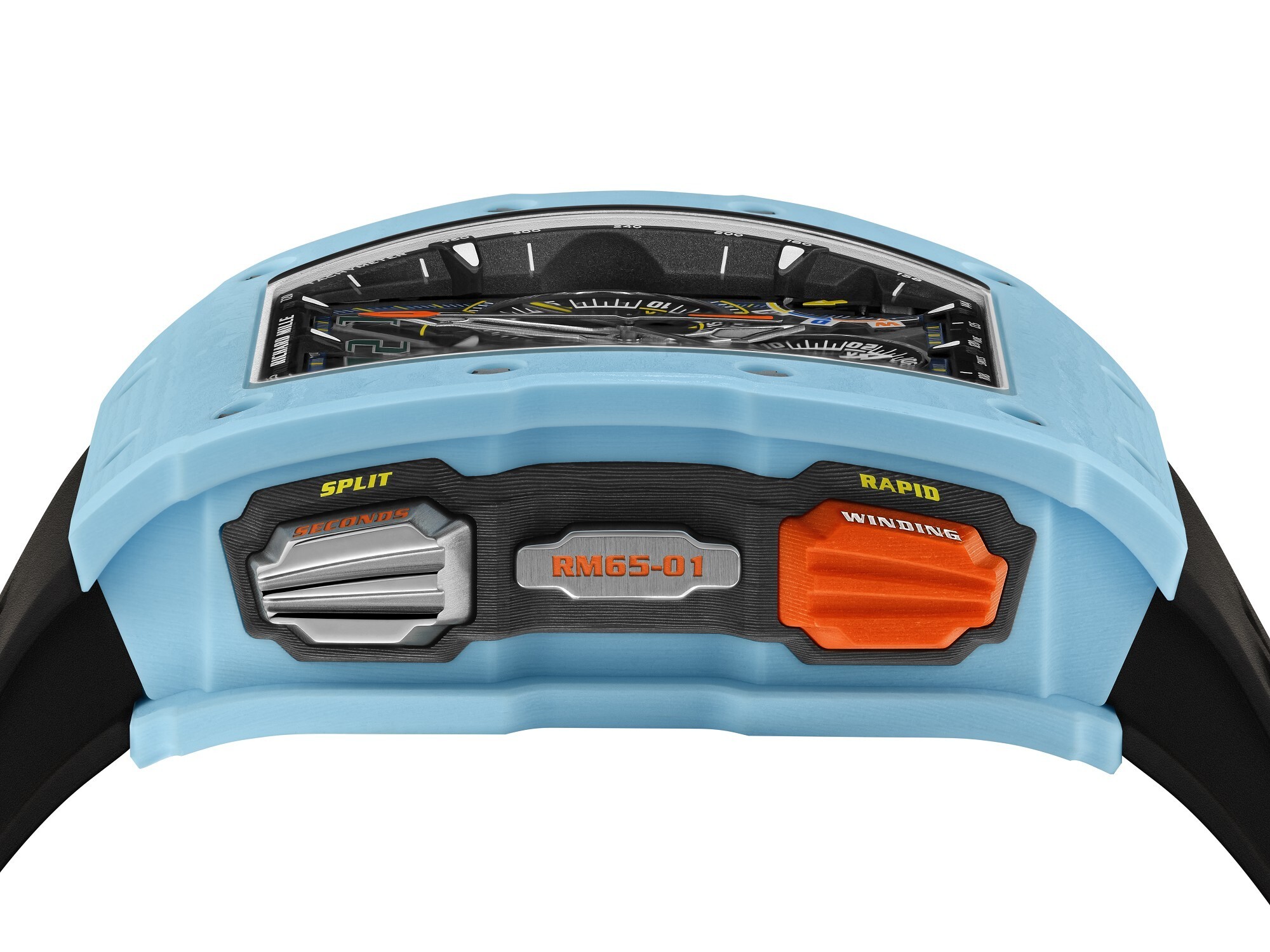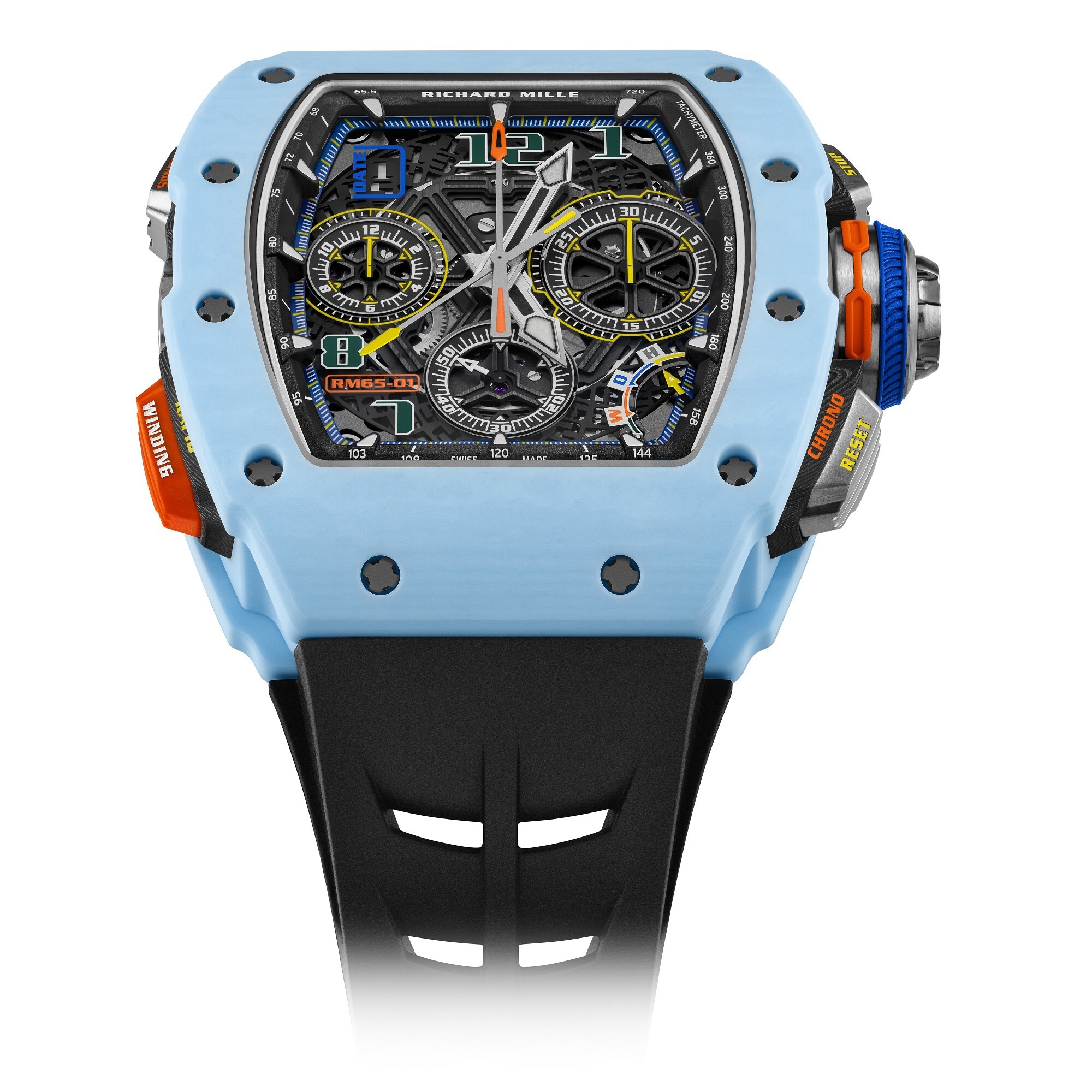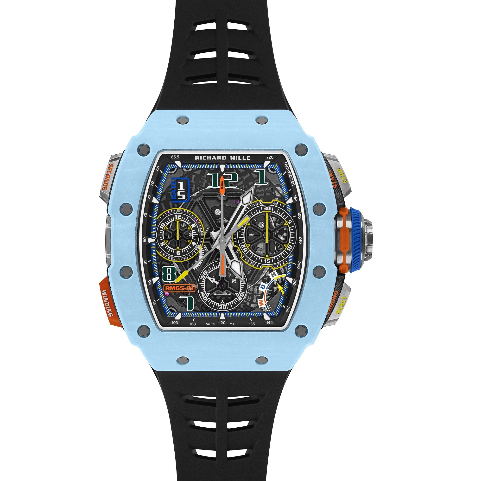This RICHARD MILLE RM 65-01 Split Seconds Chronograph marks the first time a case is crafted from a new light blue Quartz TPT® composite, presenting a refreshing color scheme perfect for summer wear.