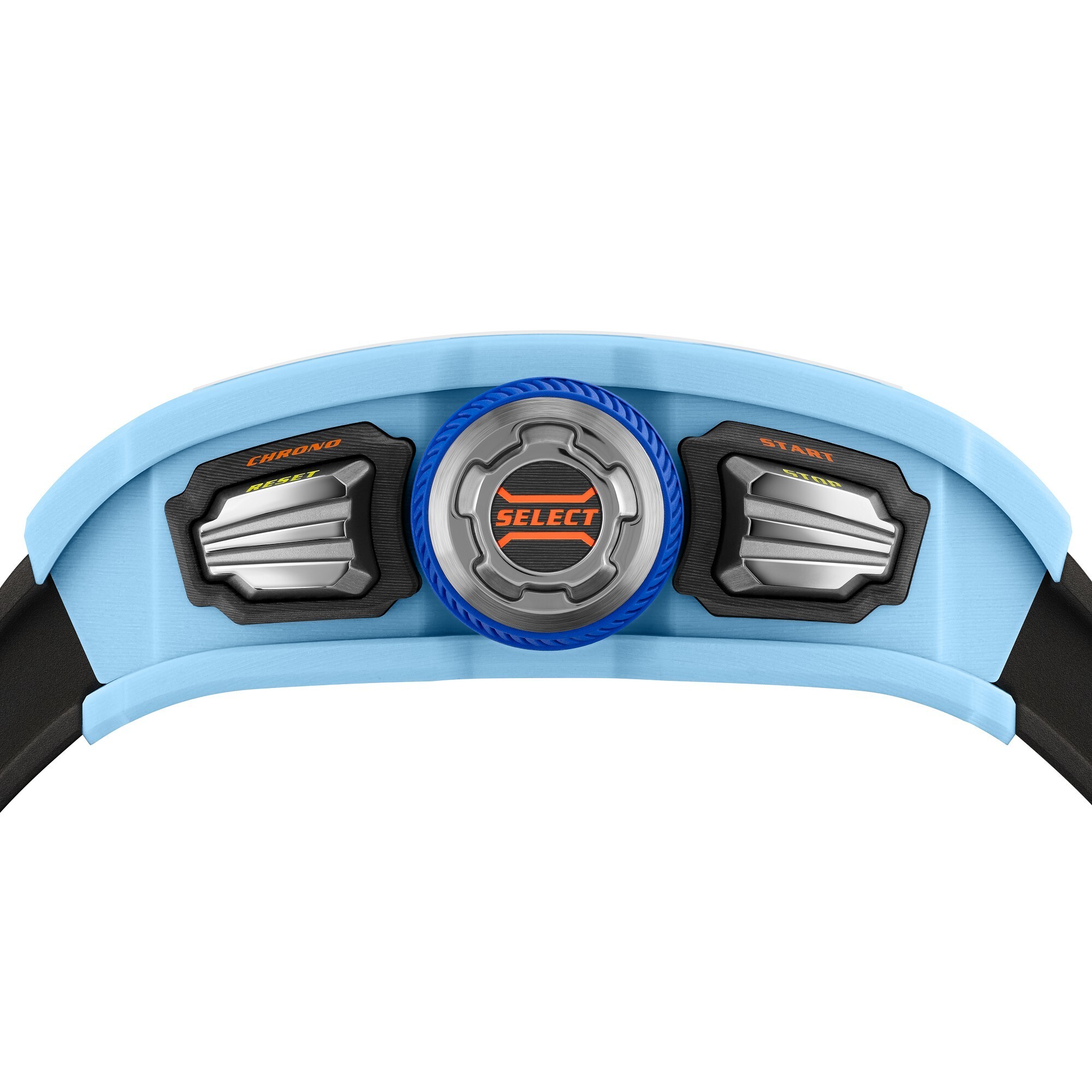 The new tonneau-shaped case is made from newly developed light blue Quartz TPT® quartz fibre. This composite material is built from multiple layers of silica fibres, each impregnated with special resins, and undergoes a high-temperature and high-pressure process to achieve its elegant blue hue. The crown and chronograph pushers are made from titanium, while the rapid-winding case button at 8 o’clock is crafted from orange Quartz TPT® quartz fibre. Pressing this button 125 times fully winds the mainspring.