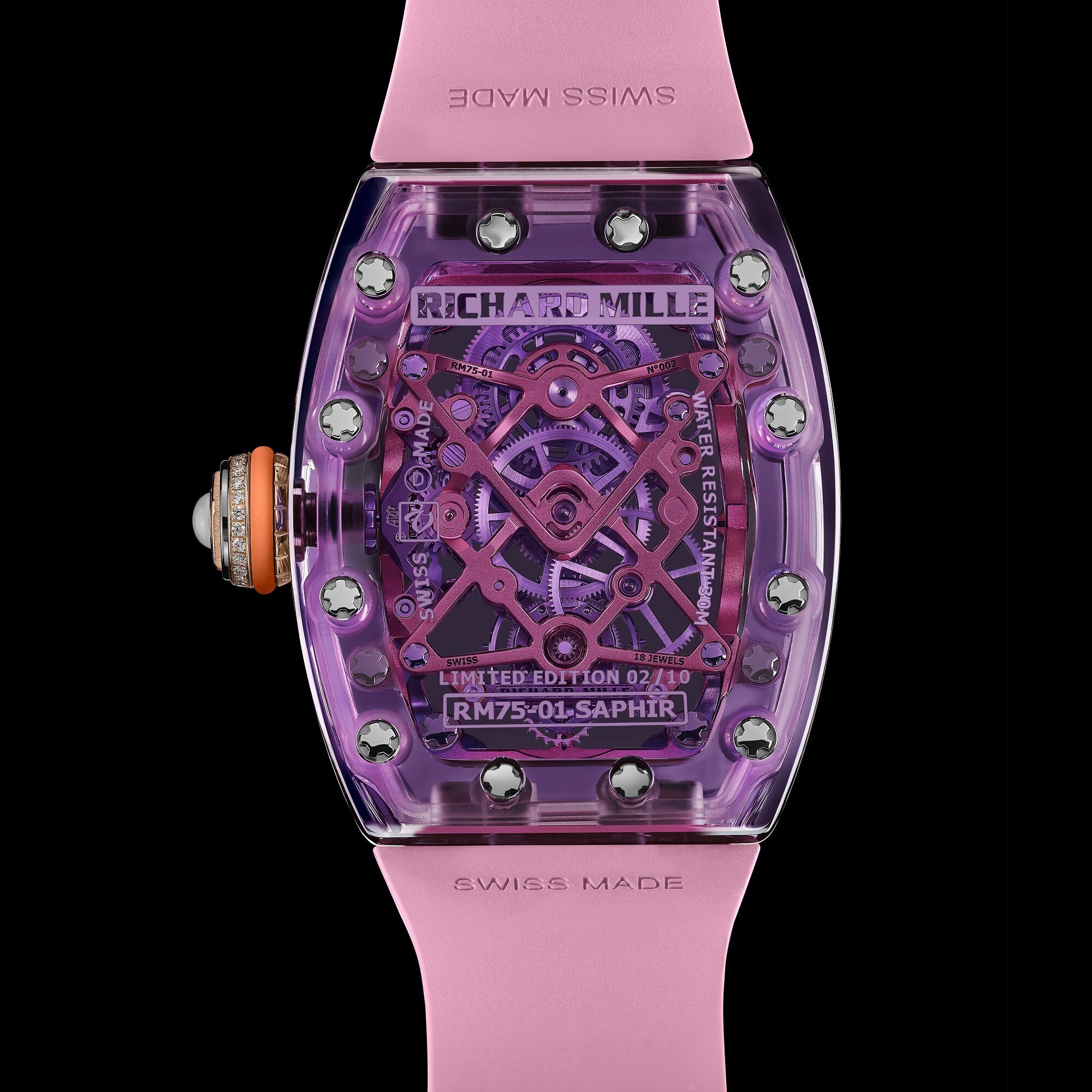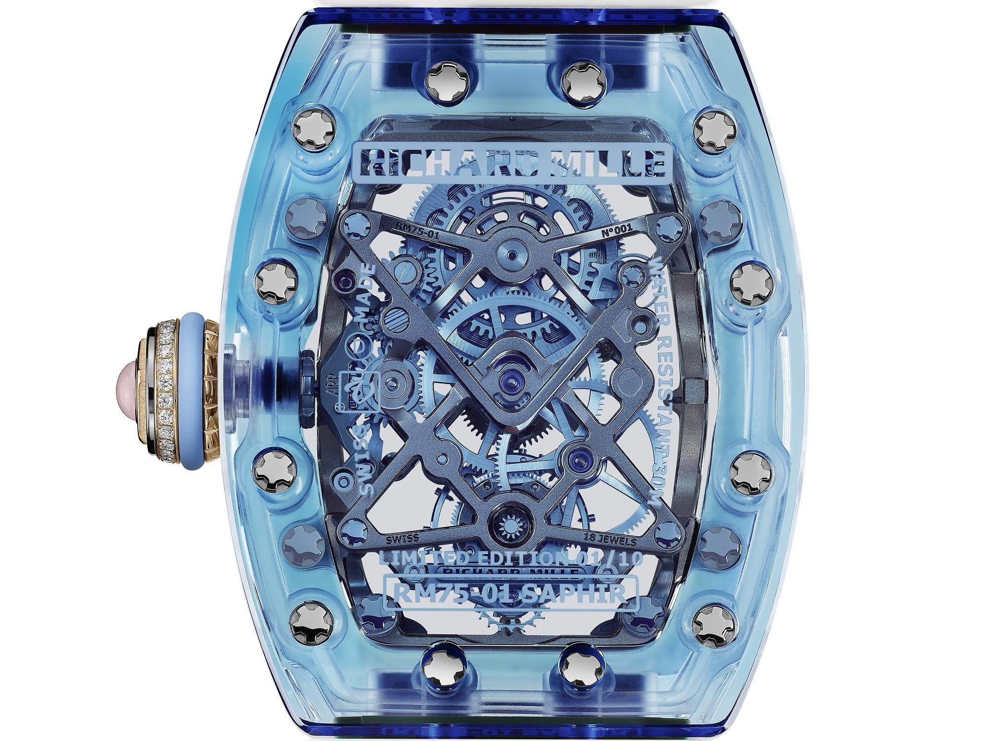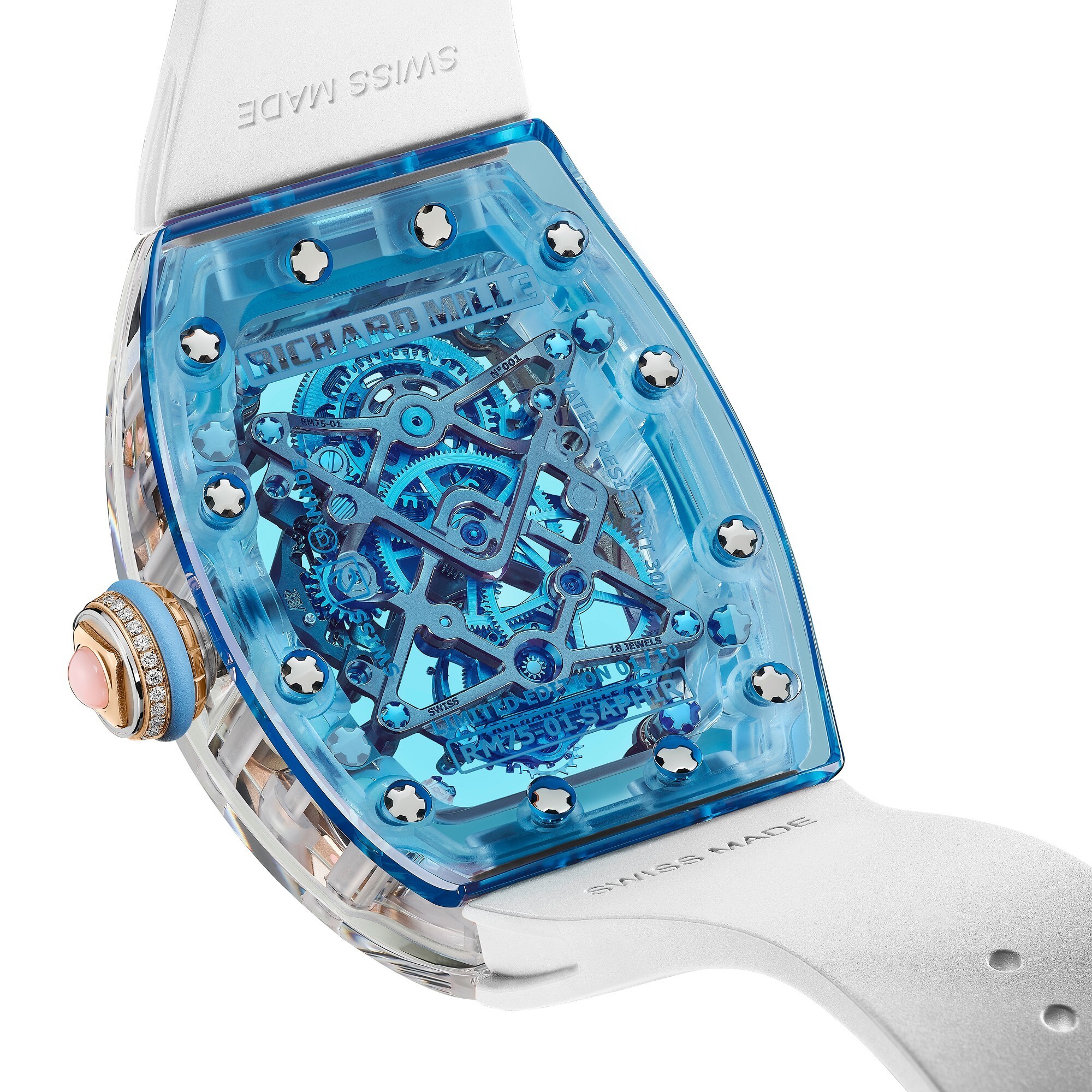 Sapphire crystal case, 32.9 × 46.75 × 14.35 mm,Sapphire bezel, diamond-set crown,Sapphire crystal front and back,Skeletonized dial and hands,RM 75-01 hand-wound movement,18 jewels, 21,600 vph, 65-hour power reserve,Rubber strap,Water-resistant to 30 meters
