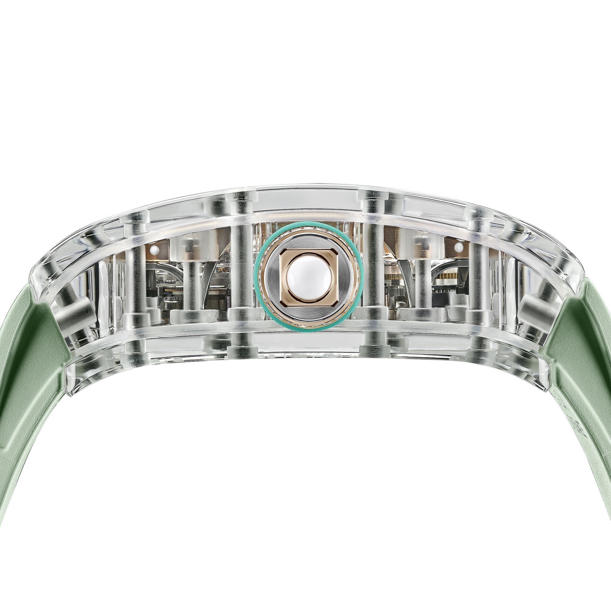 The openworked dial emphasizes the geometric architecture of the movement. The sandblasted rose gold inner bezel evokes the graceful arches of a Gothic cathedral dome, while the flying tourbillon at 6 o’clock appears to float freely thanks to its bridge-free construction. At 12 o’clock, the skeletonized barrel openly reveals the state of wind. Every surface—beveled, brushed, or polished—displays the meticulous hand-finishing typical of Richard Mille, transforming the entire movement into a kinetic sculpture.