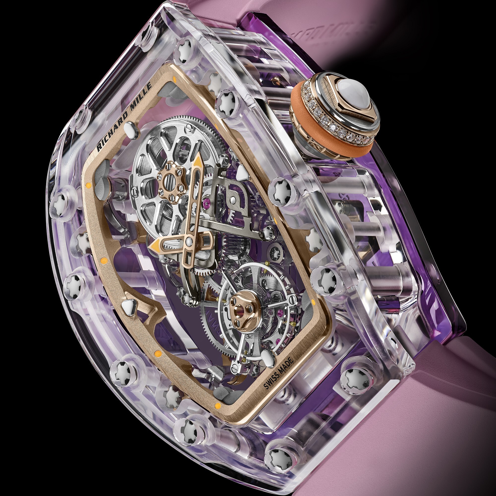 The watch is powered by the RM 75-01 hand-wound movement, beating at 21,600 vibrations per hour with a 65-hour power reserve. The titanium baseplate adopts a triangular structural design, merging lightweight rigidity with architectural elegance, while the gear train is rhodium-plated for enhanced brilliance and durability.