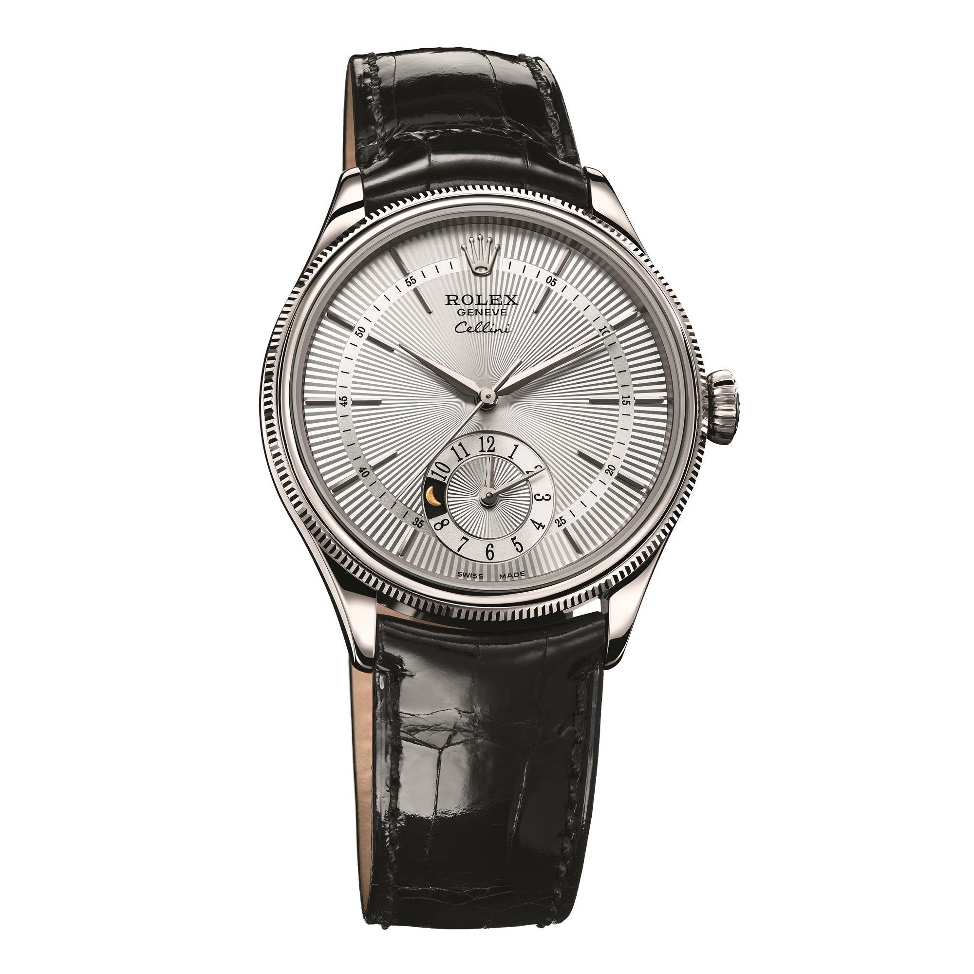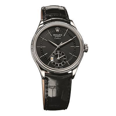 18K white gold/rose gold case, 39mm in diameter,Sapphire crystal glass, Fluted, screw-down winding crown, Silver/black sunburst dial,18K white gold/rose gold hands, Rolex automatic movement, 31 jewels, 28,800 vibrations per hour, 48-hour power reserve, Alligator leather strap with 18K white gold buckle, Water resistance: 50 meters.