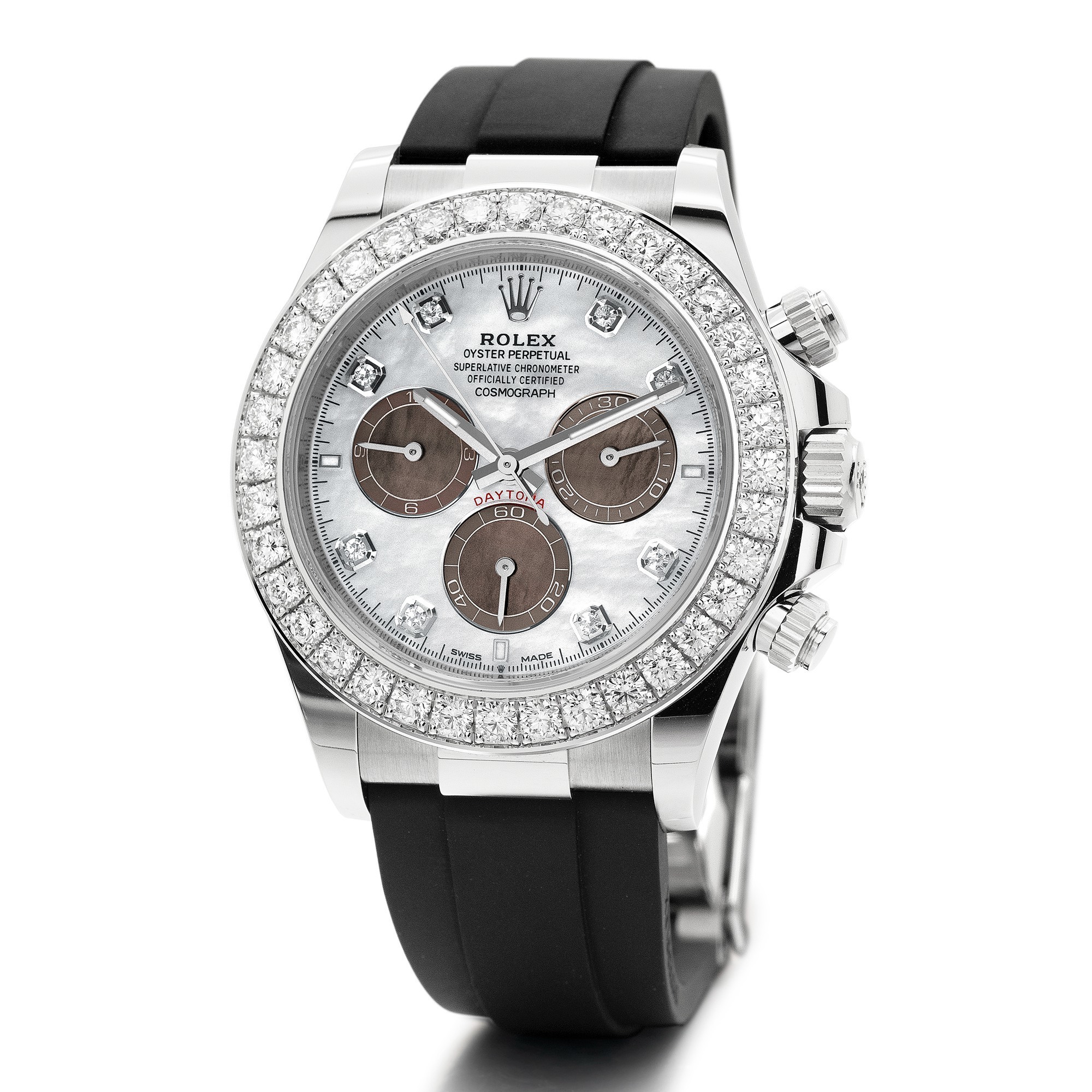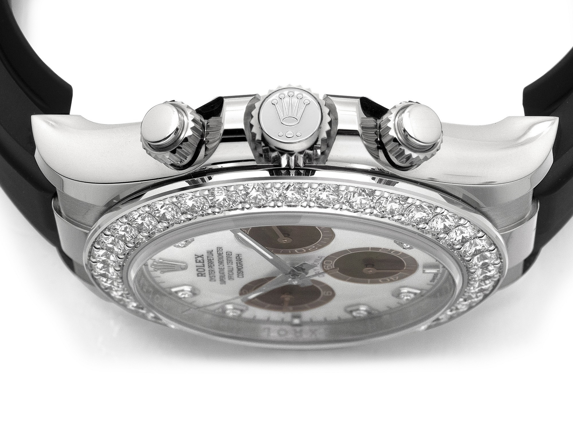 Case: 18K white gold, 40mm diameter, 11.9mm thick,Bezel: Set with 36 brilliant-cut diamonds,Crown: Screw-down,Crystal: Sapphire,Dial: White mother-of-pearl main dial, black mother-of-pearl subdials, diamond hour markers,Movement: Rolex Caliber 4131 automatic, 47 jewels, 28,800 vph,Power reserve: 72 hours,Bracelet: Oysterflex composite strap, folding Oysterlock safety clasp,Water resistance: 100 meters,Functions: Chronograph.