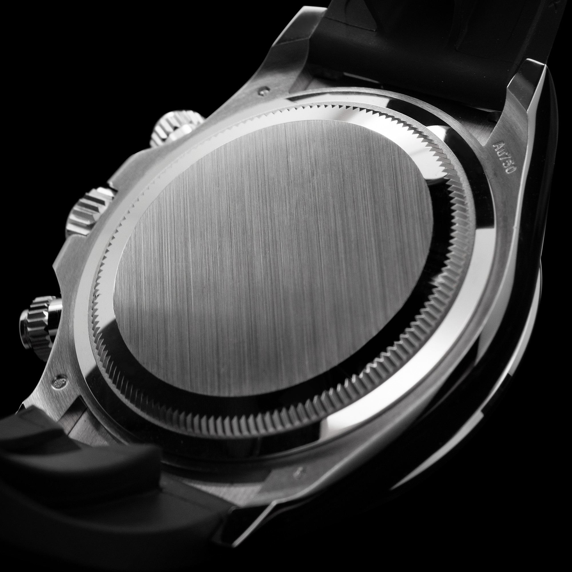 The 40mm Oyster case, crafted entirely from a solid block of 18K white gold, features a screw-down crown ensuring 100 meters of water resistance. The polished surfaces of the case contrast harmoniously with the satin-brushed lugs, highlighting the brand’s meticulous finishing. The traditional tachymeter bezel of the Daytona has been replaced by a ring of 36 brilliant-cut diamonds, seamlessly extending the sparkle of the diamond hour markers on the dial.