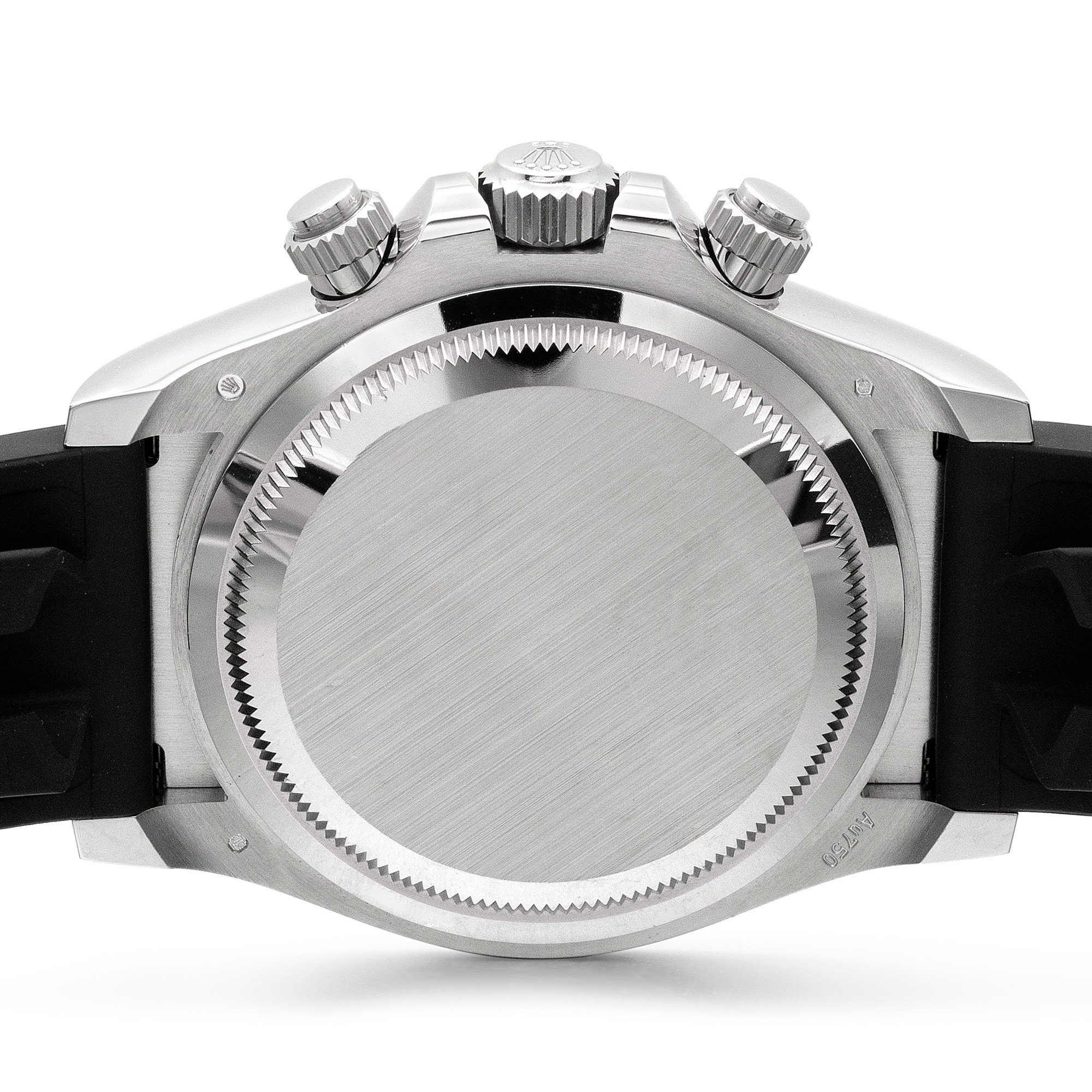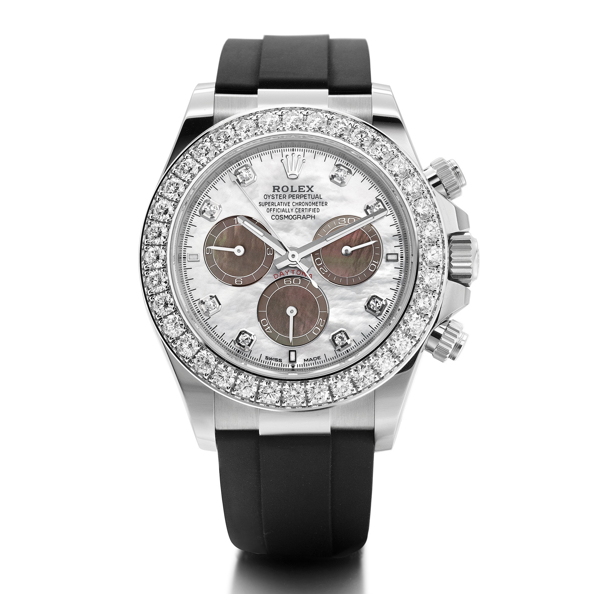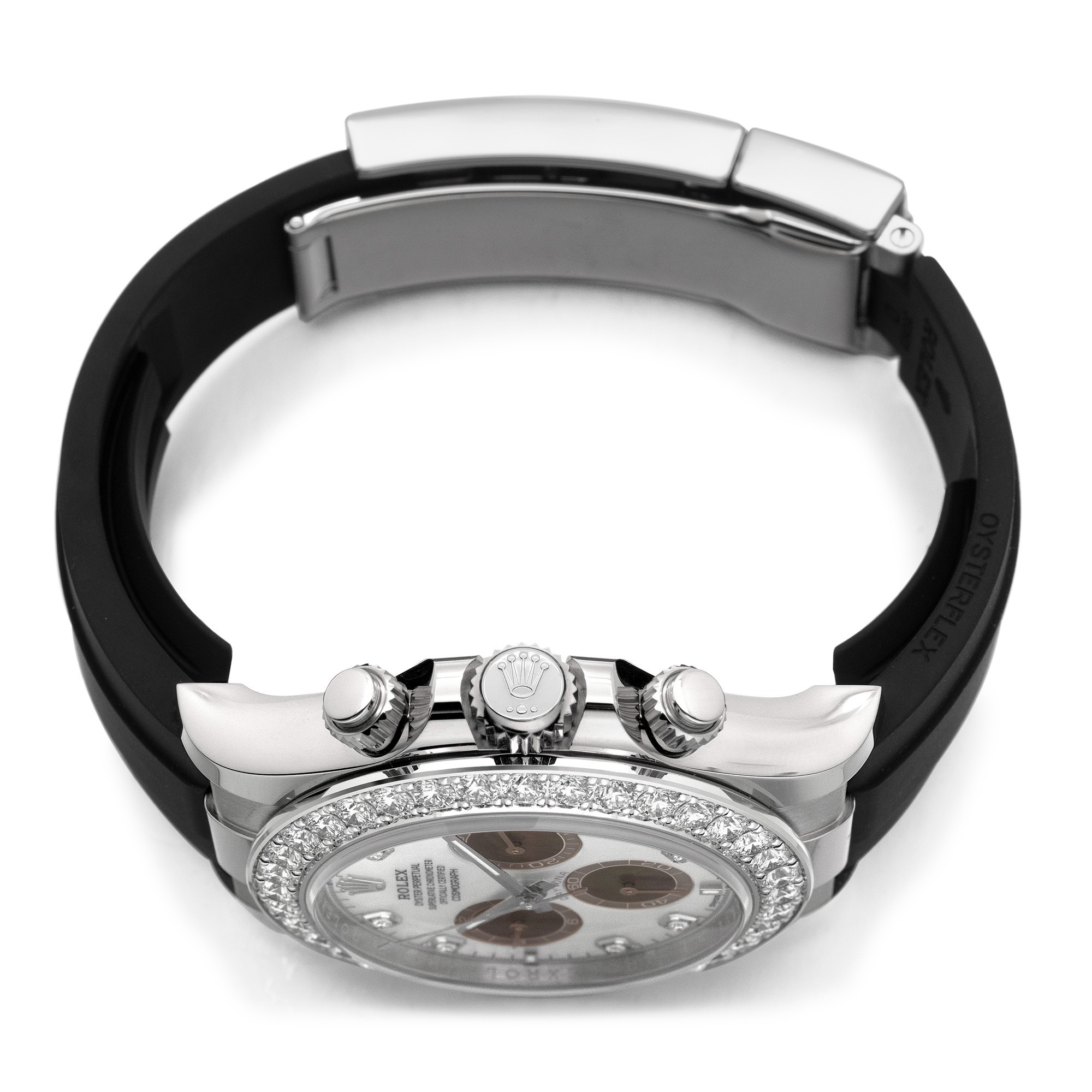 Case: 18K white gold, 40mm diameter, 11.9mm thick,Bezel: Set with 36 brilliant-cut diamonds,Crown: Screw-down,Crystal: Sapphire,Dial: White mother-of-pearl main dial, black mother-of-pearl subdials, diamond hour markers,Movement: Rolex Caliber 4131 automatic, 47 jewels, 28,800 vph,Power reserve: 72 hours,Bracelet: Oysterflex composite strap, folding Oysterlock safety clasp,Water resistance: 100 meters,Functions: Chronograph.