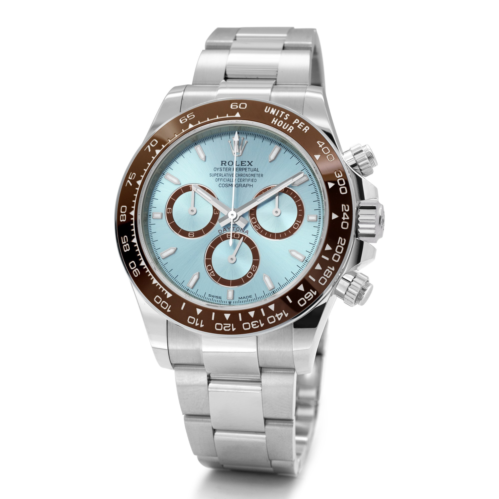 Platinum case, 40mm diameter, brown ceramic bezel, screw-down crown, sapphire crystal, ice blue dial, Calibre 4131 self-winding movement, 47 jewels, 28,800 vph, 72-hour power reserve, platinum bracelet, Oysterlock safety clasp, 100m water resistance.