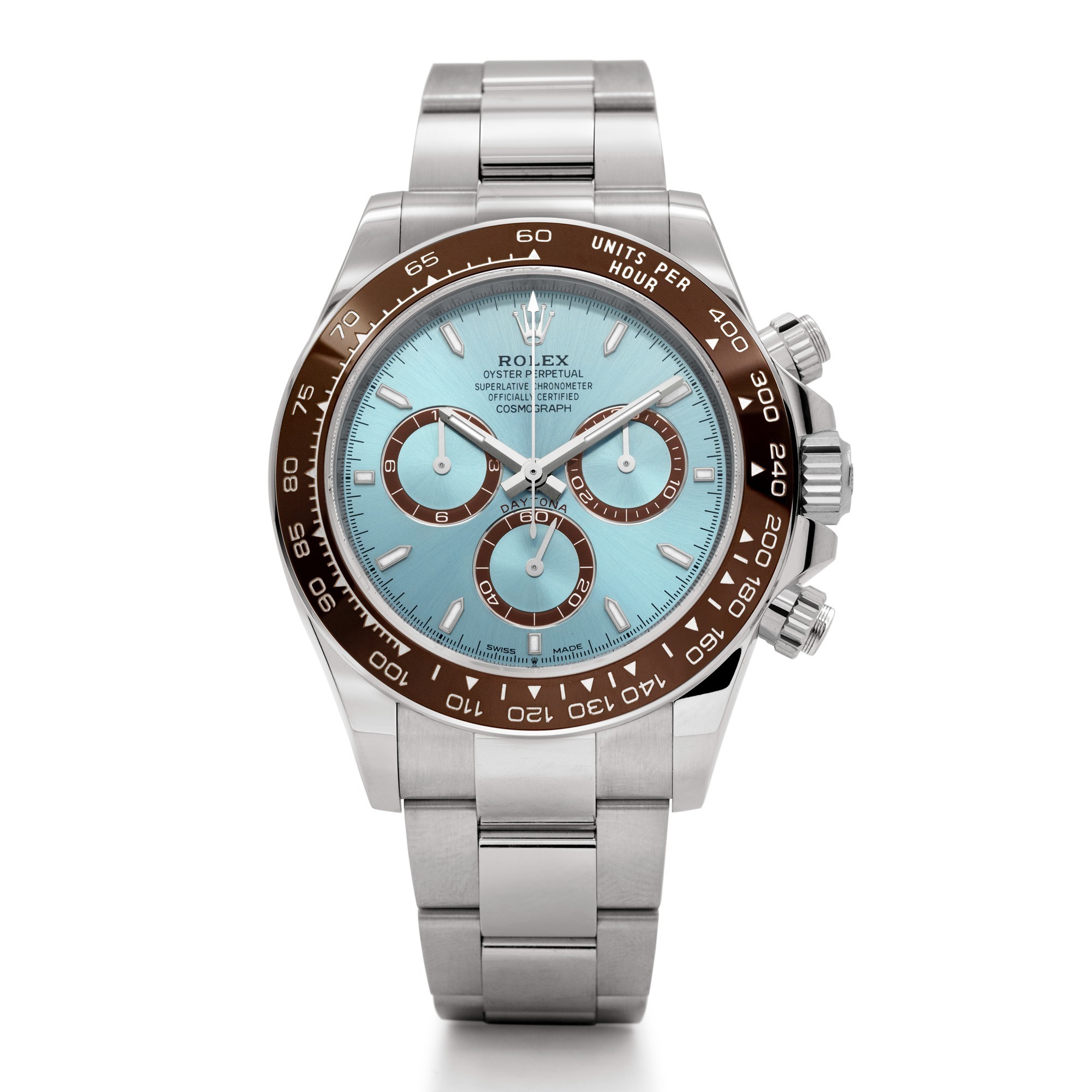 Platinum case, 40mm diameter, brown ceramic bezel, screw-down crown, sapphire crystal, ice blue dial, Calibre 4131 self-winding movement, 47 jewels, 28,800 vph, 72-hour power reserve, platinum bracelet, Oysterlock safety clasp, 100m water resistance.
