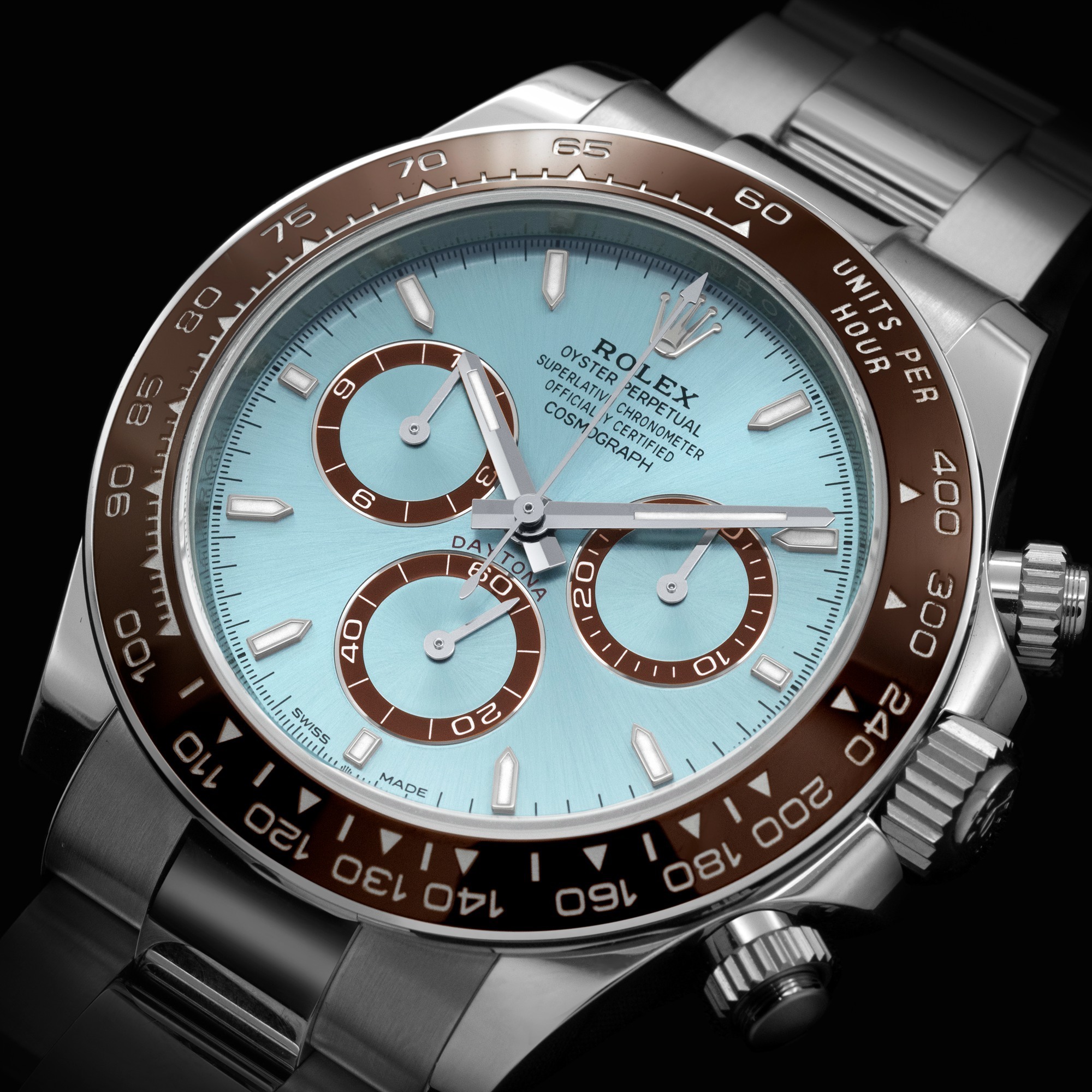 This marks the first major update for the Daytona chronograph since 2000. The 40mm platinum case now features bevelled edges to enhance the play of light and shadows. The lugs have been widened for a more natural integration with the bracelet. The brown Cerachrom ceramic bezel is now framed by an outer ring of mirror-polished platinum, further accentuating the metallic feel, and the numerals and graduations also feature a platinum coating.