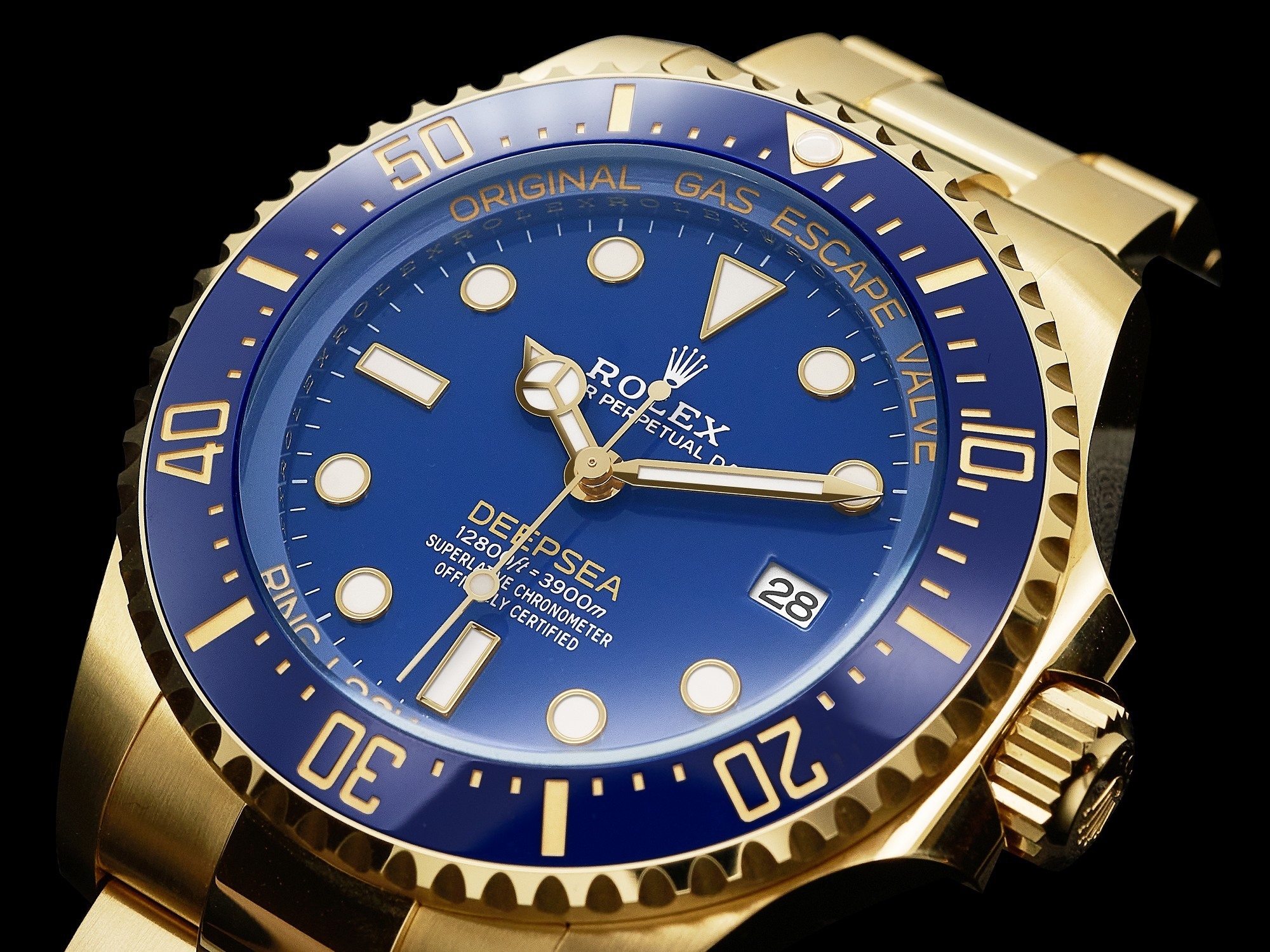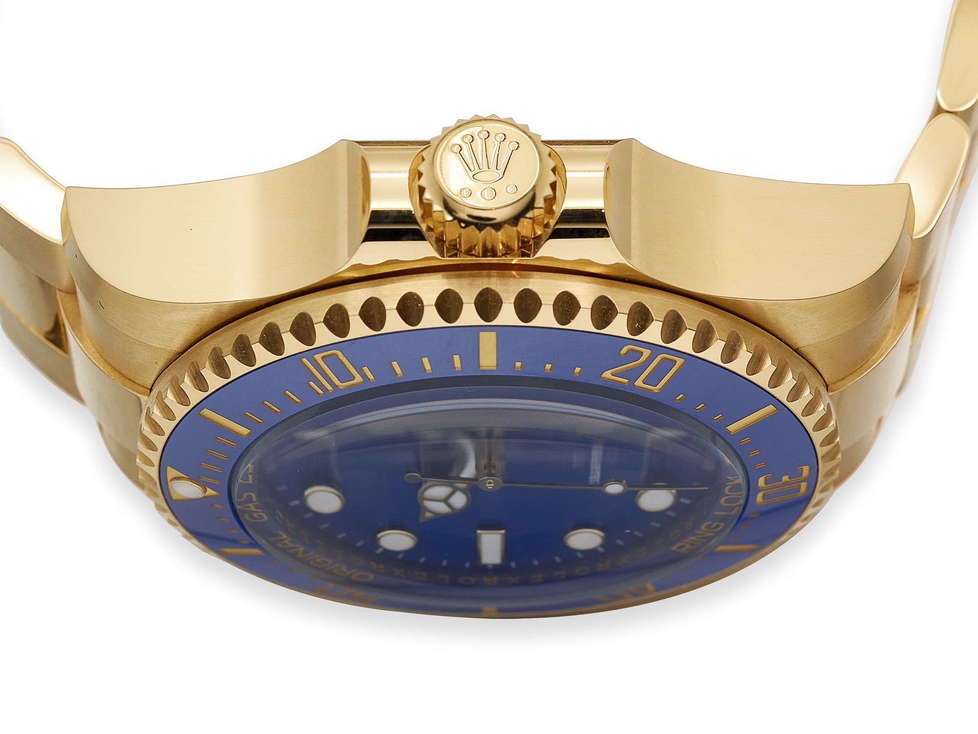 Yellow gold case, diameter 44mm, blue Cerachrom ceramic bezel, screw-down crown, sapphire crystal, blue lacquer dialCaliber 3235 automatic movement, 31 jewels, frequency 28,800 vph, power reserve 70 hoursyellow gold Oyster braceletOysterlock folding safety clasp, water resistance 3900 meters.