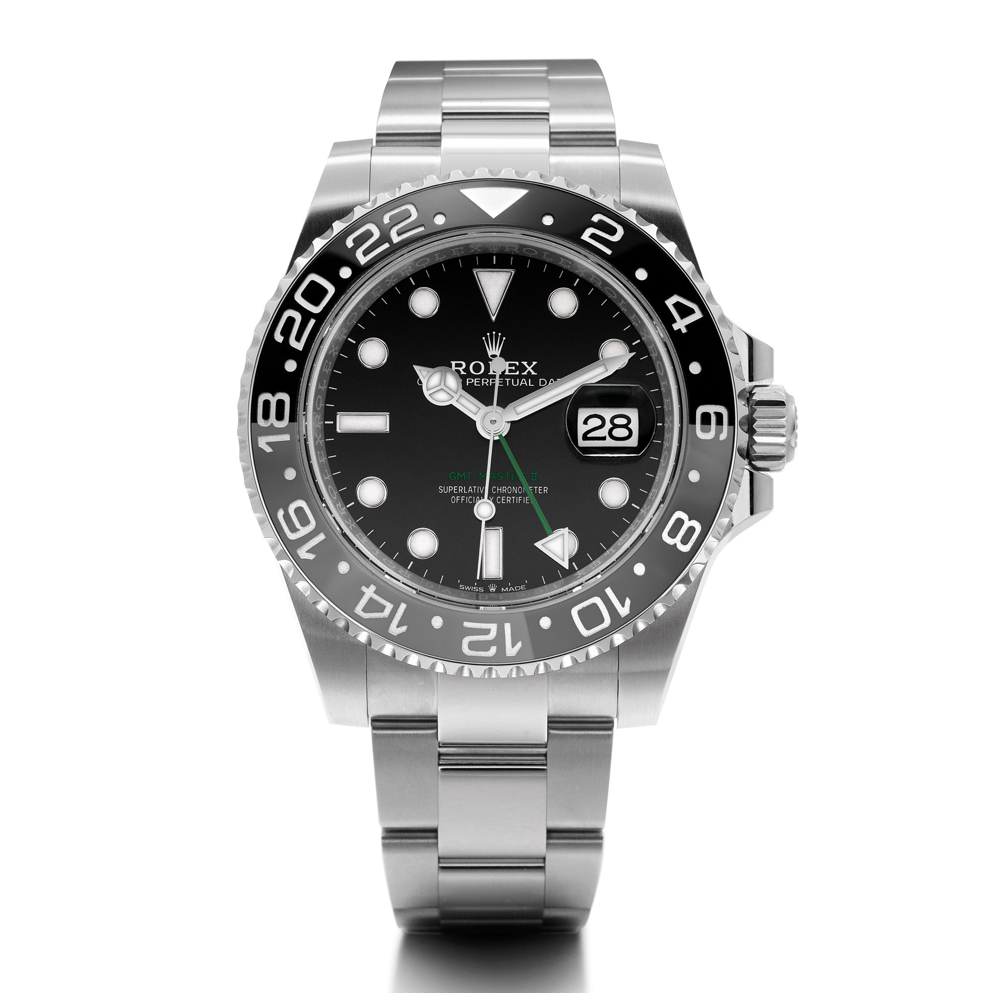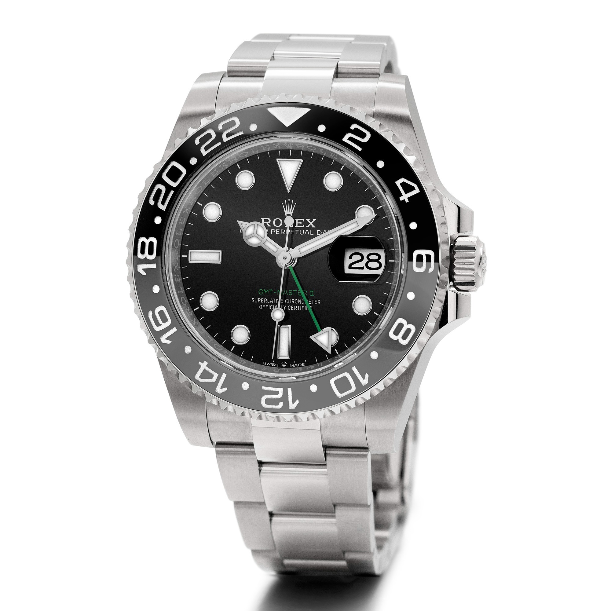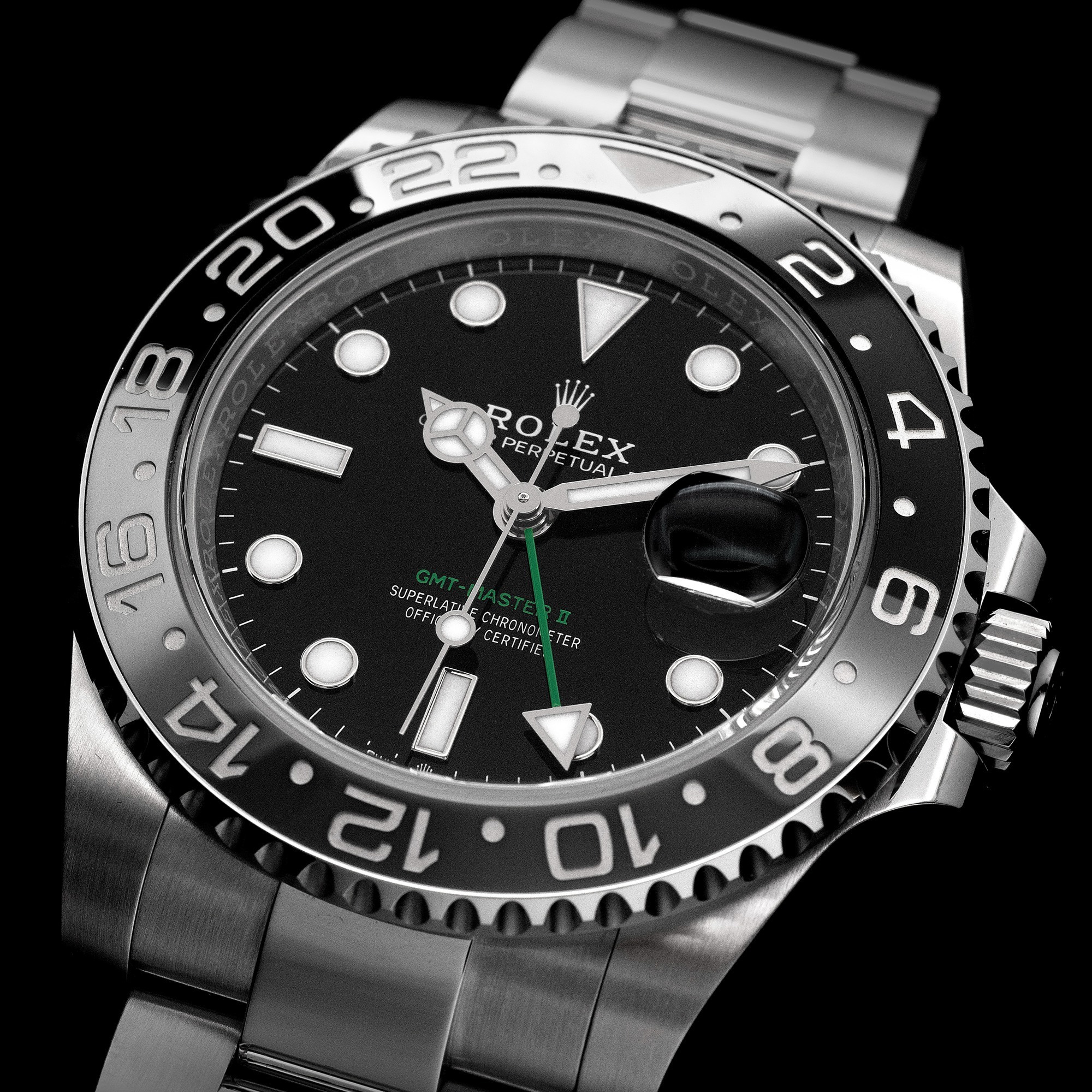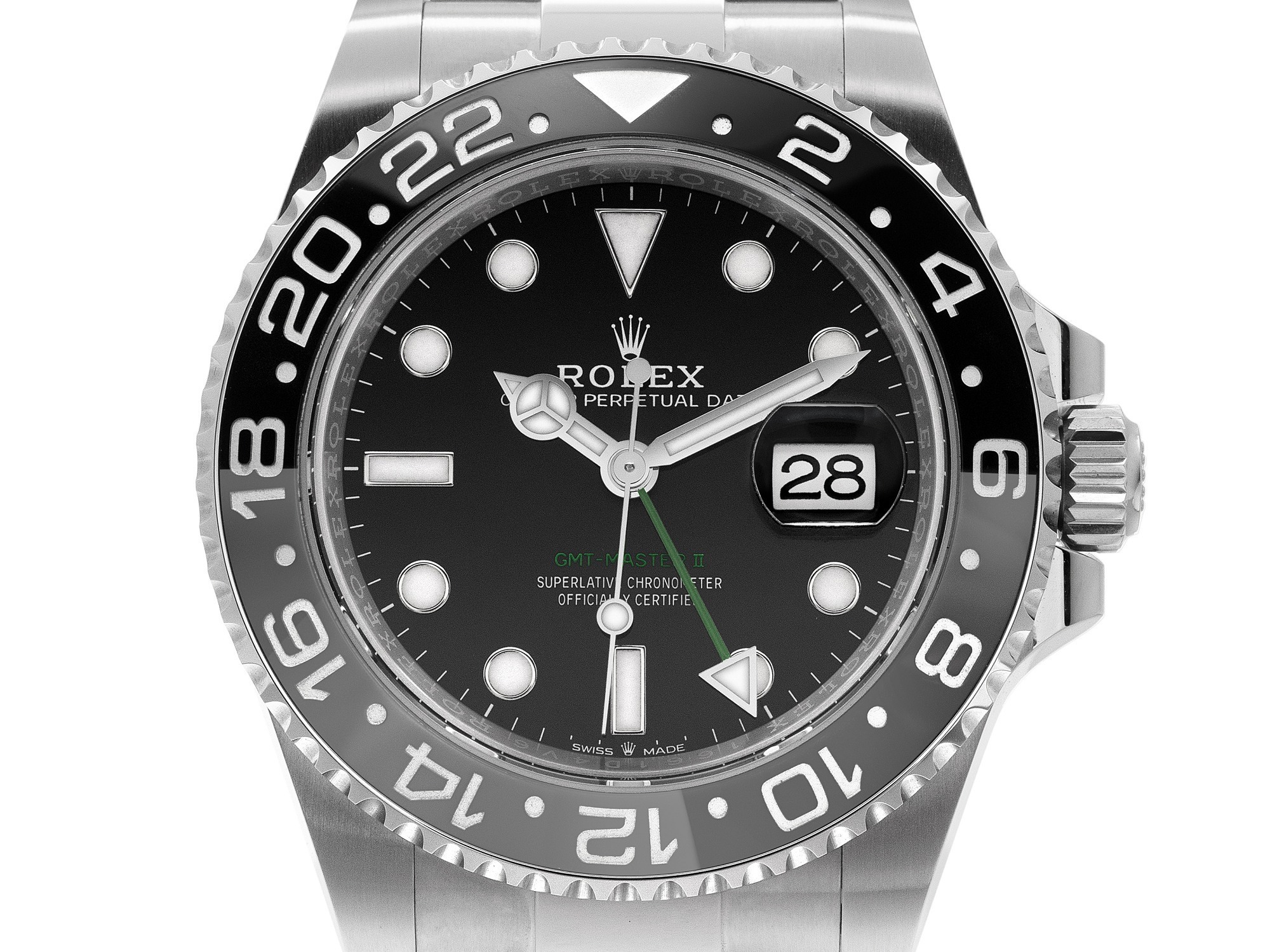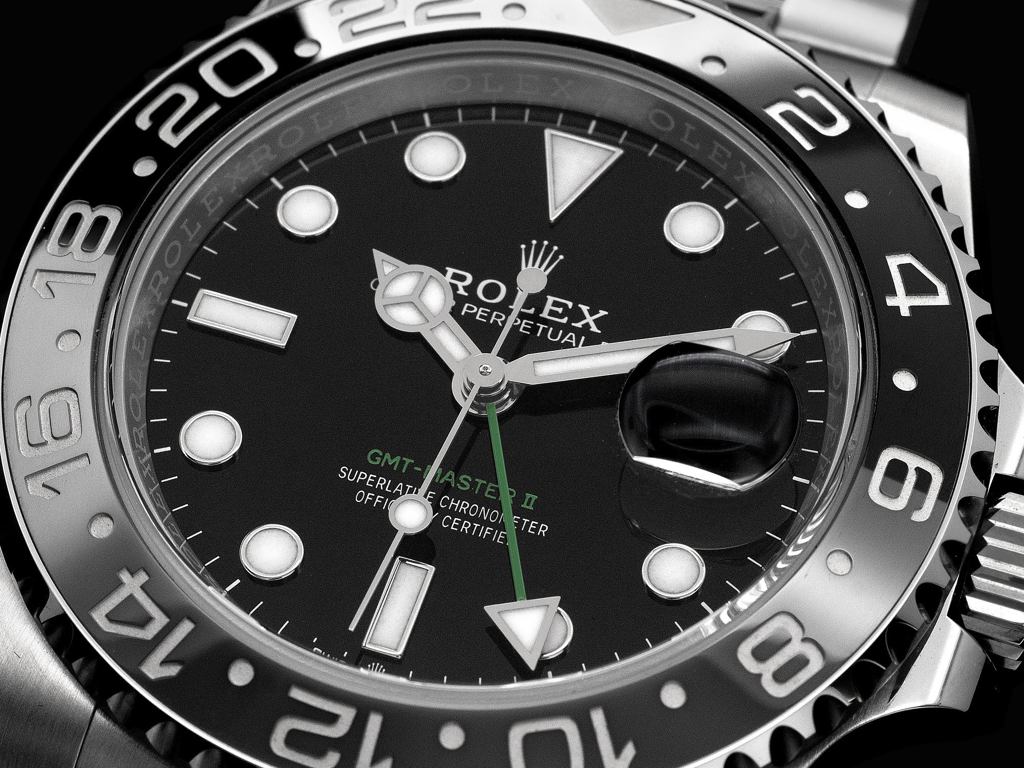 The dial retains the classic black lacquer finish, with the second time zone hand and the “GMT-Master II” inscription at 6 o’clock rendered in green—making this the only stainless steel GMT-Master II with colored dial text to date. The white gold hands and applied hour markers feature Chromalight luminescence, and the date window at 3 o’clock includes a cyclops lens for easy reading.