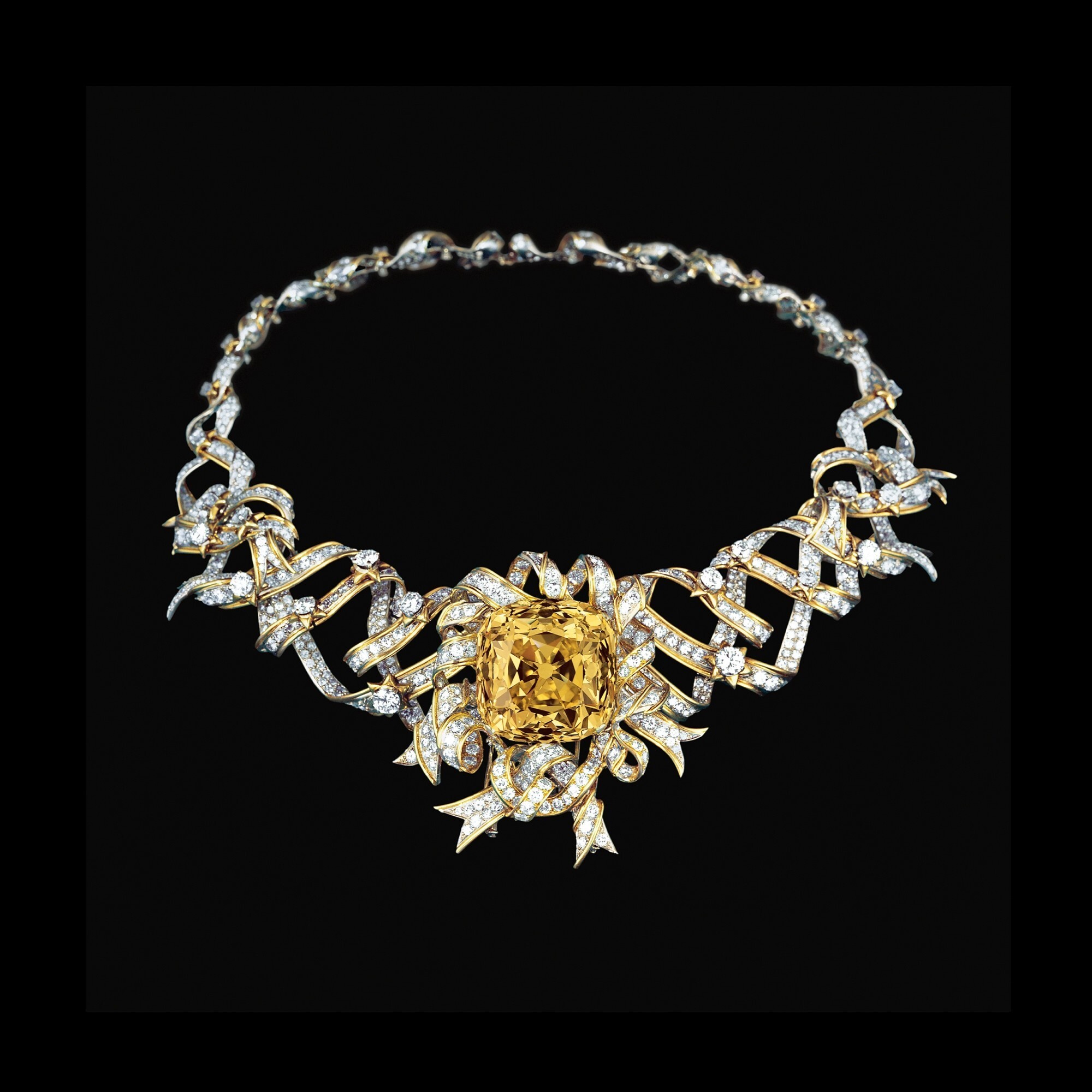 The Tiffany Diamond is one of the largest yellow diamonds ever discovered. Unearthed in 1877 from the Kimberley Mine in South Africa, the rough stone weighed 287.42 carats (57.484 g). After being expertly cut, it became a 128.54-carat cushion-shaped yellow diamond with 82 facets, radiating extraordinary brilliance. Throughout history, only two women have ever worn this magnificent gem — Mrs. Mary Whitehouse, a prominent socialite, and Audrey Hepburn, who famously wore it in the promotional photos for Breakfast at Tiffany’s. Over the years, The Tiffany Diamond has been mounted in four different settings, two of which were original creations by the legendary designer Jean Schlumberger: the Ribbon Rosette necklace featured in Breakfast at Tiffany’s (1961) and the iconic Bird on a Rock design showcased during Schlumberger’s 1995 retrospective at the Musée des Arts Décoratifs in Paris. From April 18 to September 23, 2007, Tiffany & Co. loaned the diamond to the Smithsonian National Museum of Natural History in Washington, D.C., where curator Jeffrey E. Post described it as “the largest diamond ever exhibited in the United States.” By comparison, the famous Hope Diamond weighs only 45.5 carats—about one-third the size of the Tiffany Diamond. In 2012, to celebrate Tiffany’s 175th anniversary, the diamond was reset into a platinum necklace adorned with over 120 carats of white diamonds. Its openwork setting, composed of 481 sparkling stones, allows light to pass through freely, illuminating the legendary yellow diamond in all its resplendent glory.