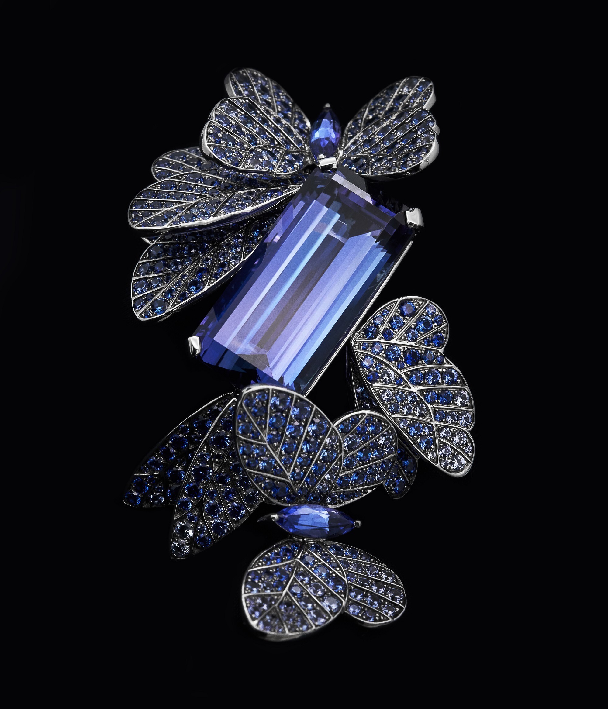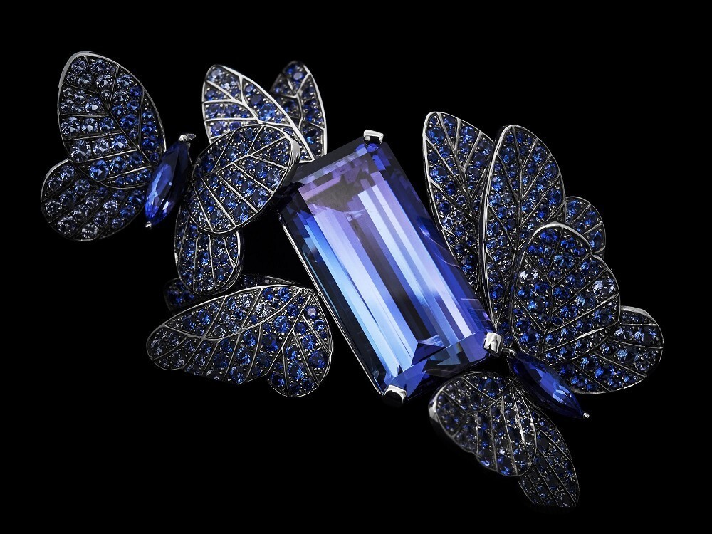 This brooch is part of Tiffany’s 2018 Blue Book High Jewelry collection, titled “The Four Seasons of Tiffany.” Inspired by the lightness of summer and the fleeting grace of butterflies, the piece captures the vibrancy of nature in full bloom. A group of butterflies seems to flutter in from different directions, encircling a single tanzanite at the center — a vivid scene of midsummer abundance.