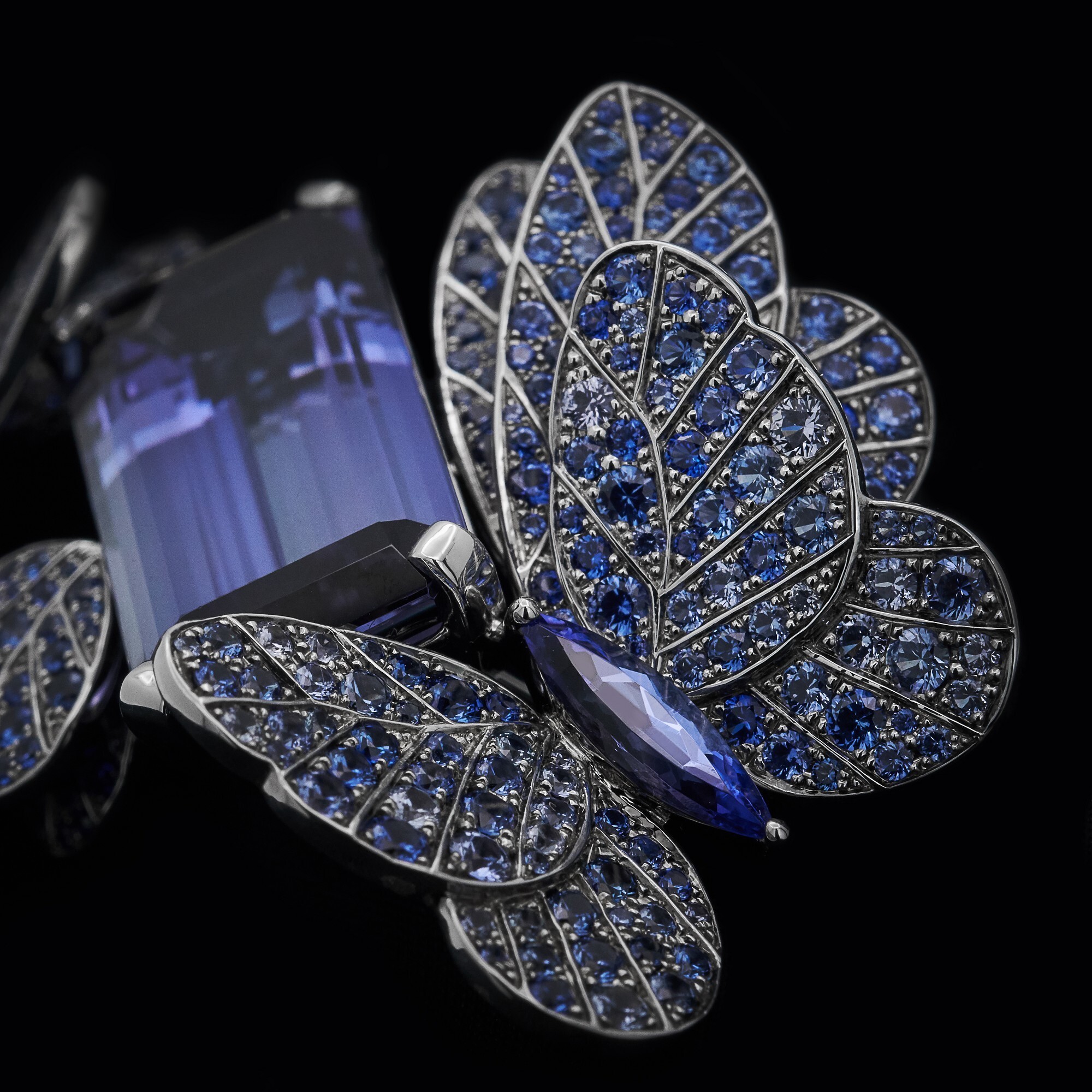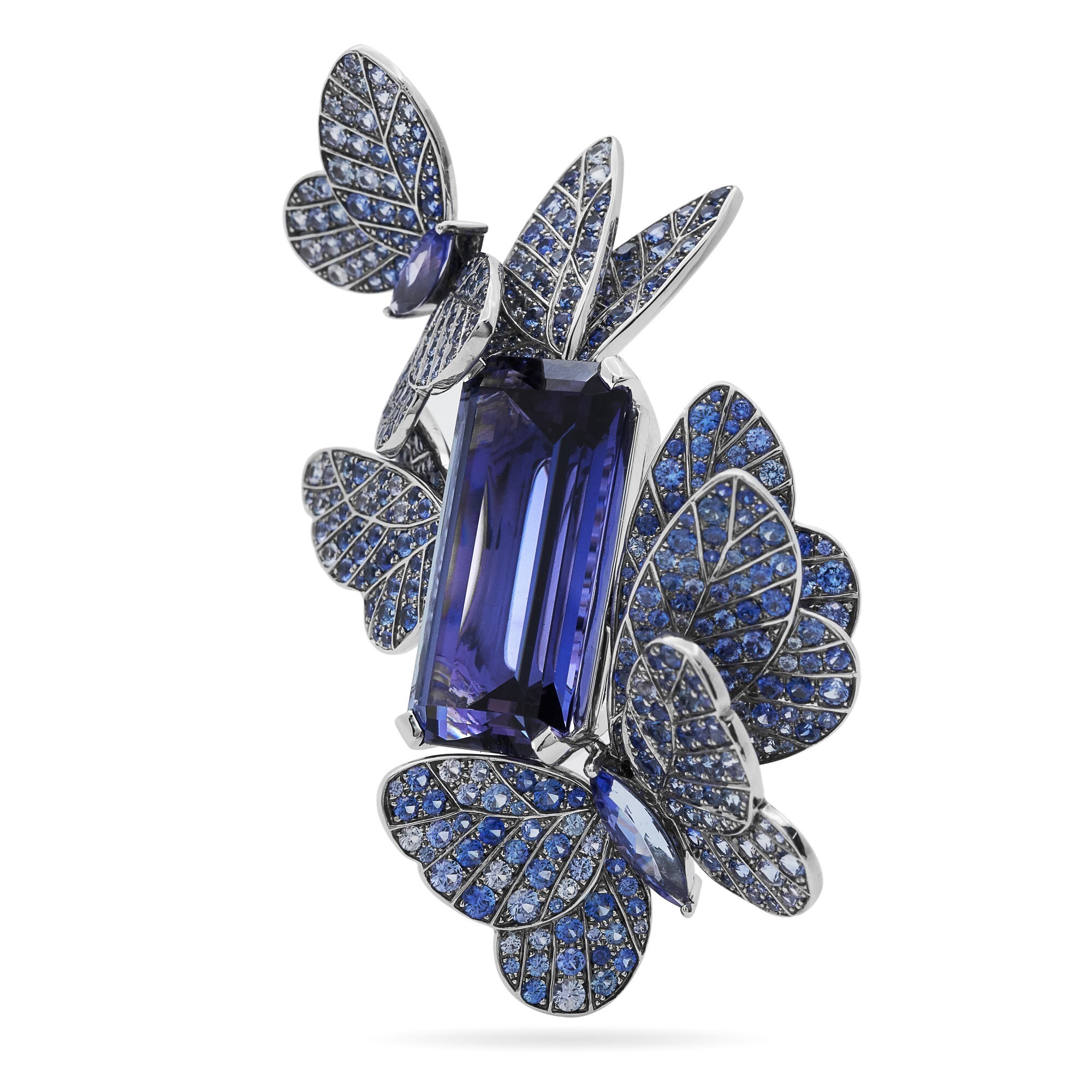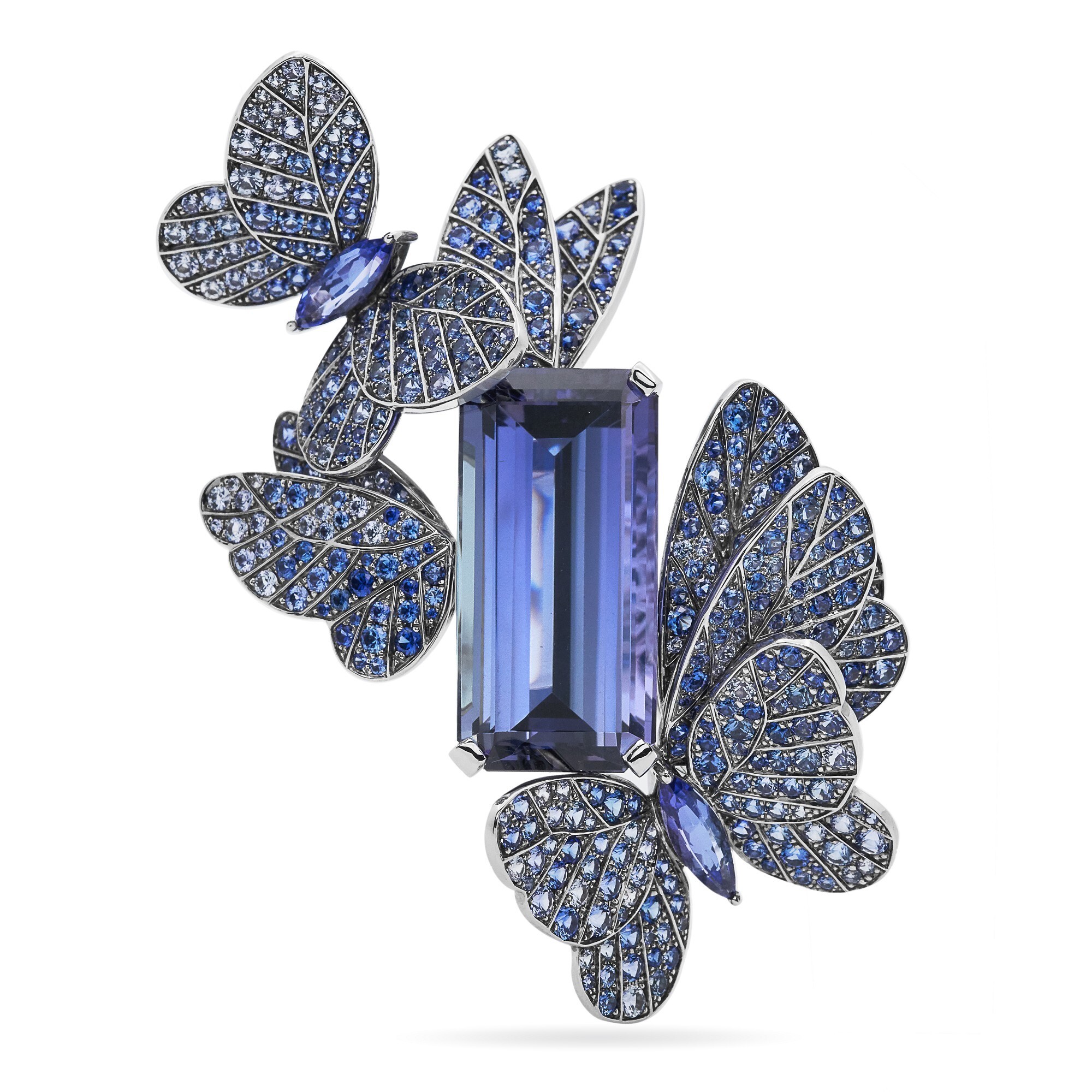 Around the central gem rest five butterflies in various postures — wings outstretched or gently closed — arranged diagonally to form a harmonious visual balance. Each butterfly’s body is set with marquise-cut sapphires, while the wings are pavé-set with round sapphires, outlined in platinum to accentuate the delicate wing structure. Subtle tonal variations among the sapphires echo the tricolored brilliance of the central tanzanite.