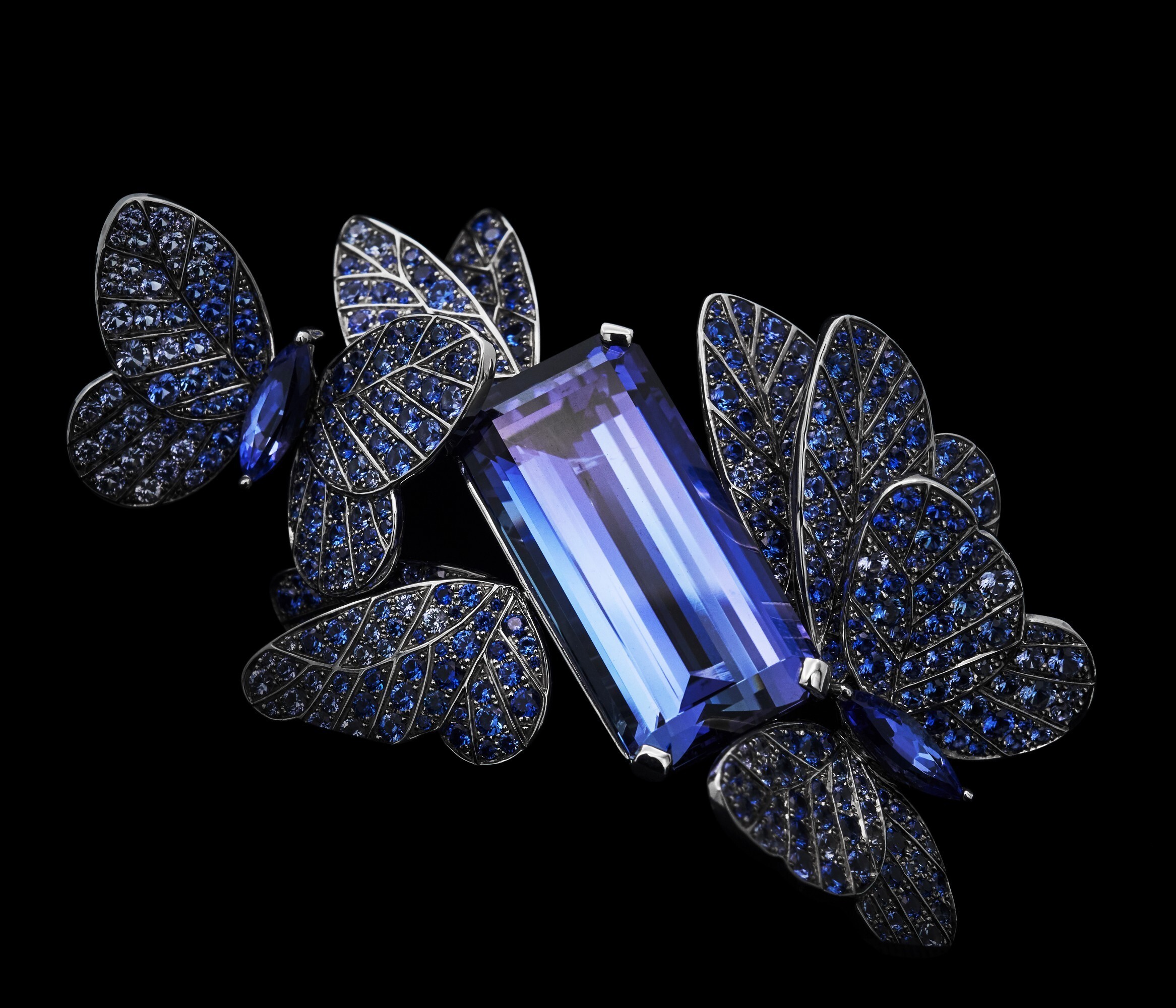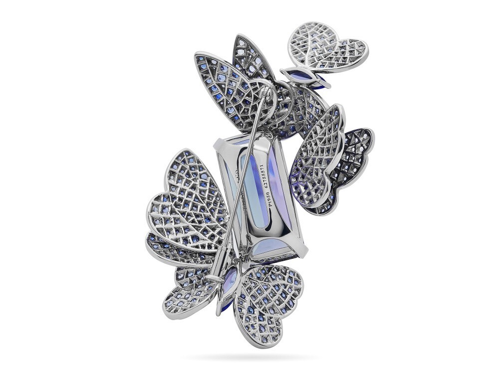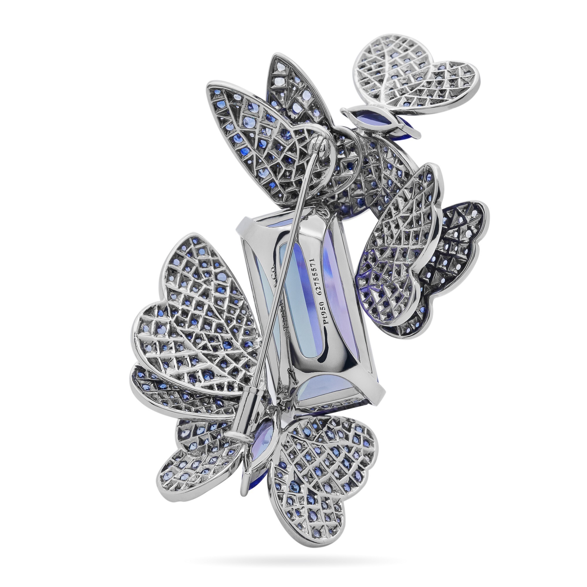Around the central gem rest five butterflies in various postures — wings outstretched or gently closed — arranged diagonally to form a harmonious visual balance. Each butterfly’s body is set with marquise-cut sapphires, while the wings are pavé-set with round sapphires, outlined in platinum to accentuate the delicate wing structure. Subtle tonal variations among the sapphires echo the tricolored brilliance of the central tanzanite.