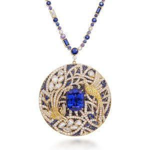 This exquisite tanzanite pendant necklace is part of Tiffany’s 2017 Blue Book High Jewelry Collection, The Art of the Wild.The theme, “Feathered Cloak,” captures the vivid image of a bird soaring freely through the rainforest — a poetic harmony of motion and color where golden feathers contrast strikingly with the cool blue-violet glow of tanzanite.