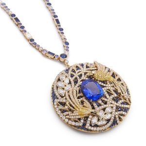 The pendant’s most captivating feature lies in its multi-layered rainforest backdrop, which creates remarkable depth and dimension. The upper layer, crafted in white gold and set with diamonds, outlines interlacing tree branches adorned with marquise- and pear-shaped diamond leaves. Beneath it, the lower layer shimmers with round blue sapphires, forming a subtle background that mirrors the tanzanite’s ethereal blue-violet hues, completing this enchanting vision of nature in motion.