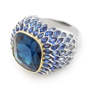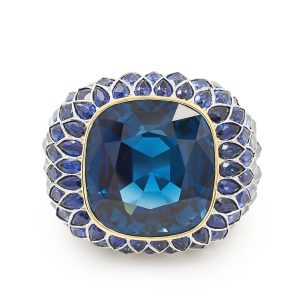 This ocean-toned ring from Tiffany’s latest Blue Book collection centers on a vivid blue tourmaline, surrounded by sapphires that fade into colorless