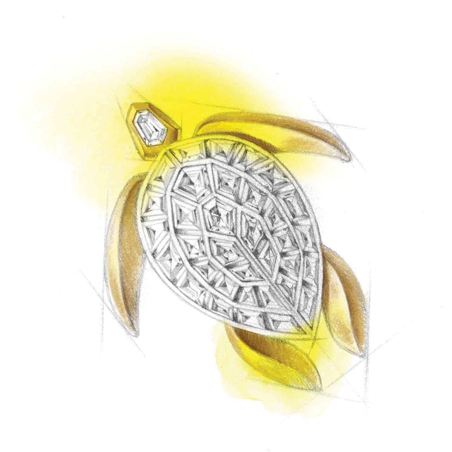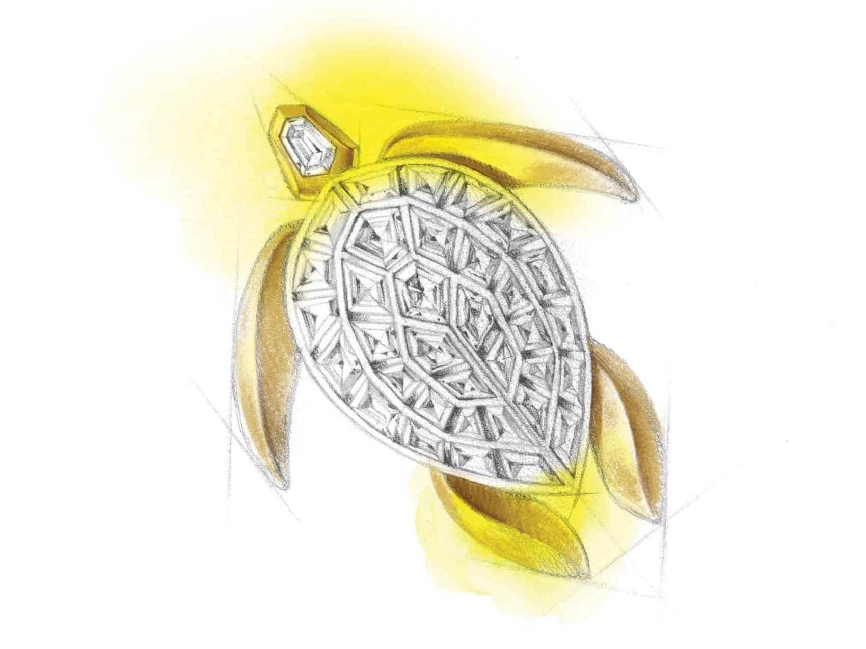 The turtle’s four flippers extend naturally from the body, crafted in gold with faceted surfaces to enhance dimensionality and reflect light naturally. The small head is designed with a geometric polygonal shape, centered with a hexagonal custom-cut diamond that harmonizes with the cracked-ice diamonds on the shell.