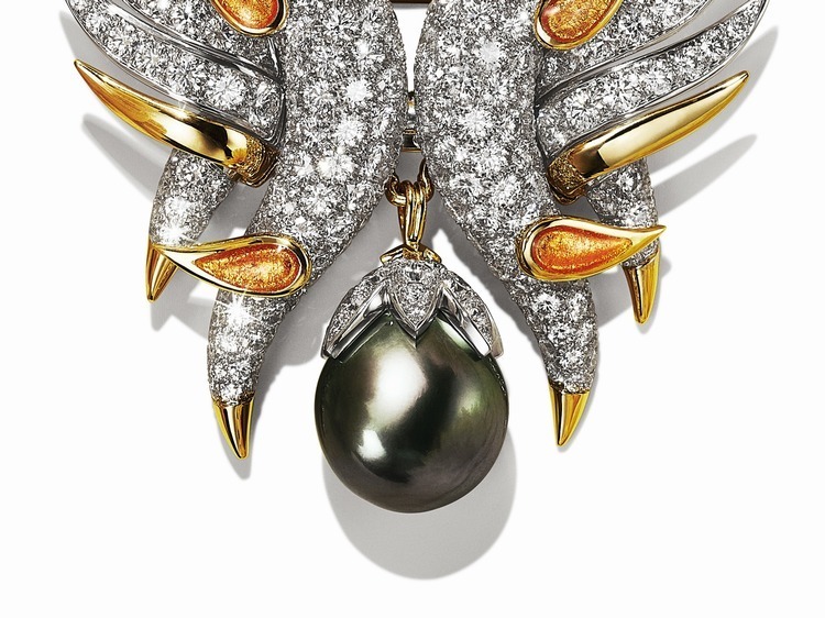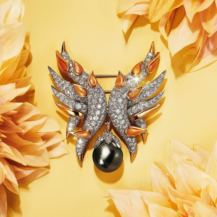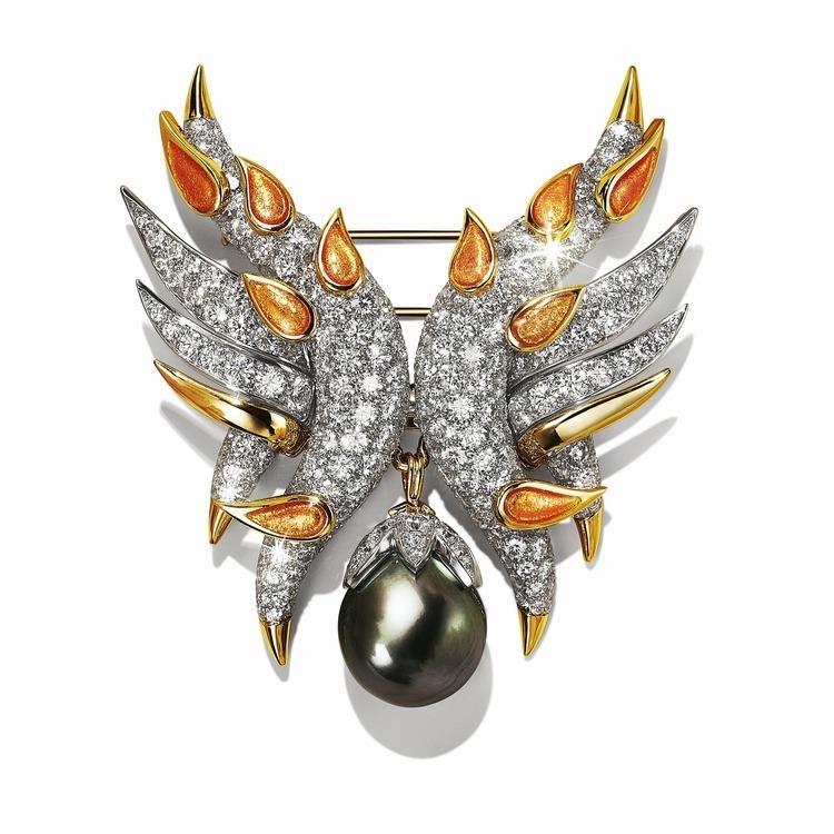 Presented as part of Tiffany & Co.’s 2022 Blue Book High Jewelry Collection, this Double Wing Black Pearl Brooch reinterprets Jean Schlumberger’s iconic “Double Wing” design. The new creation replaces the original blue enamel wings with radiant gold tones, while the white pearl is transformed into a South Sea black pearl, lending the piece a darker, more dramatic allure.