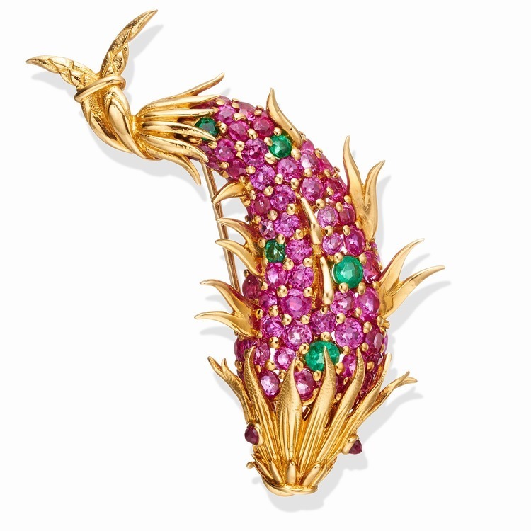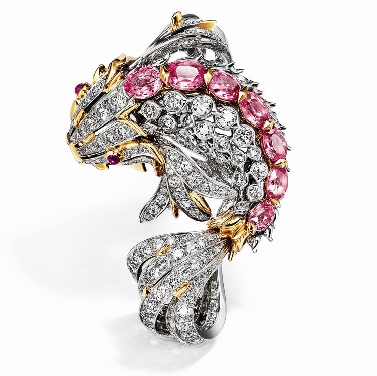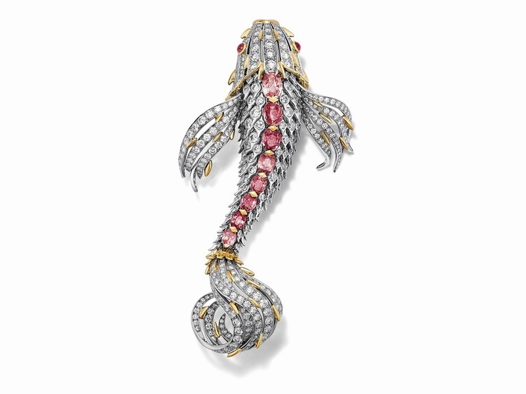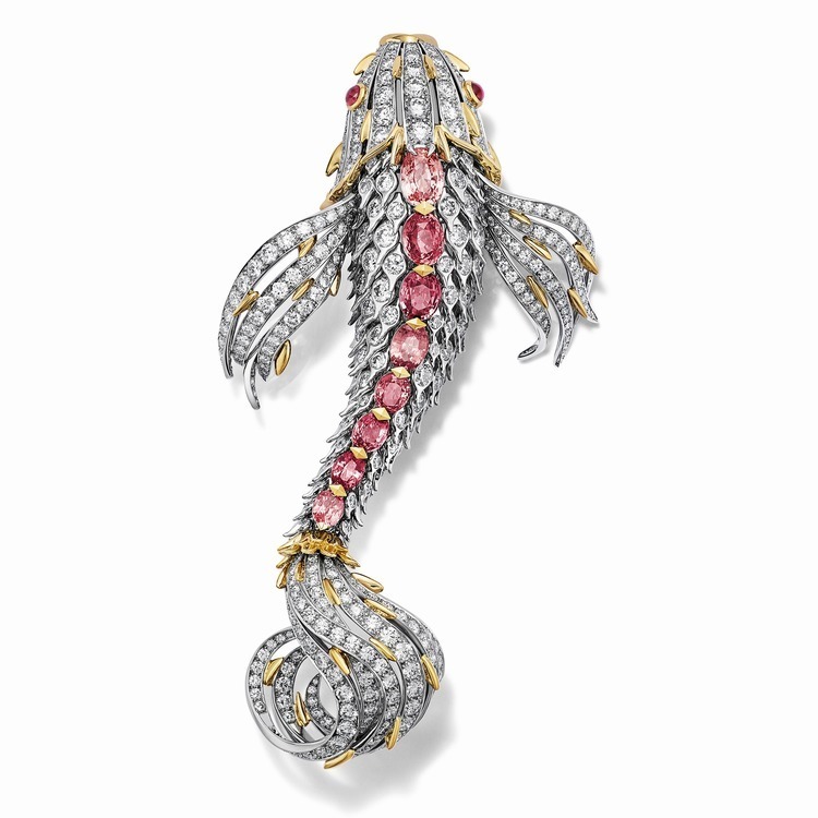 One brooch depicts a fish swimming forward. Its overlapping scales are set with brilliant round diamonds, and its dorsal fin is set with eight oval padparadscha sapphires, whose bright natural orange-pink hue is particularly captivating.
