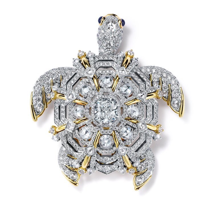 The brooch features white gold and diamond accents to outline the turtle’s shell in a geometric, naturally inspired pattern. At its center lies a pillow-cut diamond exceeding 4 carats, surrounded by eight rose-cut diamonds forming a shield motif. Eight gold filigree lines trace the shell’s texture, polished to a mirror-like brilliance that captures every flicker of light. The turtle’s head is adorned with a rose-cut diamond, while two curved sapphires serve as sparkling eyes, infusing the piece with charm and vitality.