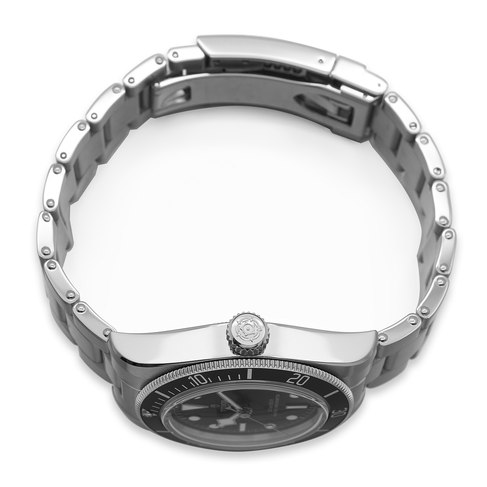 The 41mm stainless steel case is finished with a brushed surface, while the polished bevels on the lugs add visual depth. The unidirectional rotating bezel features a black aluminum dive-scale insert, and the watch is water-resistant to 200 meters. The matte black dial continues the signature design codes introduced with the third-generation Black Bay in 2023, including the tapered minute hand and lollipop seconds hand. With no date window, the watch emphasizes a straightforward, utilitarian character.