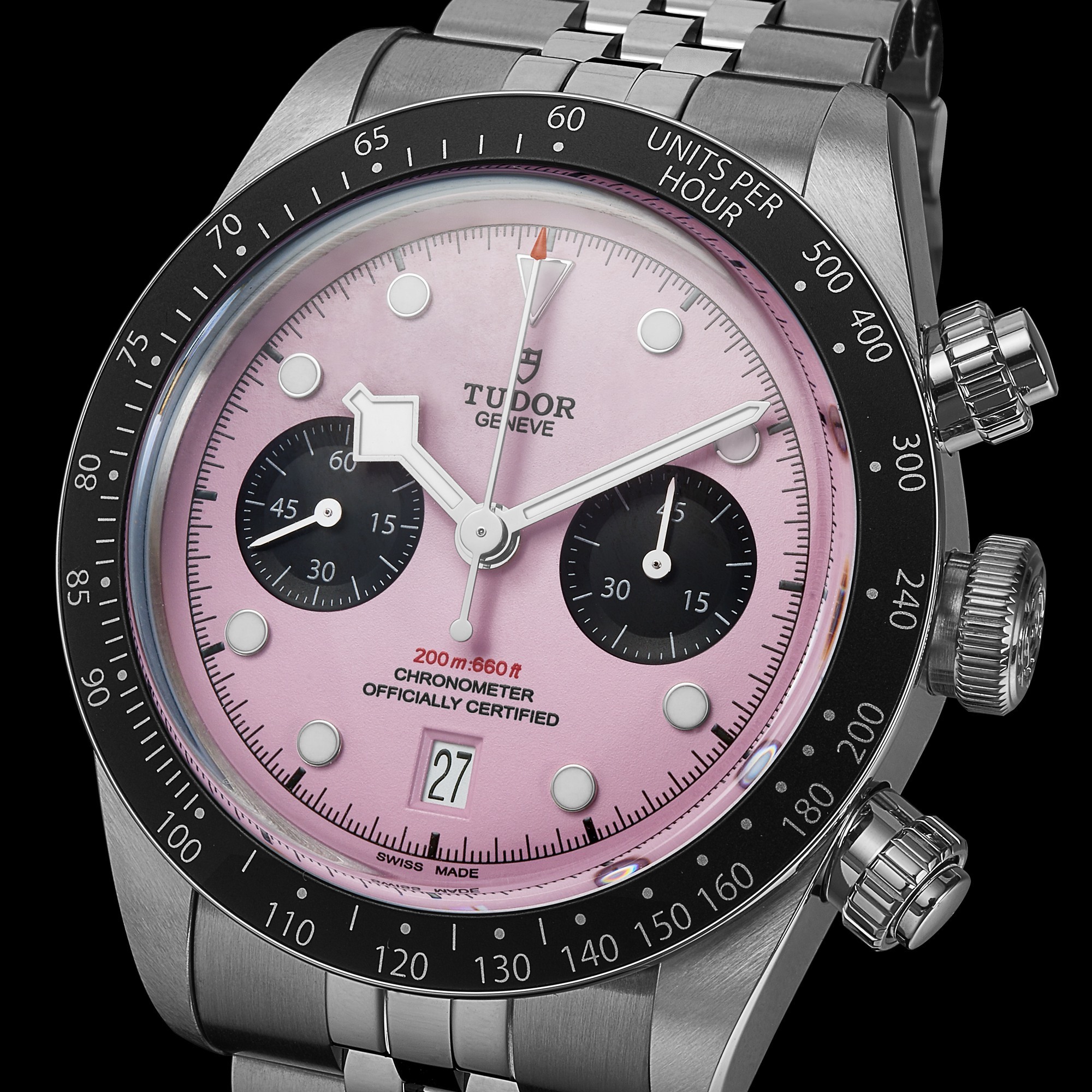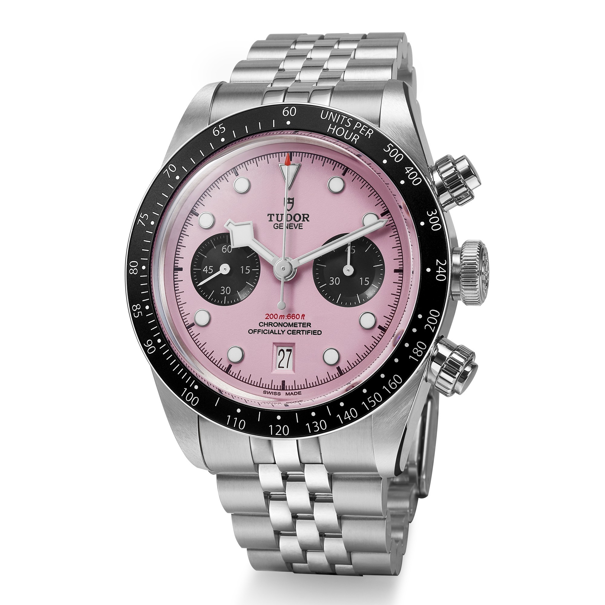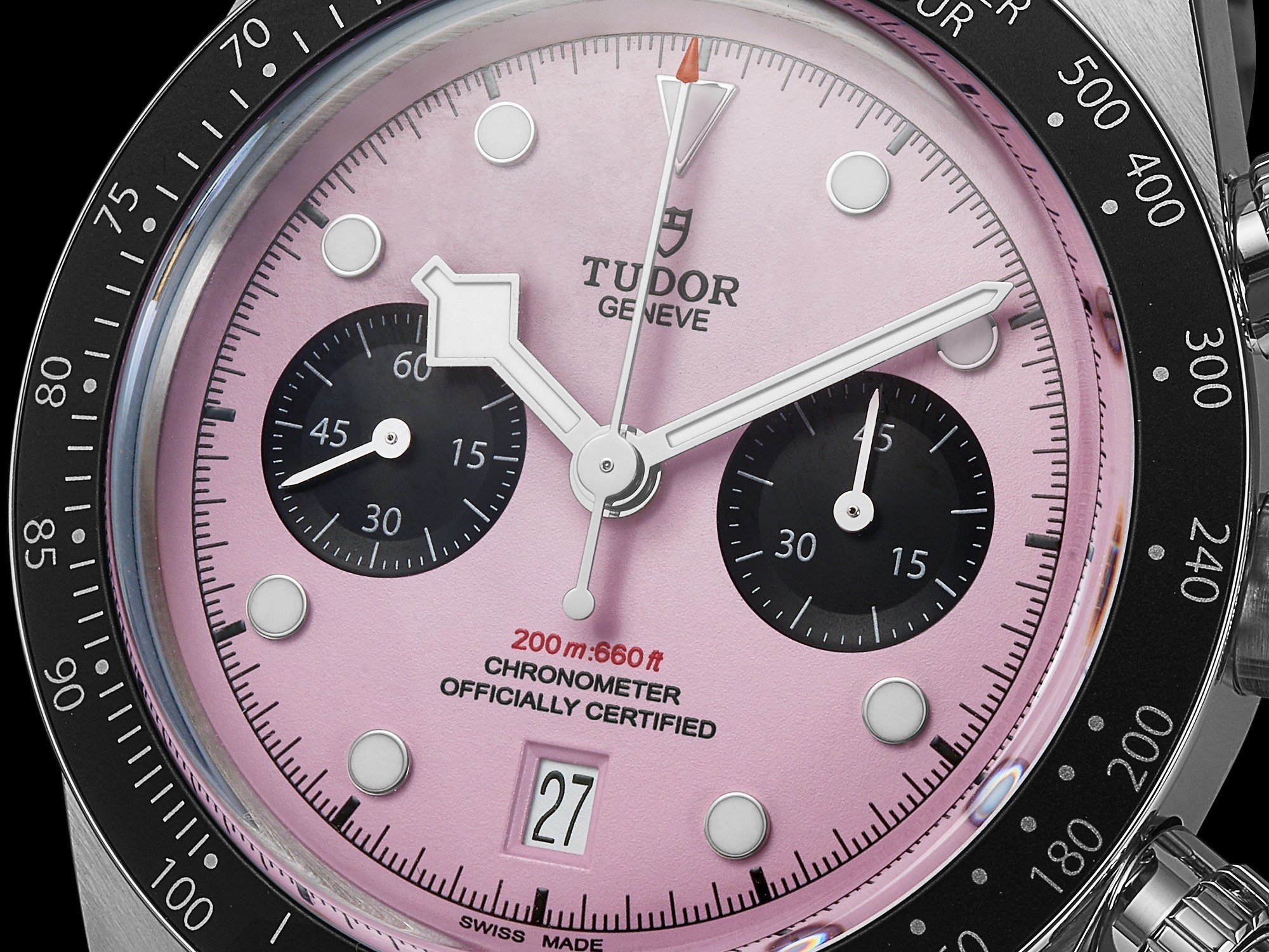 The new model features a 41mm stainless steel case with a combination of brushed and polished finishes, paired with a black anodized aluminum tachymeter bezel. The pink dial features a satin-brushed finish, perfectly complementing the two black sub-dials in a “Pink Panda” color scheme, whose understated texture is particularly captivating. The hour markers and classic snowflake hands are coated with white luminescent material, while the tip of the central chronograph seconds hand is highlighted in red.