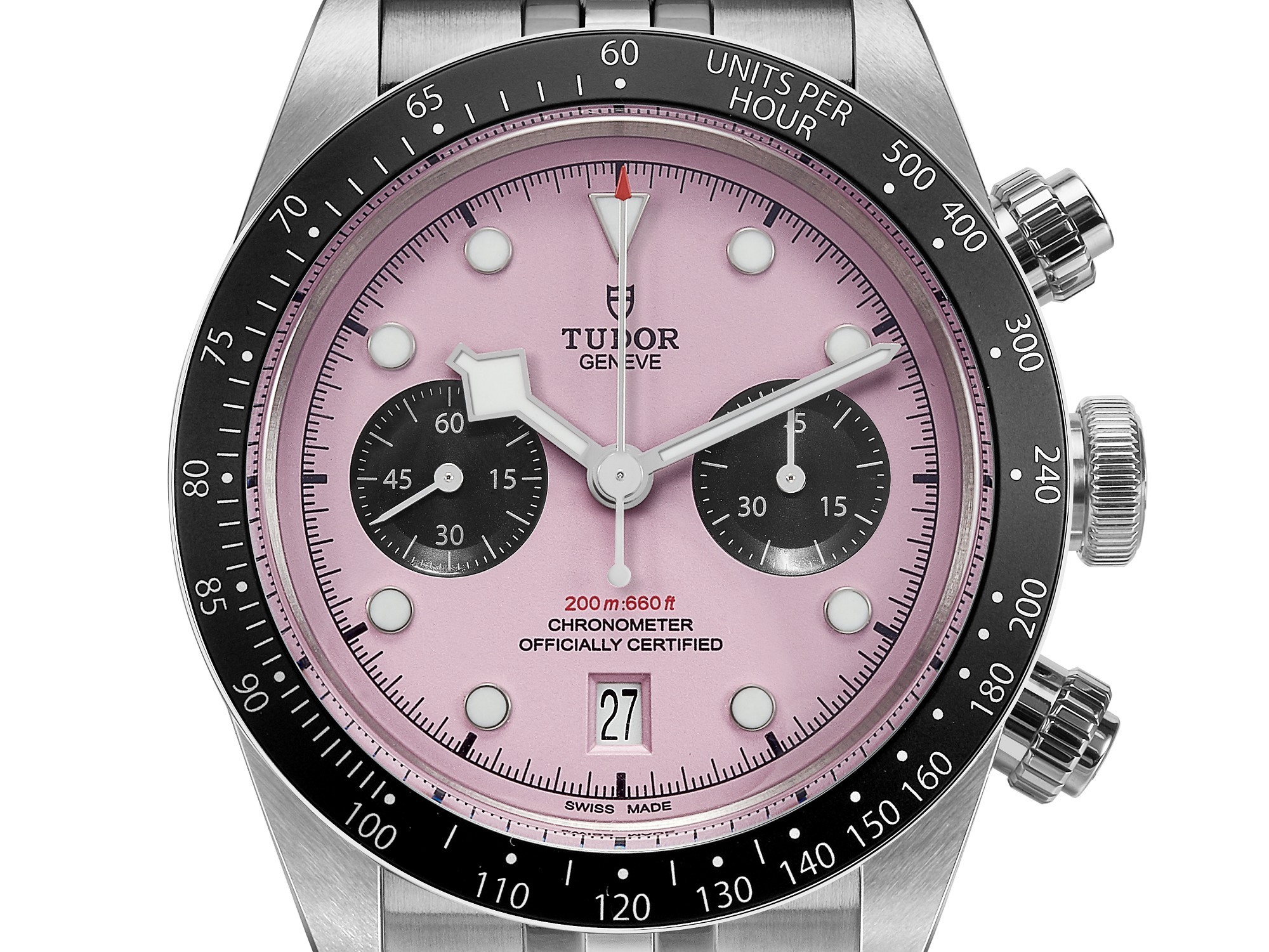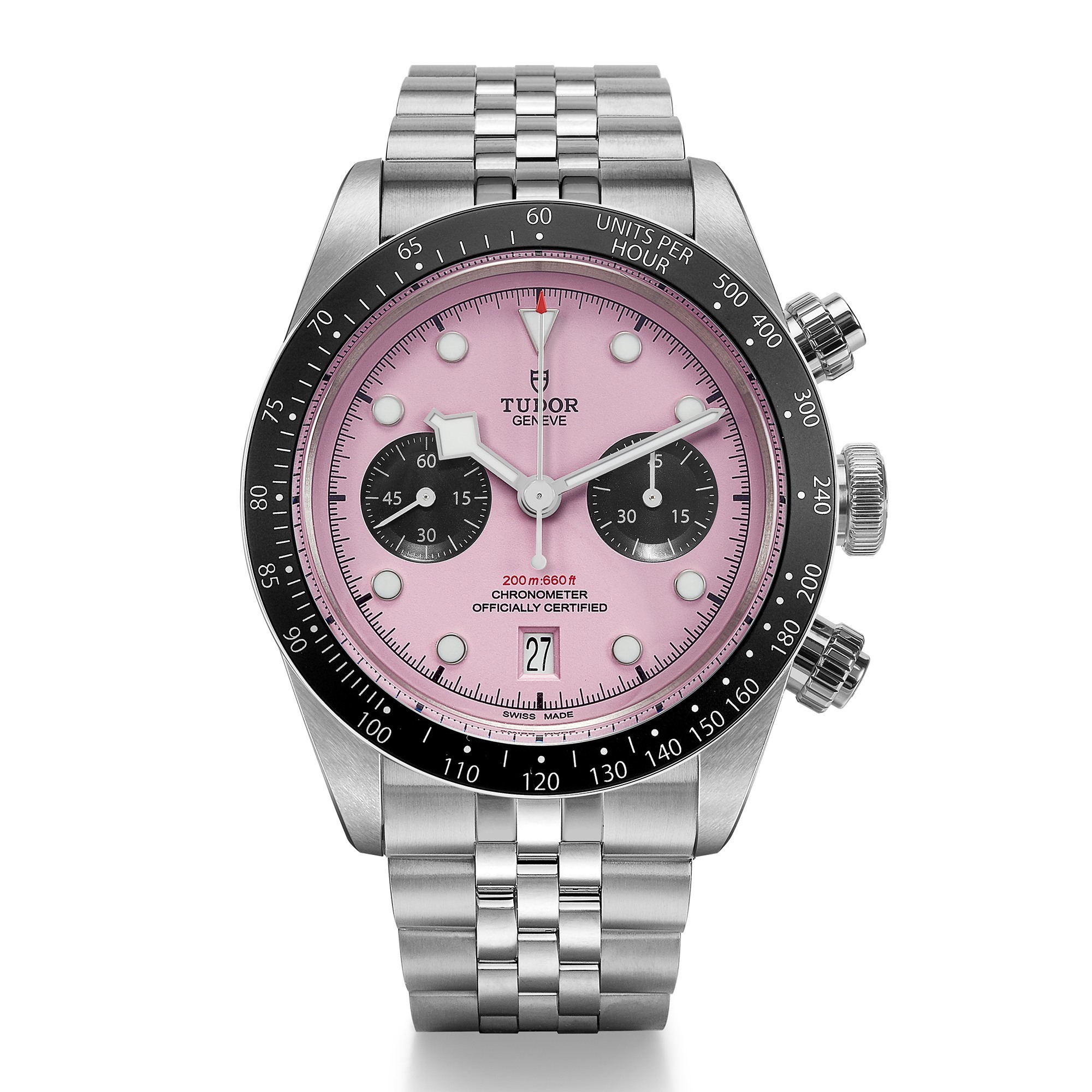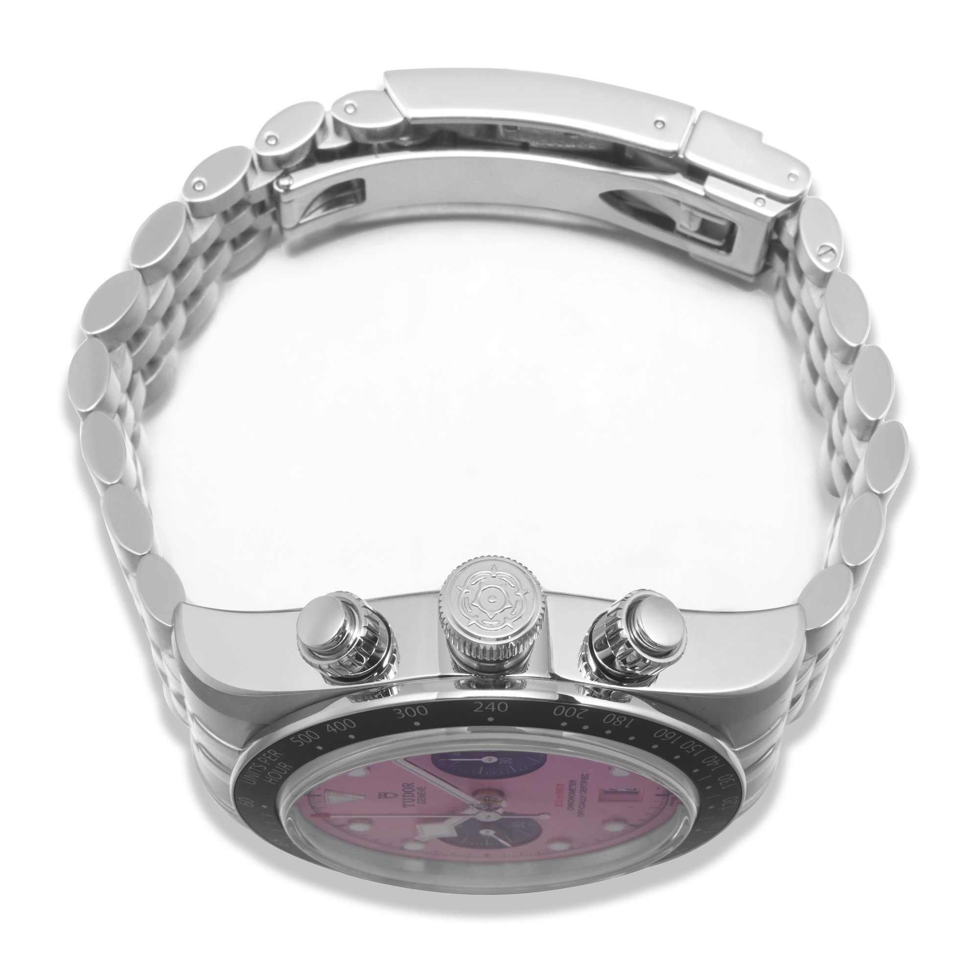 The new model features a 41mm stainless steel case with a combination of brushed and polished finishes, paired with a black anodized aluminum tachymeter bezel. The pink dial features a satin-brushed finish, perfectly complementing the two black sub-dials in a “Pink Panda” color scheme, whose understated texture is particularly captivating. The hour markers and classic snowflake hands are coated with white luminescent material, while the tip of the central chronograph seconds hand is highlighted in red.
