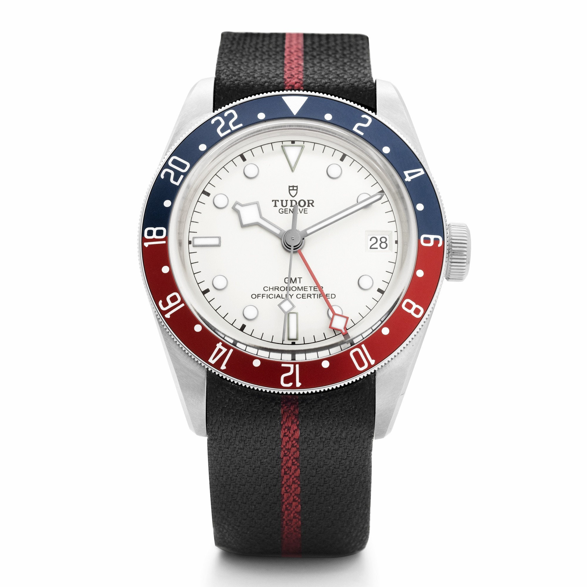 Stainless-steel case, 41 mm diameter,Red-and-blue bi-color 24-hour bezel,Screw-down crown,Sapphire crystal,Opaline (white) dial,Manufacture Calibre MT5652 automatic movement,28 jewels, 28,800 vph, 70-hour power reserve,Fabric strap with buckle,Water resistance: 200 m,Complication: GMT.