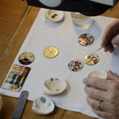 On a solid gold base, master craftsmen engrave perfectly symmetrical, repeating guilloché patterns as fine as one-tenth of a millimeter. Fine gold wires are then used to form the outlines that define the cloisonné cells, which are filled in stages with enamel of different hues. After each layer is fired in a kiln at around 800°C, the surface is polished before the next application. Through several meticulous repetitions, the enamel gradually attains greater depth and richness of color. Finally, a layer of transparent vitrified enamel is applied to protect the exquisite floral motif beneath.