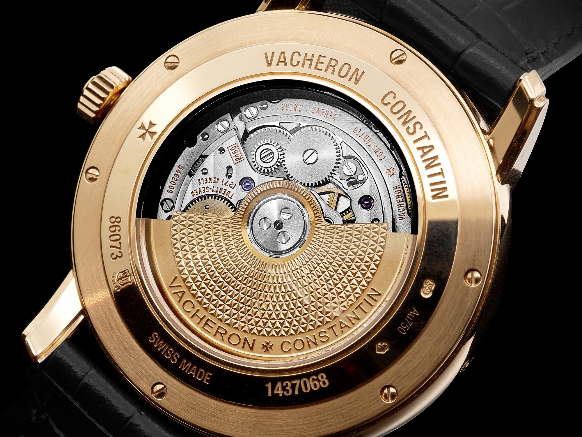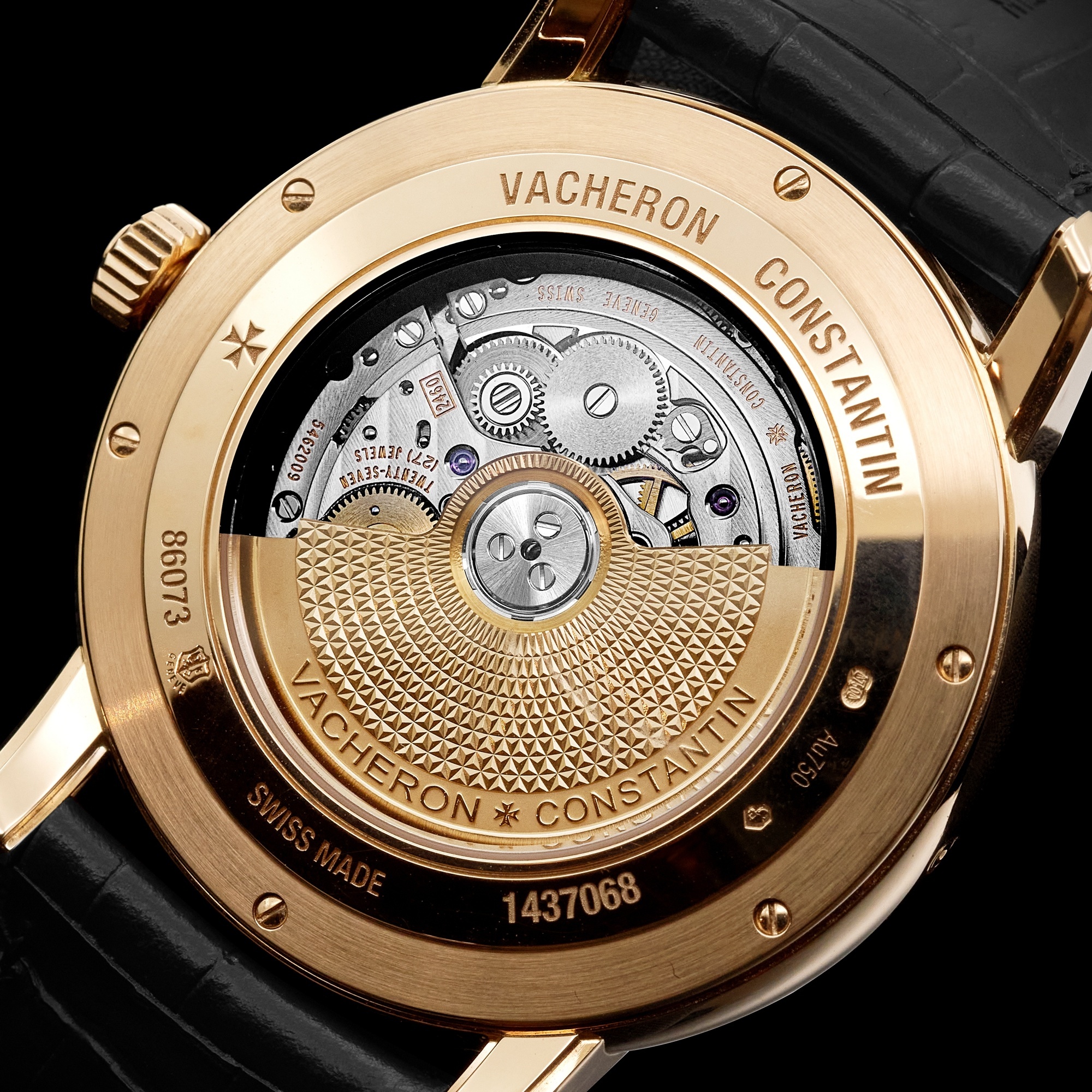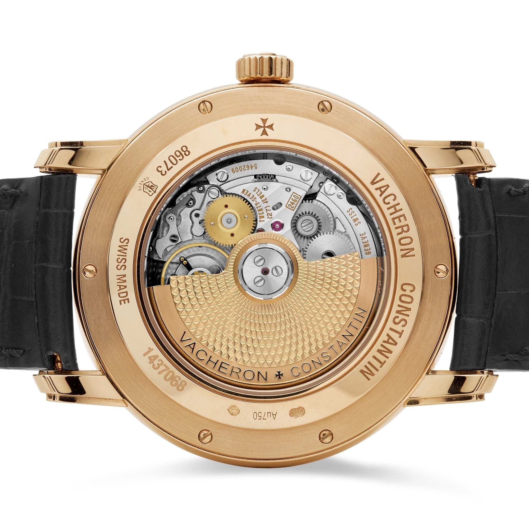 It is powered by the Caliber 2460 G4 self-winding movement, operating at 28,800 vibrations per hour and offering a 40-hour power reserve. The gold rotor, visible through the sapphire case back, is adorned with guilloché work inspired by the Maltese cross motif.