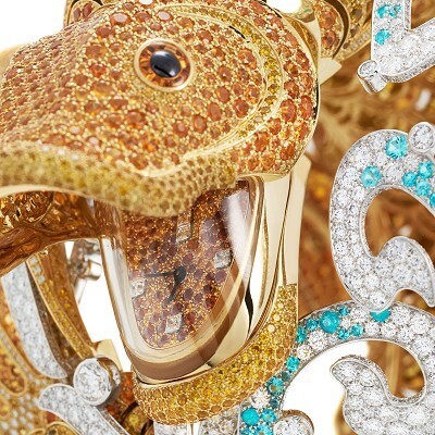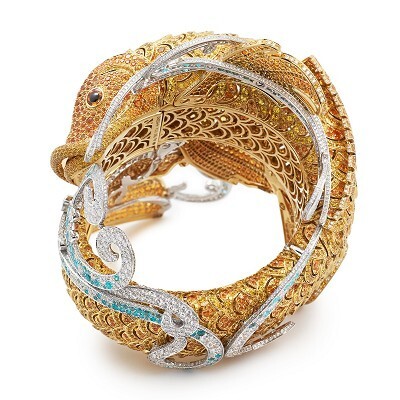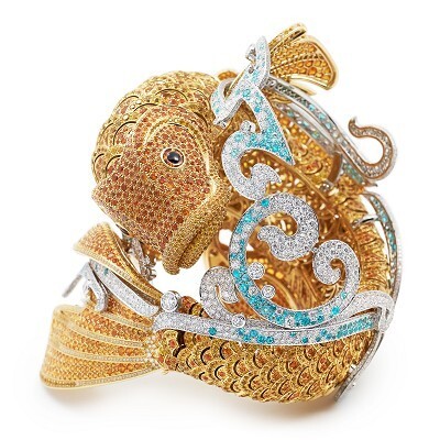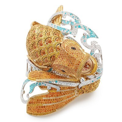 The gemstone-encrusted dial is cleverly hidden inside the fish’s mouth, and the hour markers at 3, 6, 9, and 12 o’clock are set with princess-cut diamonds. A gentle press on the fish’s tail opens the bracelet clasp, offering a seamless and elegant experience when wearing this intricate work of art.