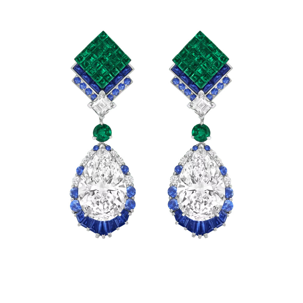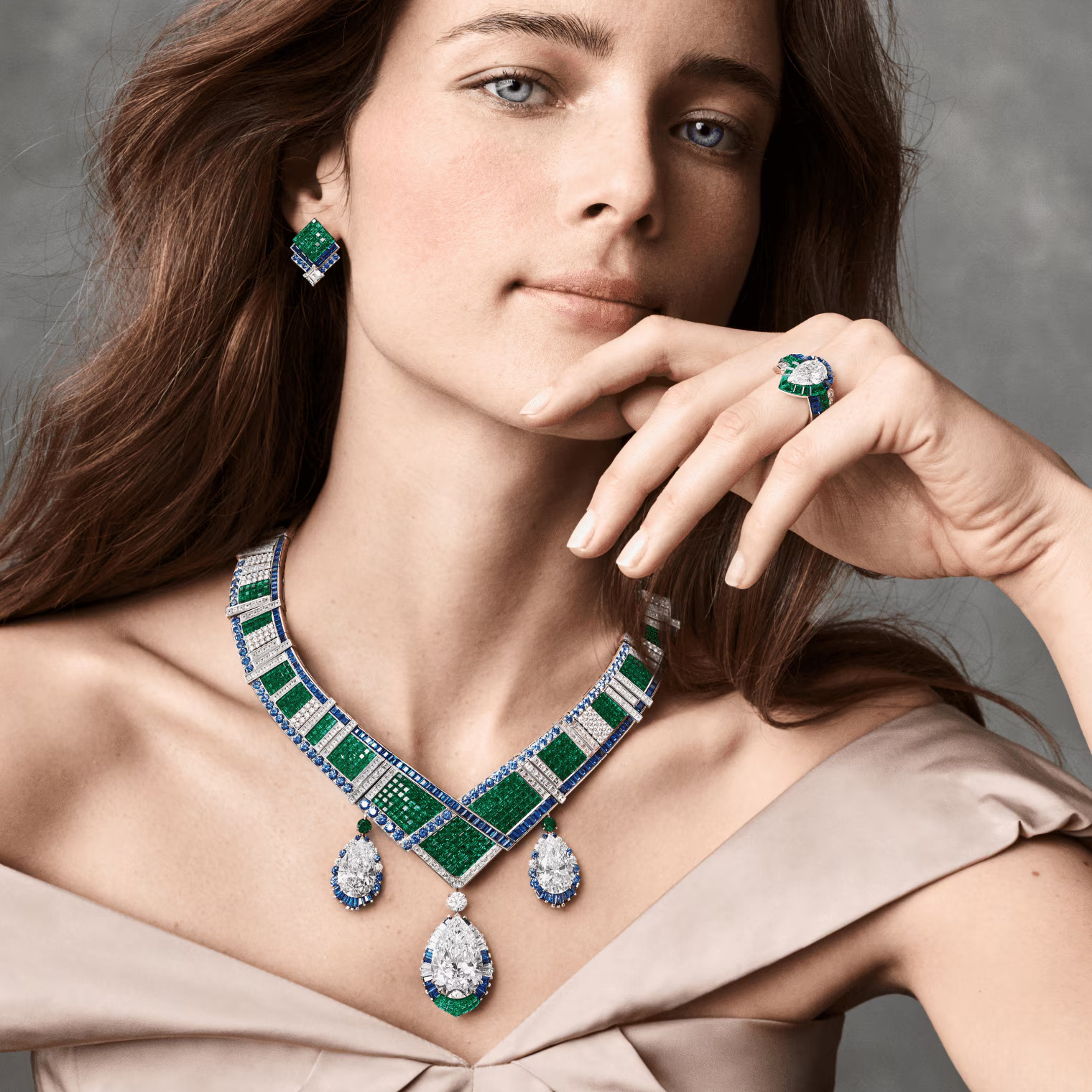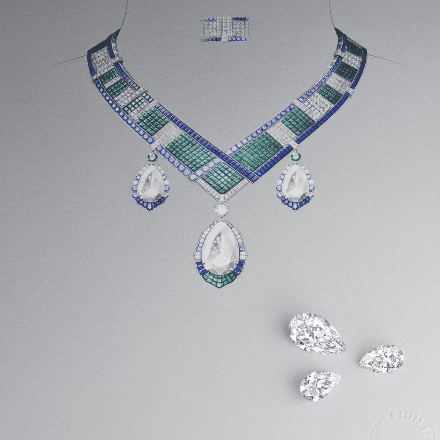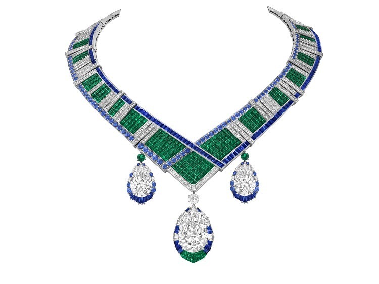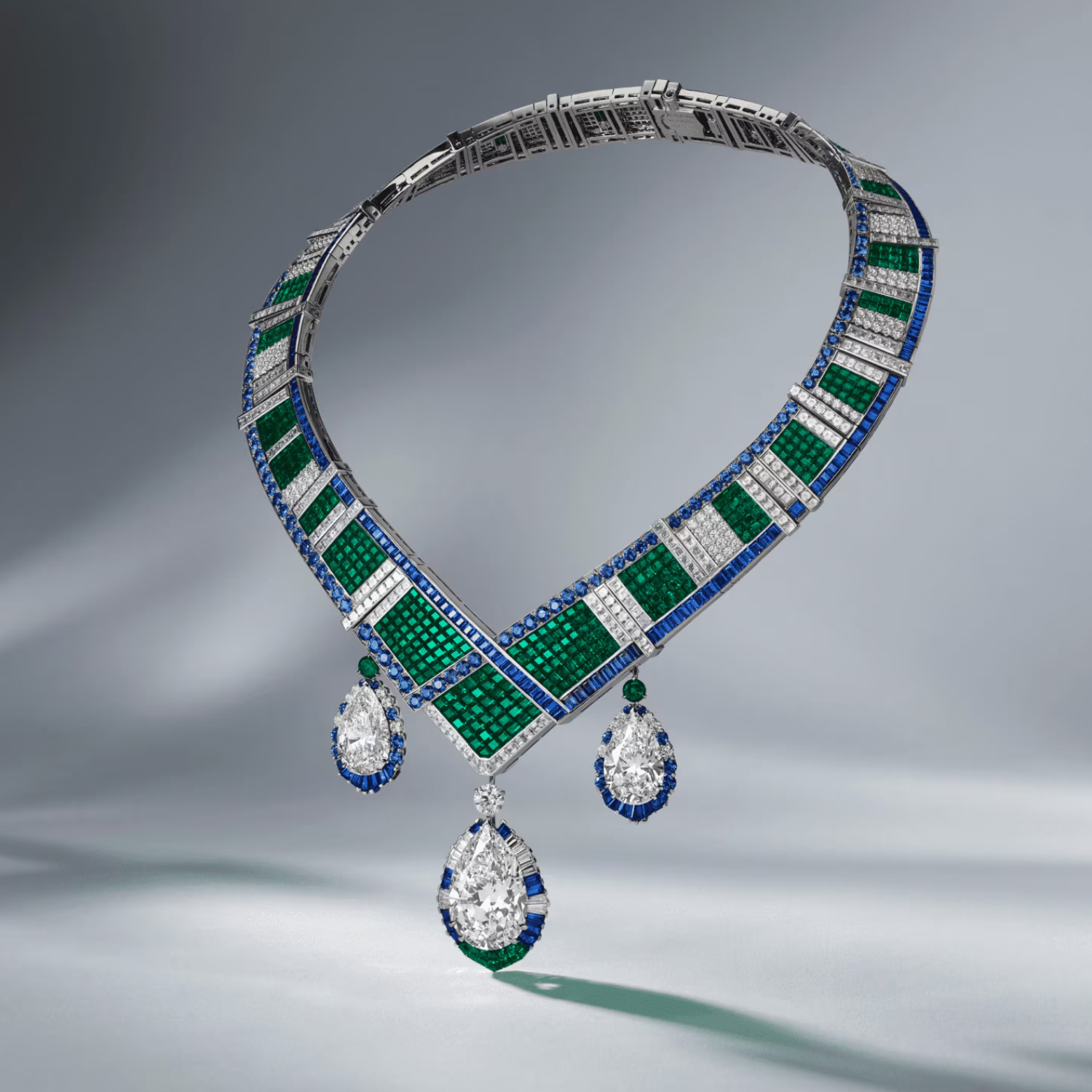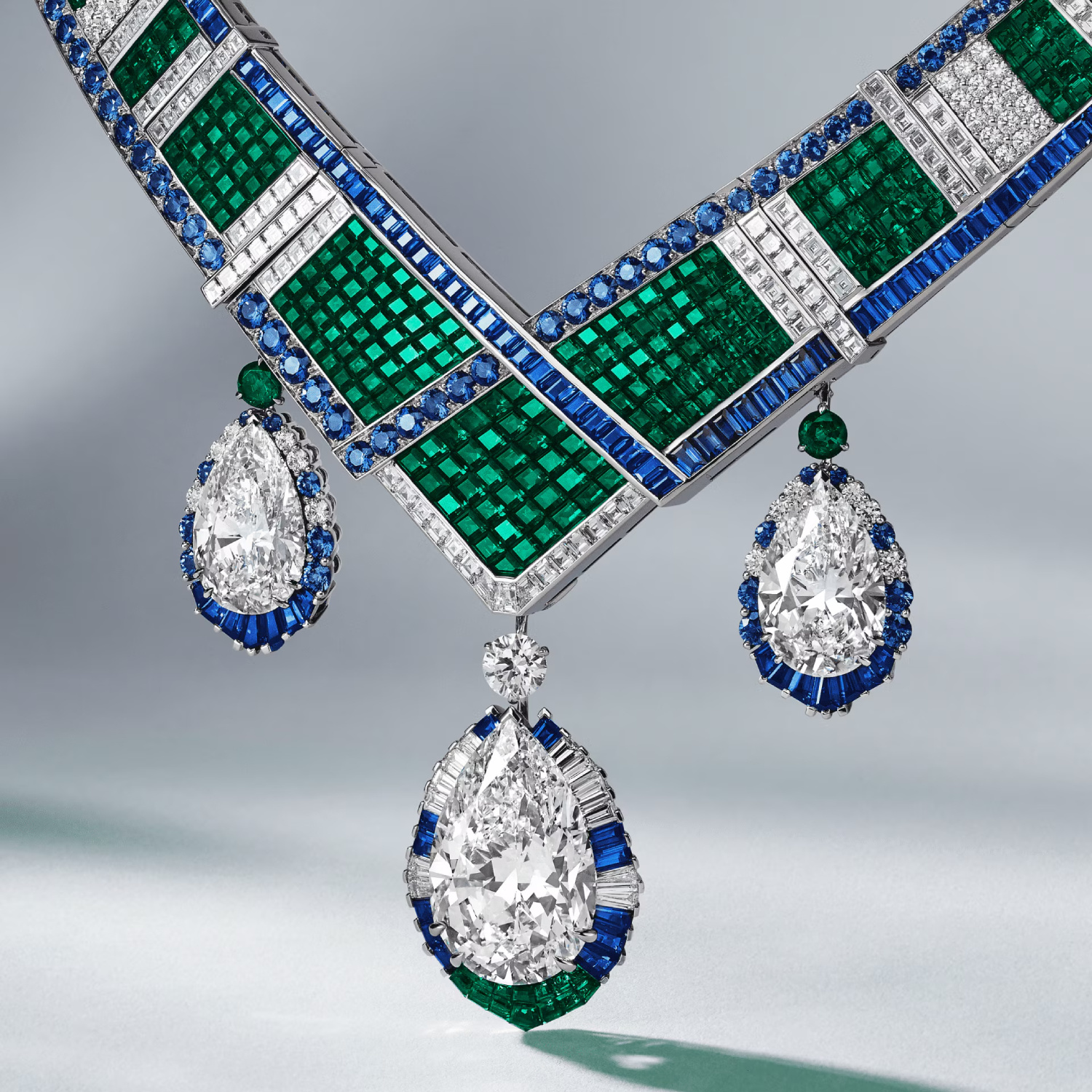 The design of this intricate necklace draws inspiration from the overlapping bodice of 1950s evening gowns. The collar section, crafted using the Mystery Set technique, forms an interlacing design of diamonds, emeralds, and sapphires. Each gemstone used in the Mystery Set is custom-cut to ensure perfect color and shape matching.