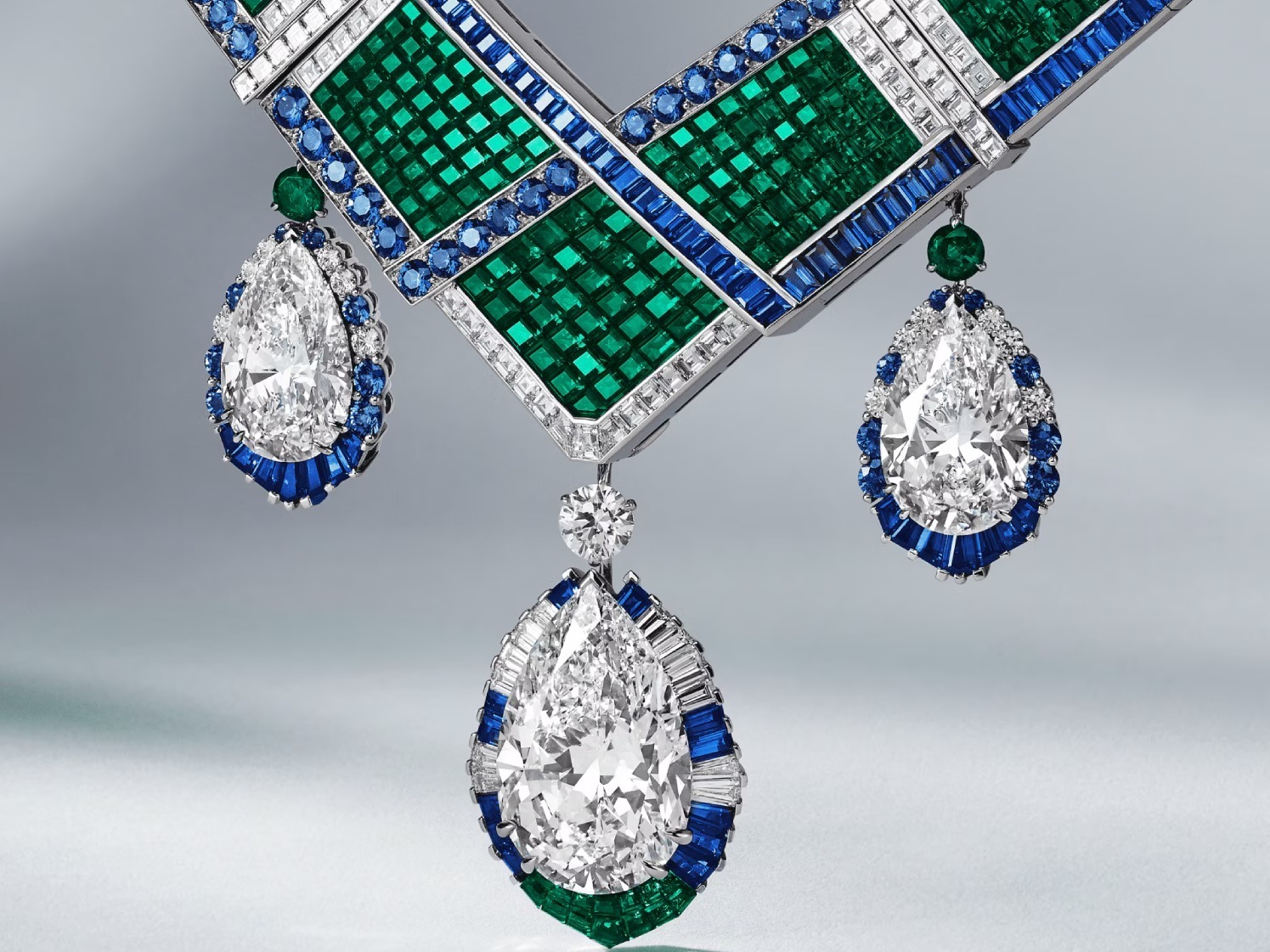 The design of this intricate necklace draws inspiration from the overlapping bodice of 1950s evening gowns. The collar section, crafted using the Mystery Set technique, forms an interlacing design of diamonds, emeralds, and sapphires. Each gemstone used in the Mystery Set is custom-cut to ensure perfect color and shape matching.
