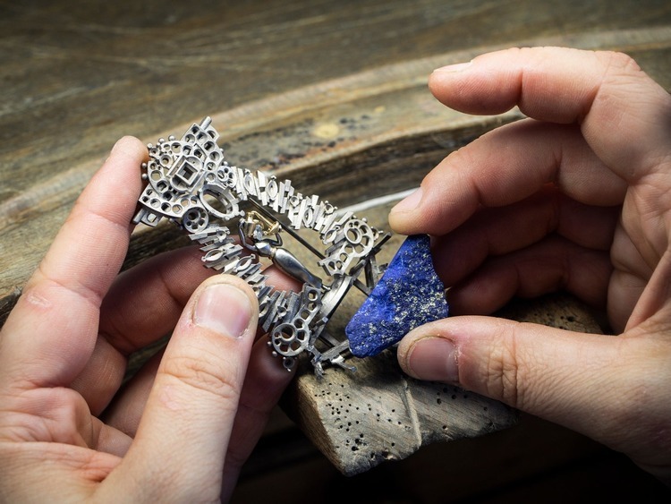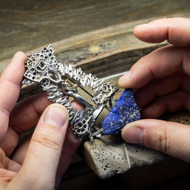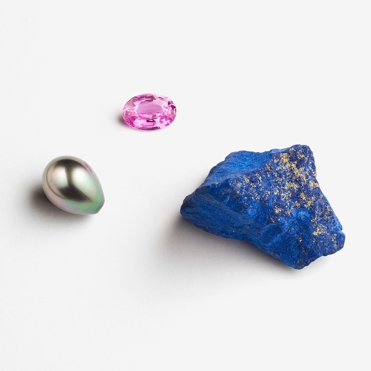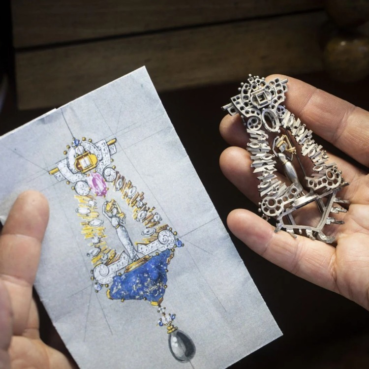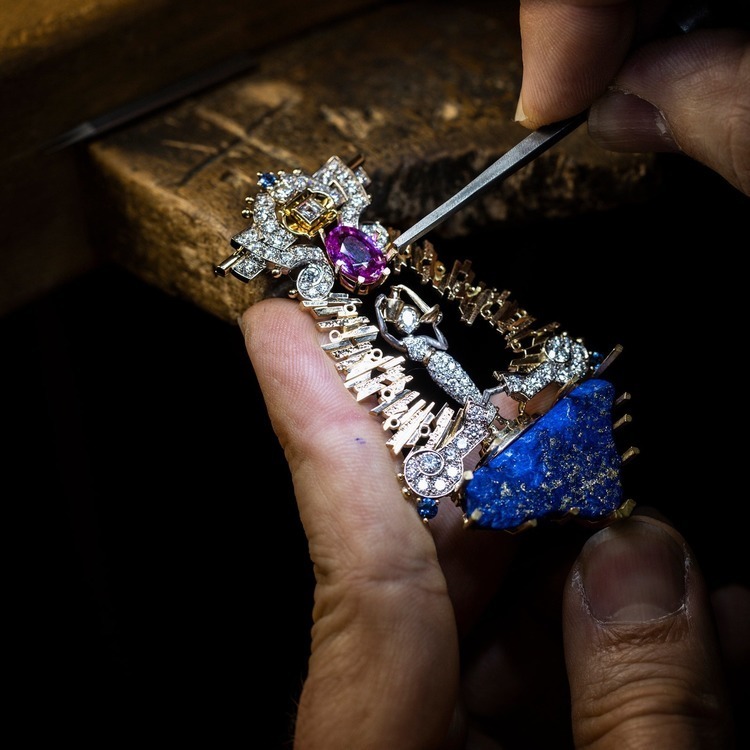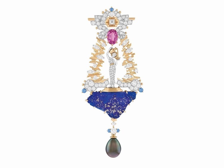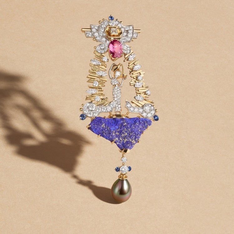 A 3.47-carat Madagascar pink sapphire appears suspended above the garden motif, radiating a sweet, luminous glow. The base is adorned with symmetrical white gold scrollwork. The goddess stands upon a deep blue lapis lazuli, while a grey pearl dangling beneath the brooch provides an exquisite finishing touch.